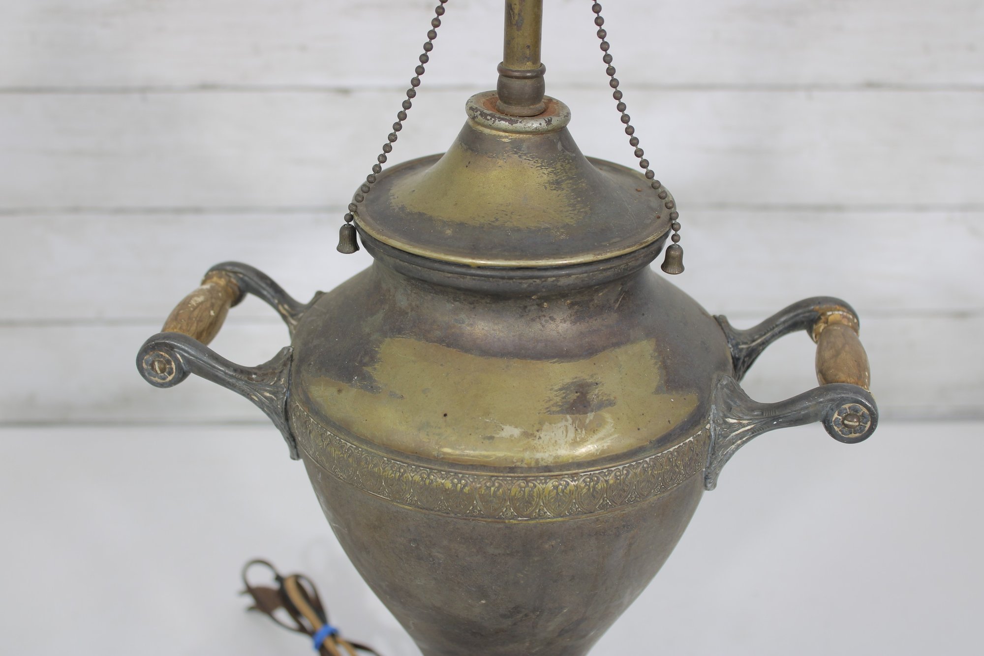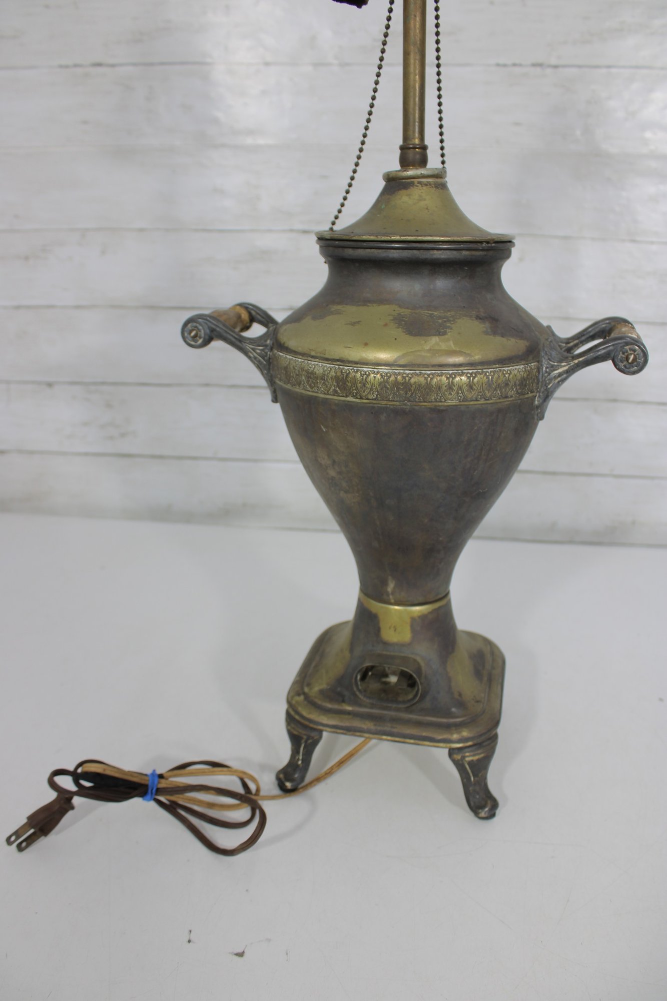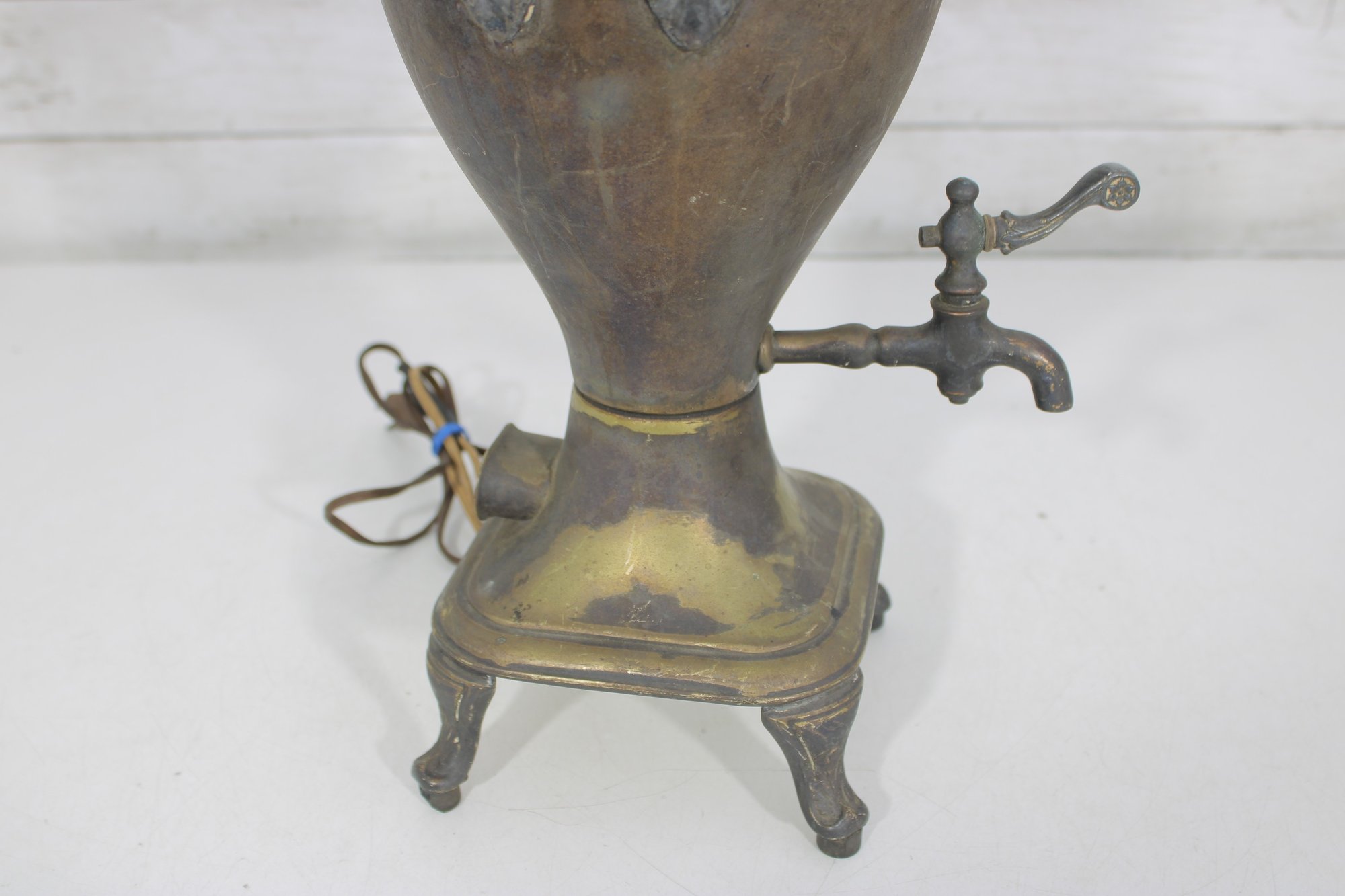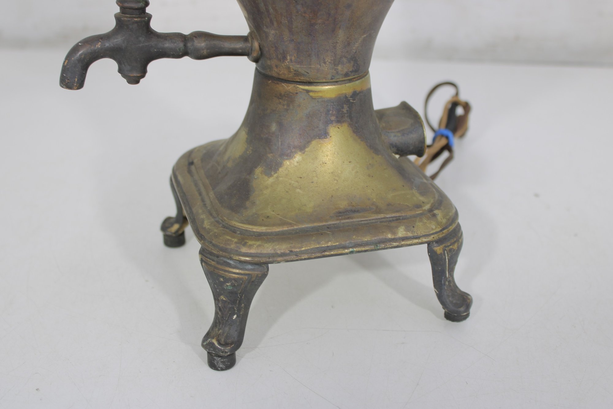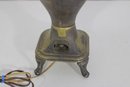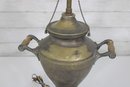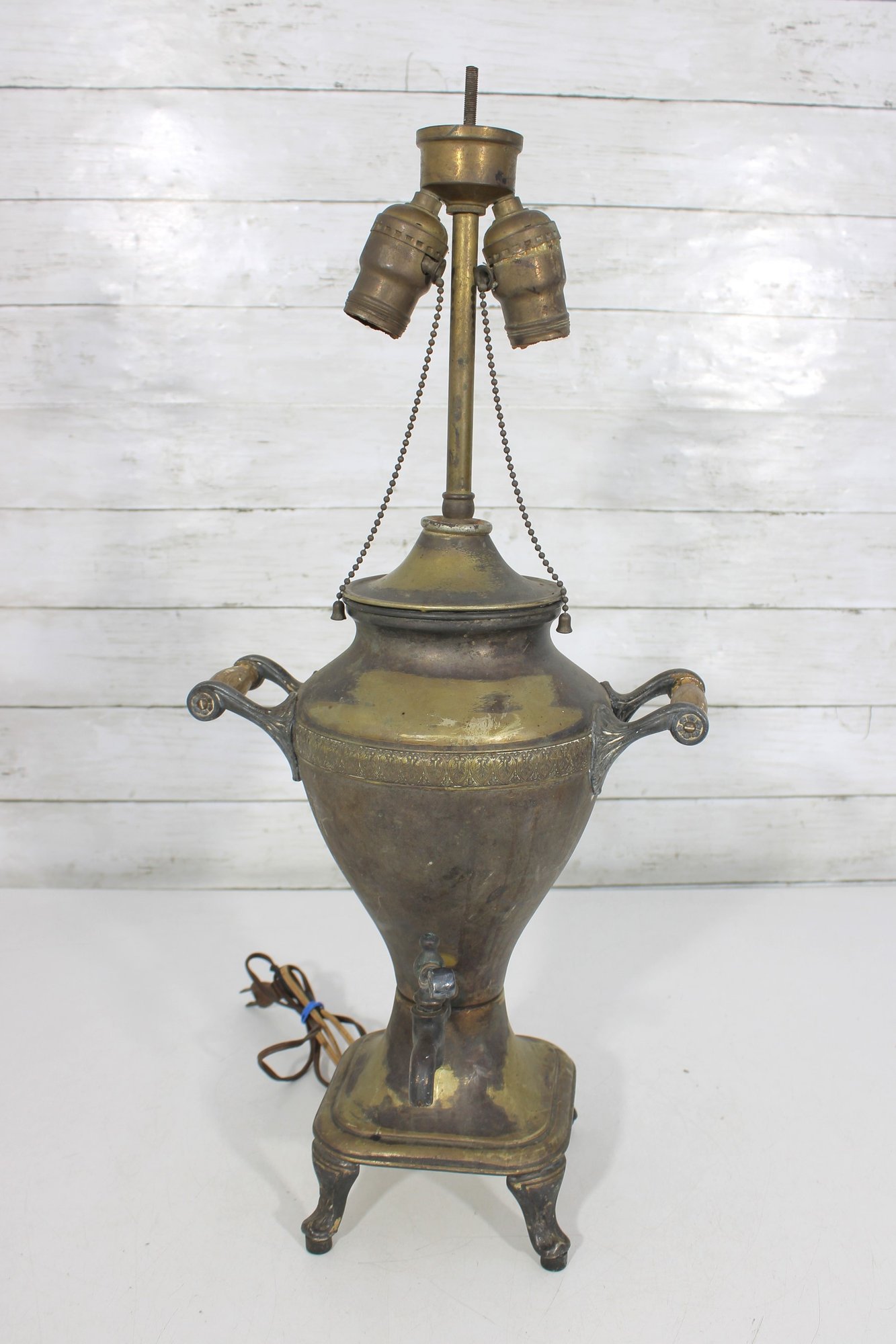 Unique vintage brass table lamp designed in the form of a classic samovar urn, featuring decorative handles, ornate feet, and a charming faucet-style detail. The aged brass finish gives this piece rich character and old-world appeal, making it a striking accent for traditional, eclectic, or vintage-inspired interiors.