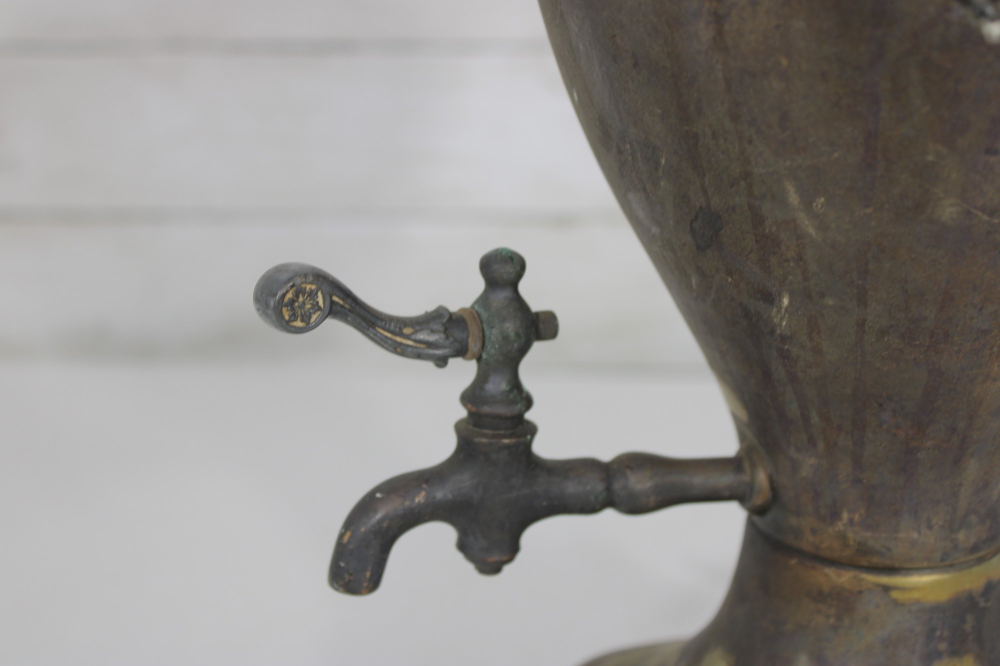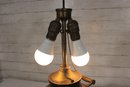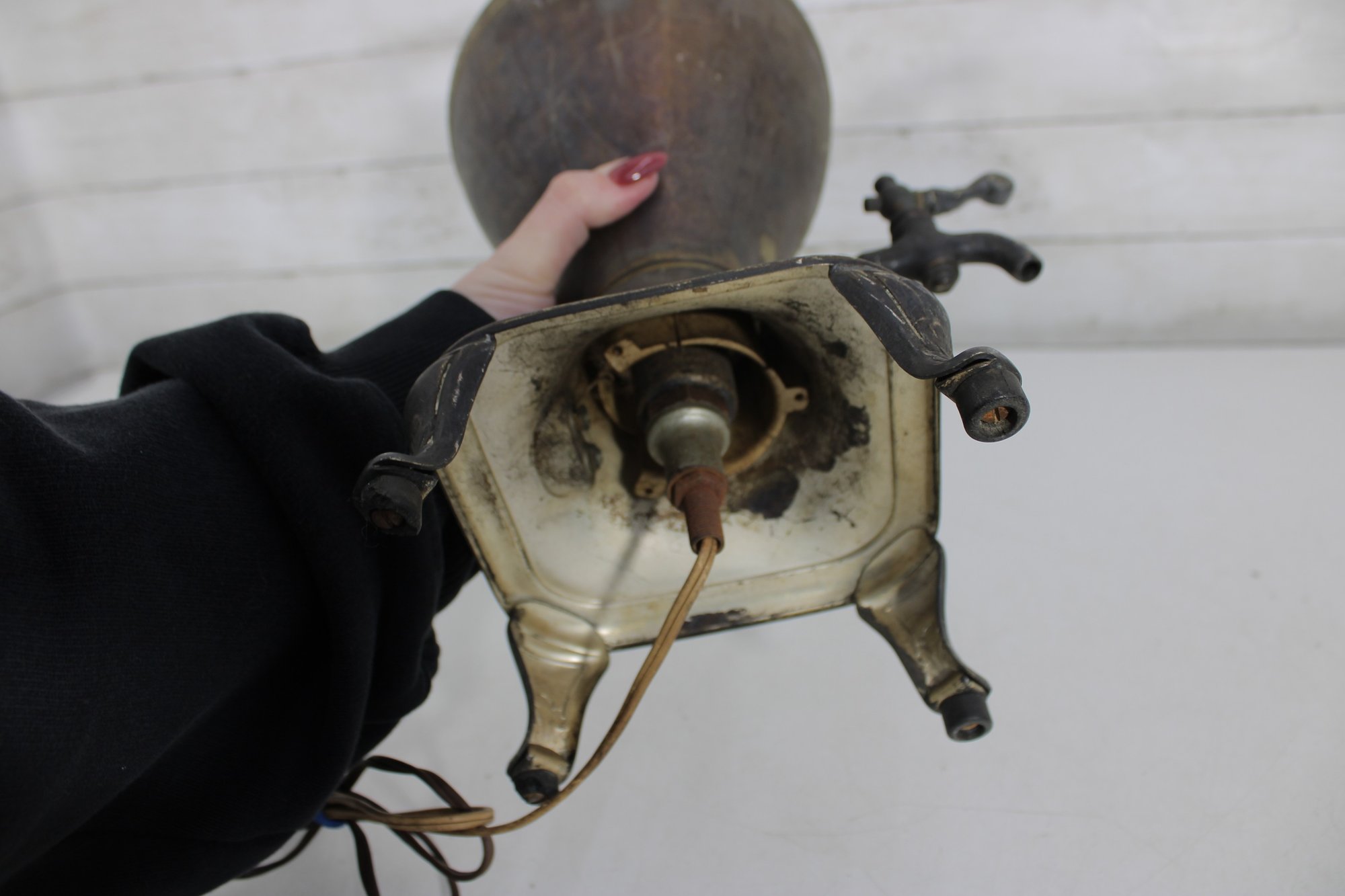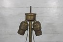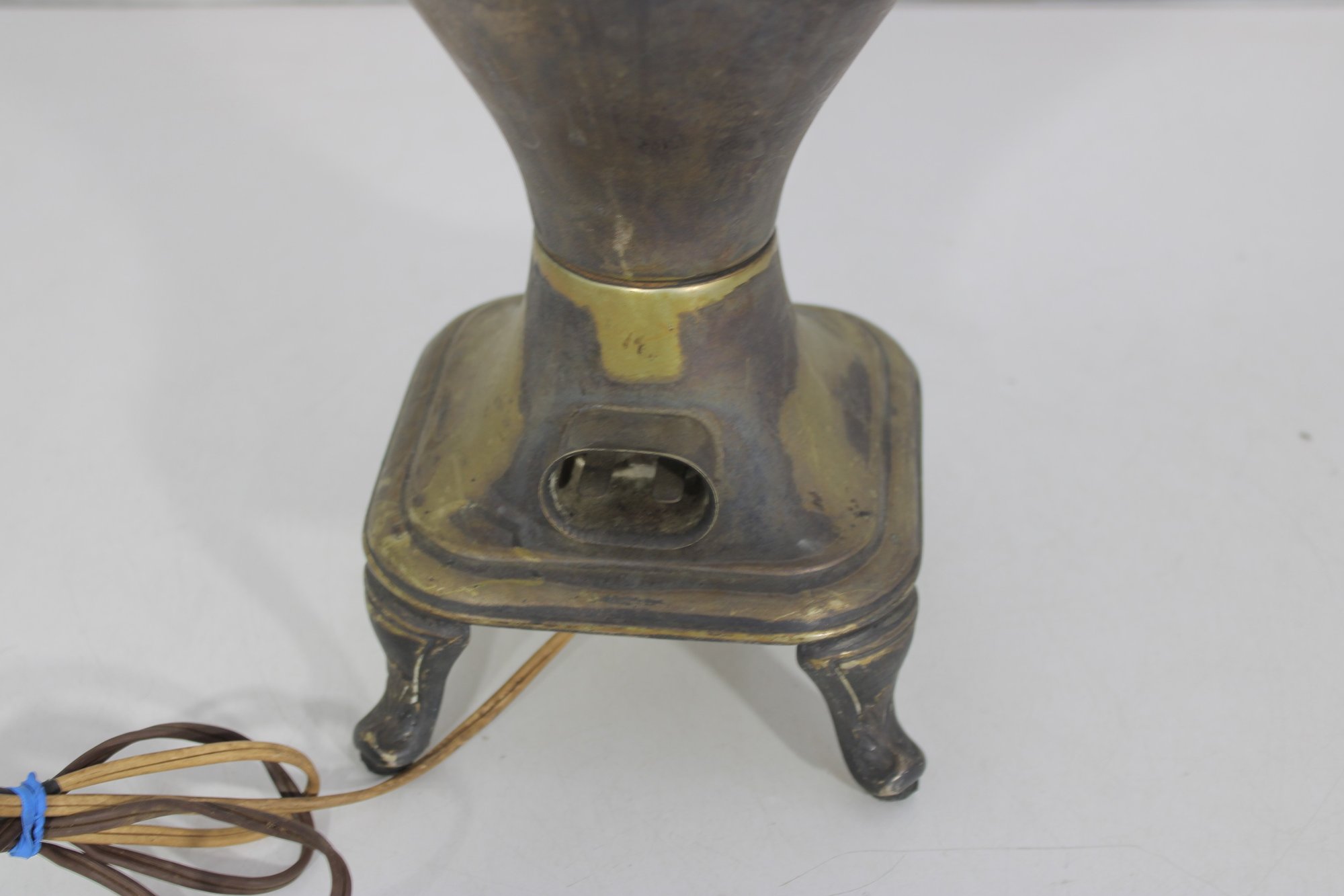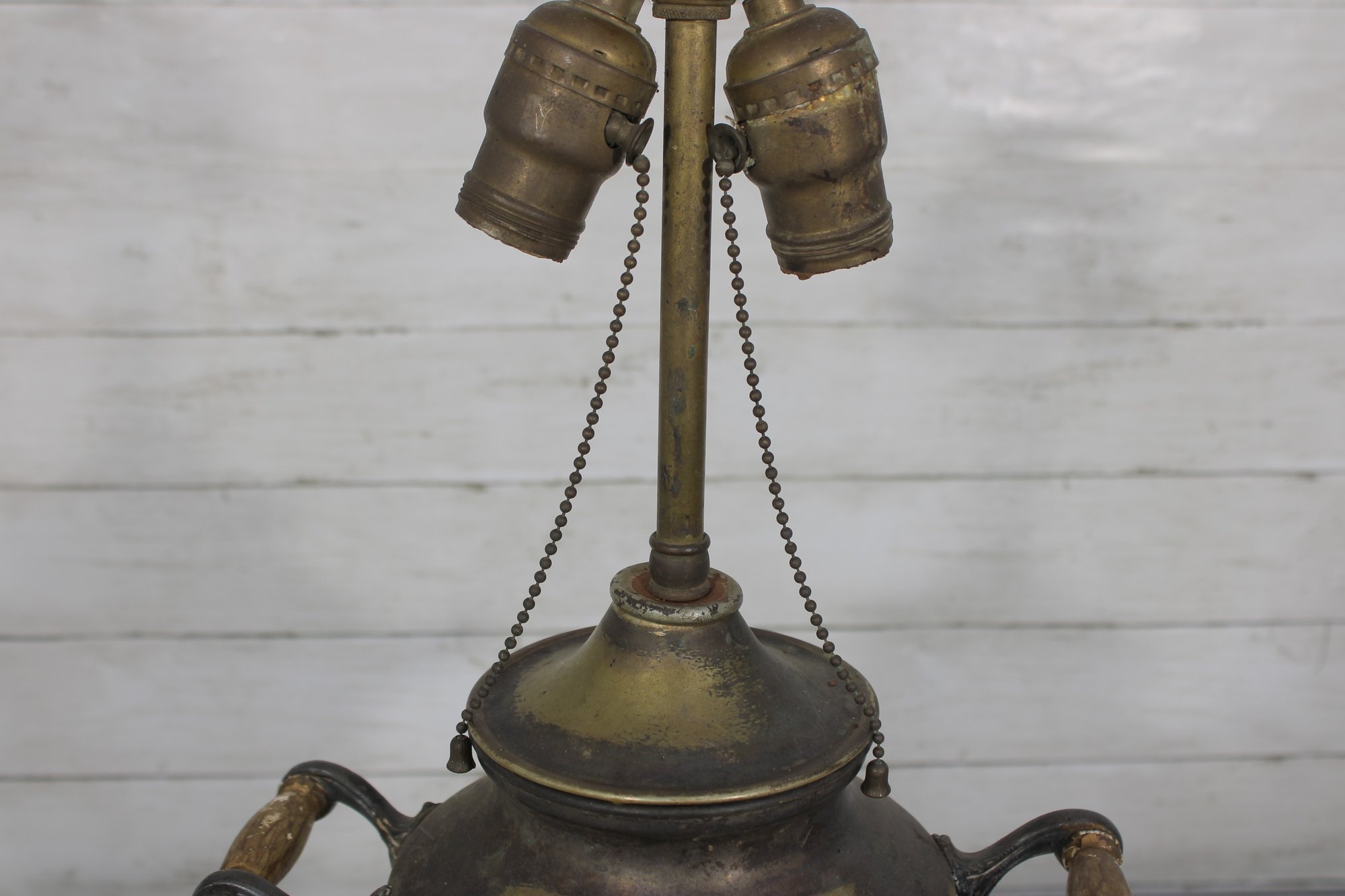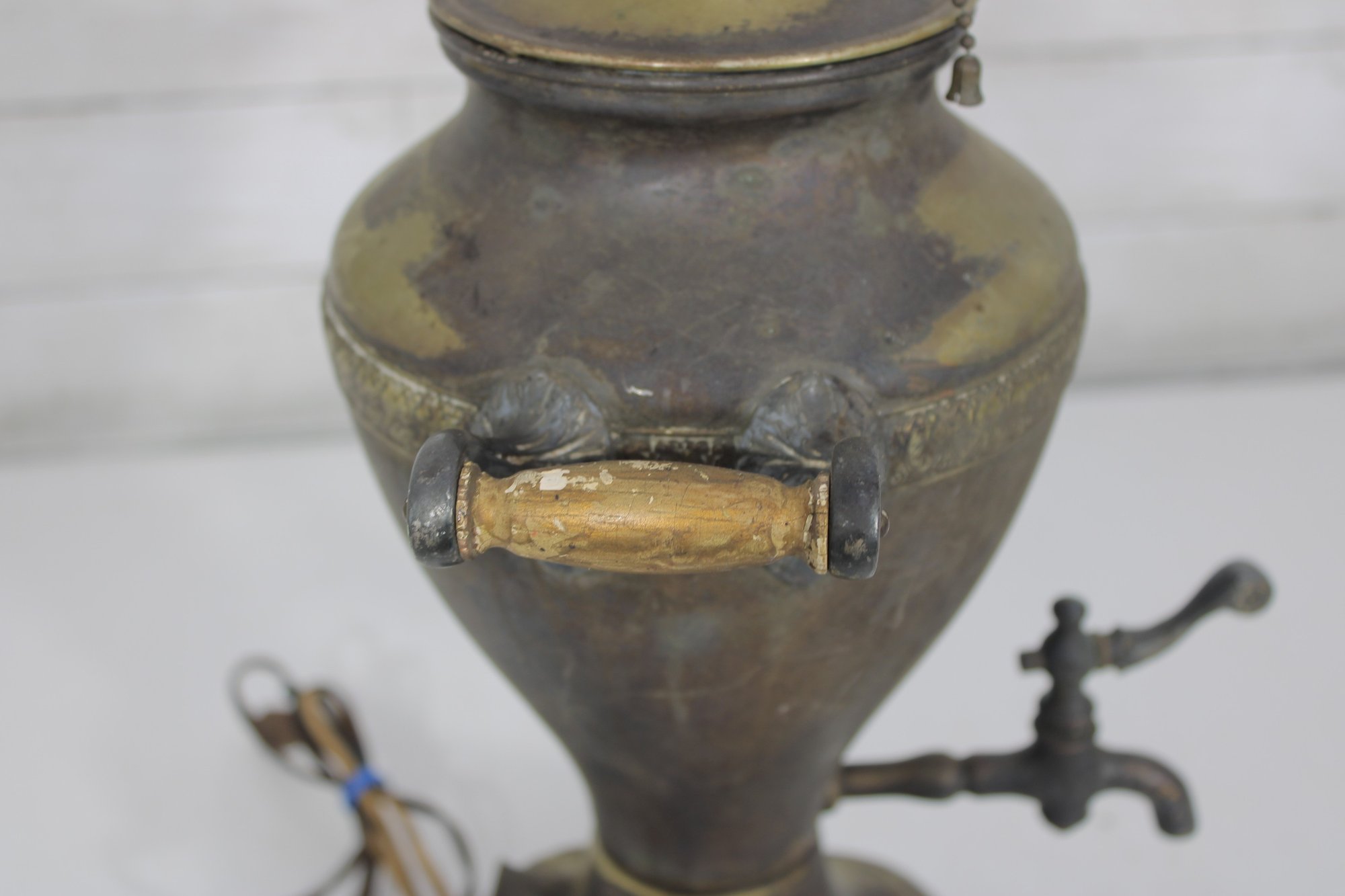 Unique vintage brass table lamp designed in the form of a classic samovar urn, featuring decorative handles, ornate feet, and a charming faucet-style detail. The aged brass finish gives this piece rich character and old-world appeal, making it a striking accent for traditional, eclectic, or vintage-inspired interiors.
