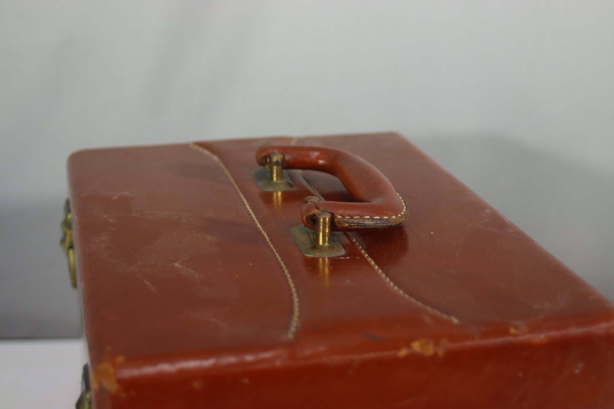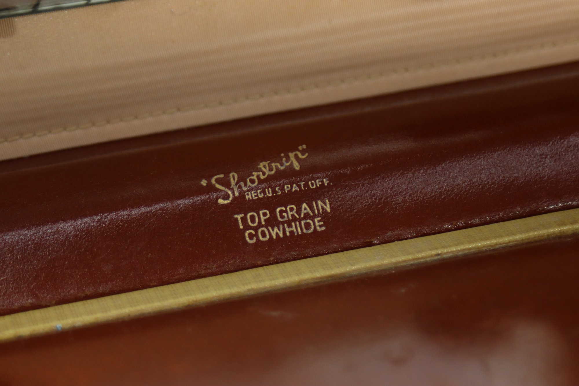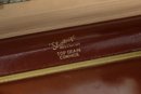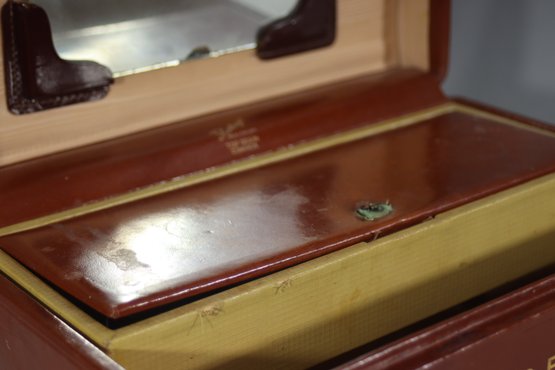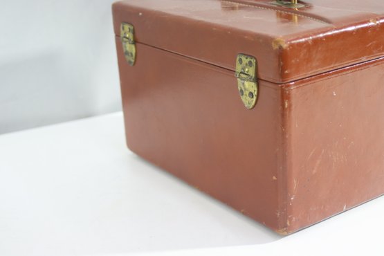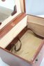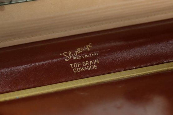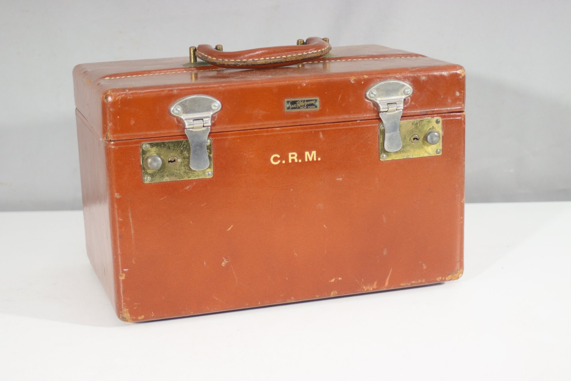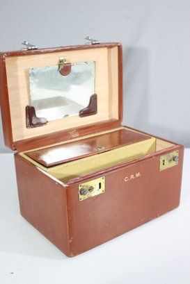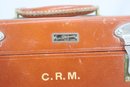 This vintage Samsonite Shwayder Bros. train case is a beautifully crafted piece made of top grain cowhide leather. It features a classic brown exterior with brass hardware and a sturdy leather handle. The case is personalized with the initials "C.R.M." and showcases an interior mirror, a removable tray, and original key.