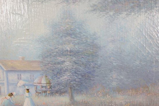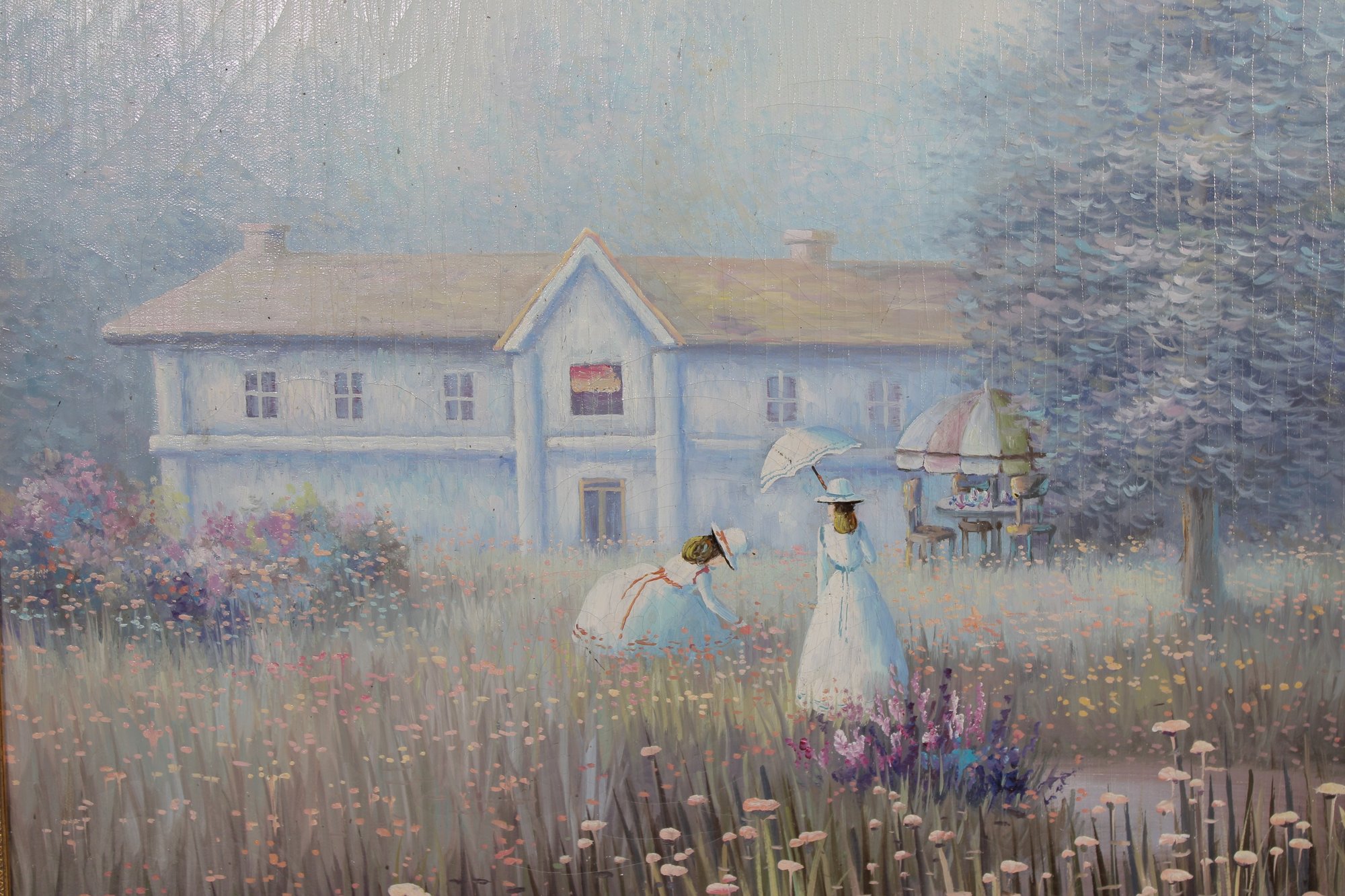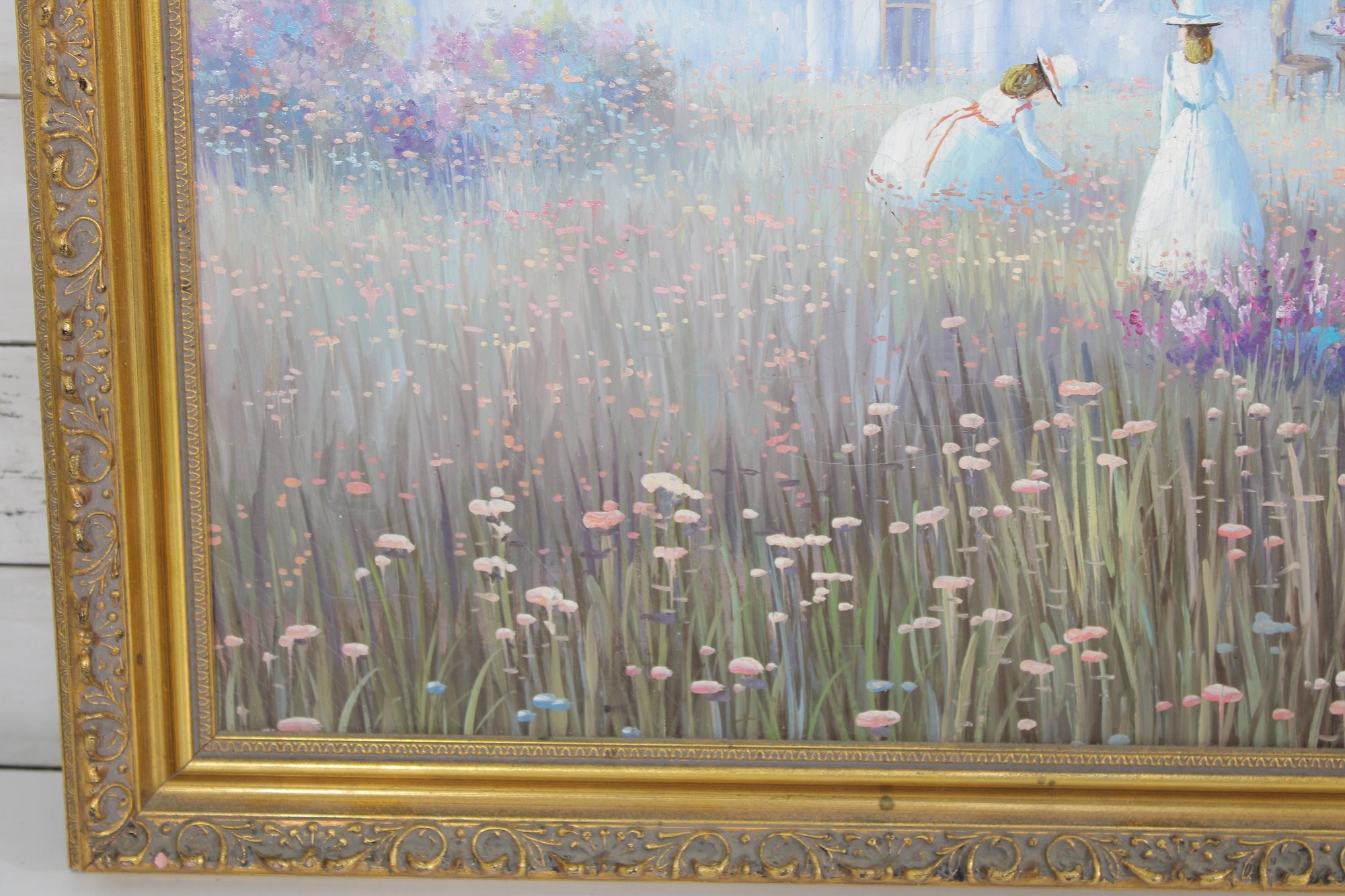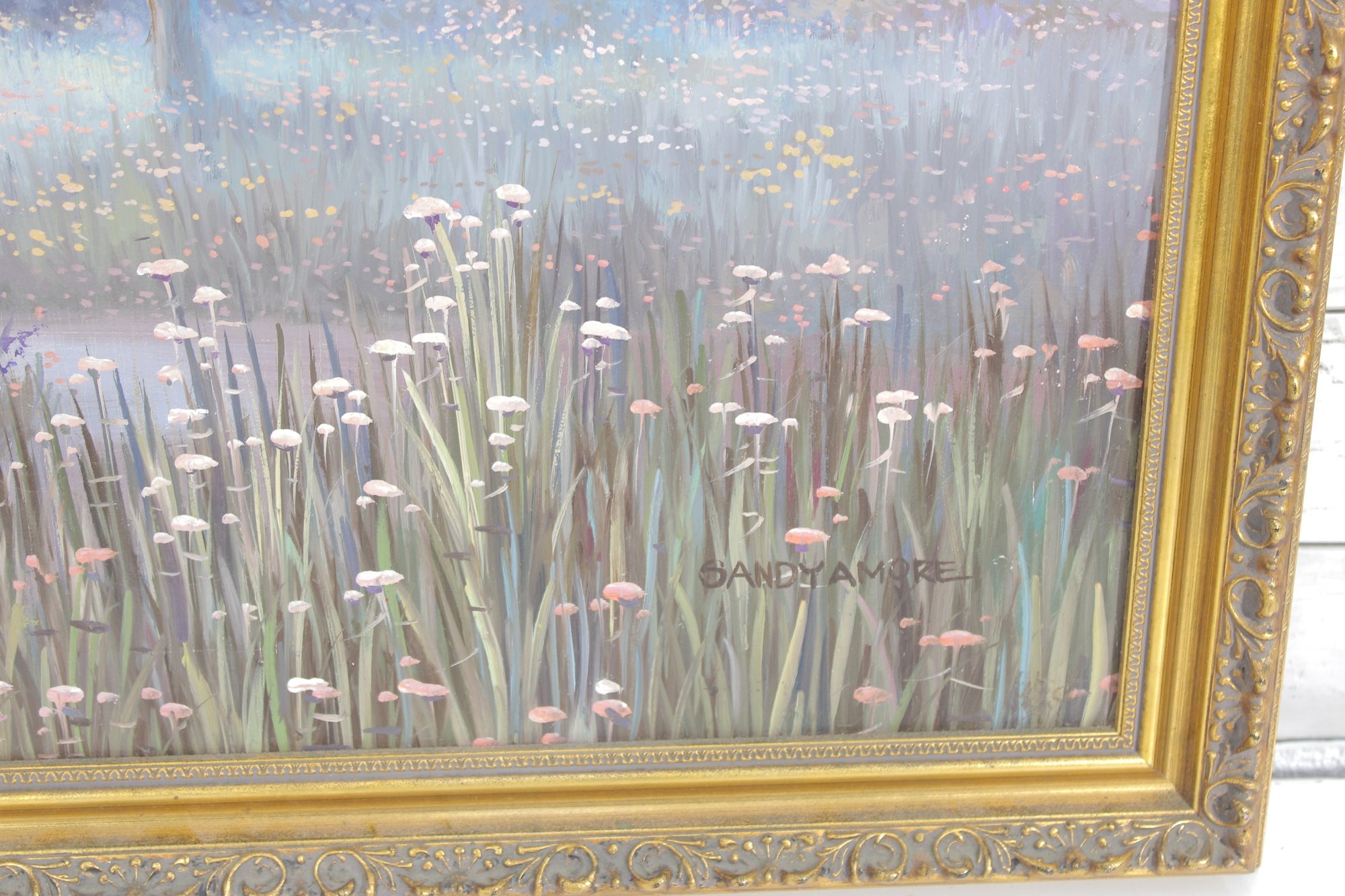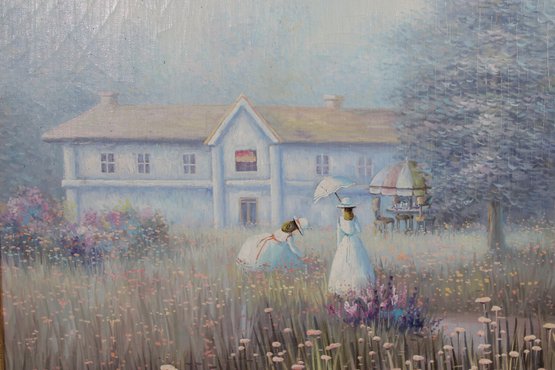 a beautiful vintage framed painting signed Sandyamore, featuring a soft, romantic cottage garden scene. The artwork depicts two figures in flowing dresses walking through a field of wildflowers, with a charming country home in the background.