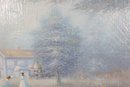Executed in a gentle pastel palette of blues, greens, pinks, and creams, the painting has an impressionistic, dreamy quality. The textured surface adds depth and visual interest, enhancing the serene countryside setting.