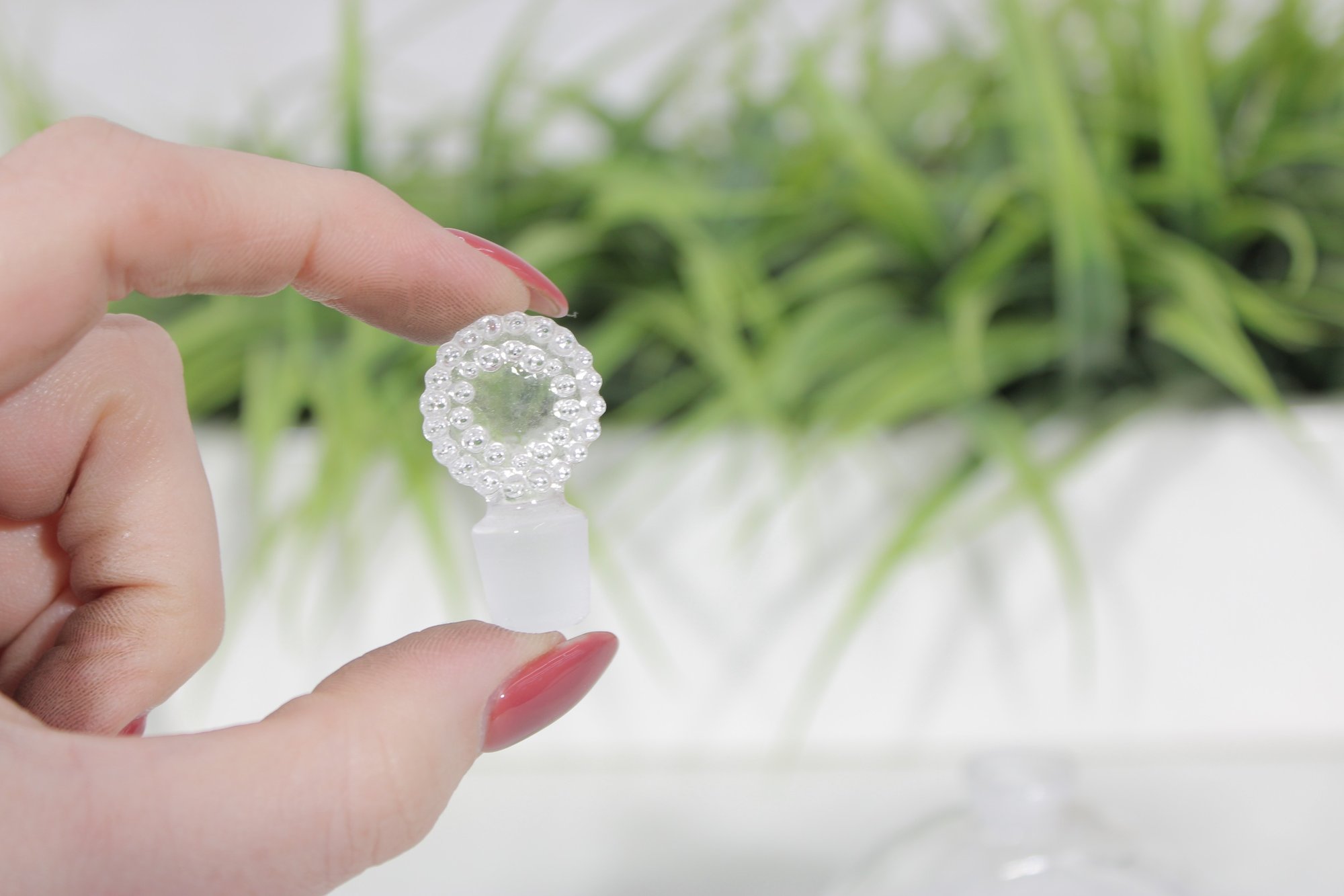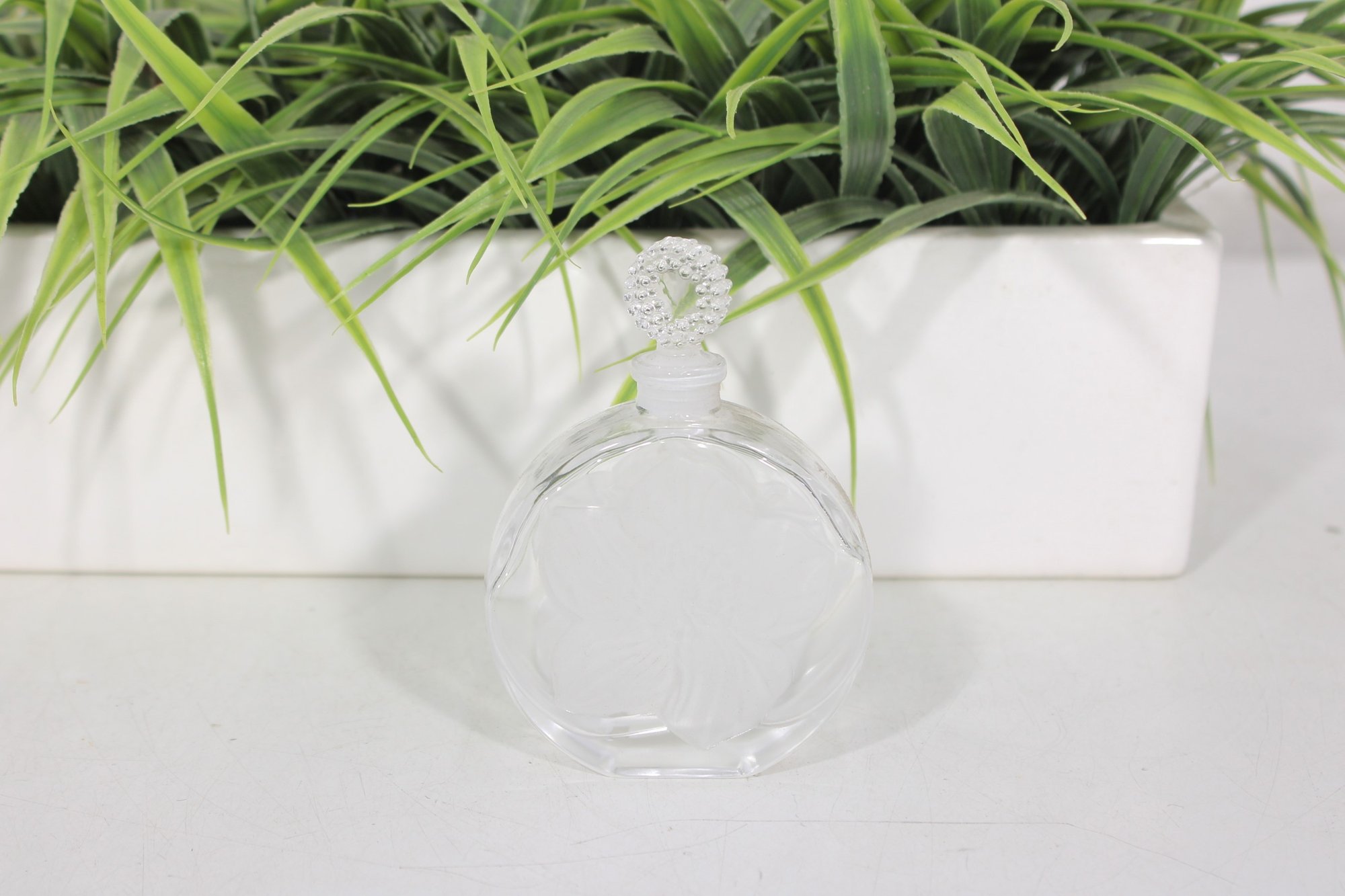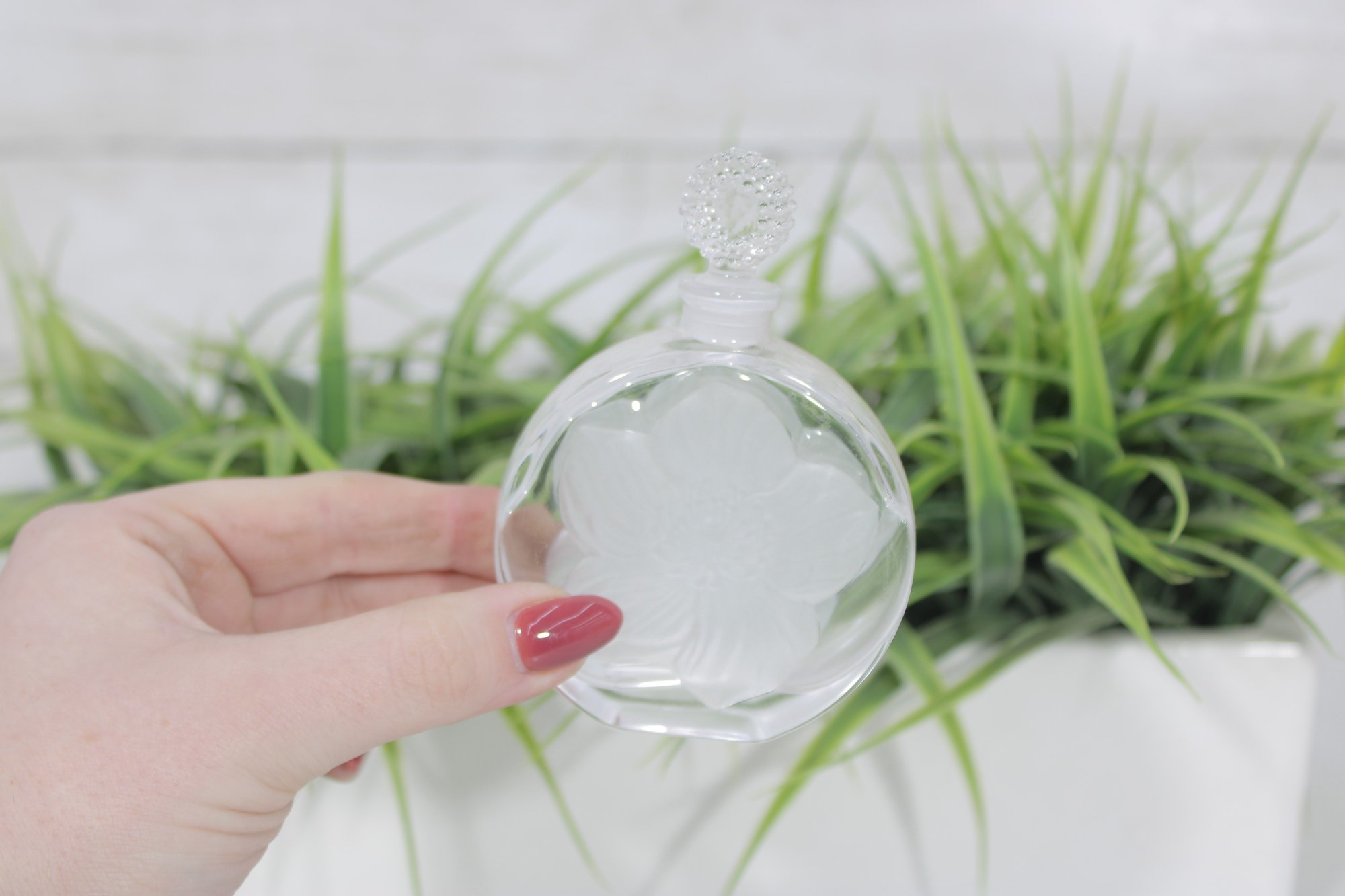 This delicate piece showcases a soft frosted glass body shaped like a stylized flower, complemented by a beautifully textured circular stopper with raised beaded detailing. The underside retains the original Sasaki label.