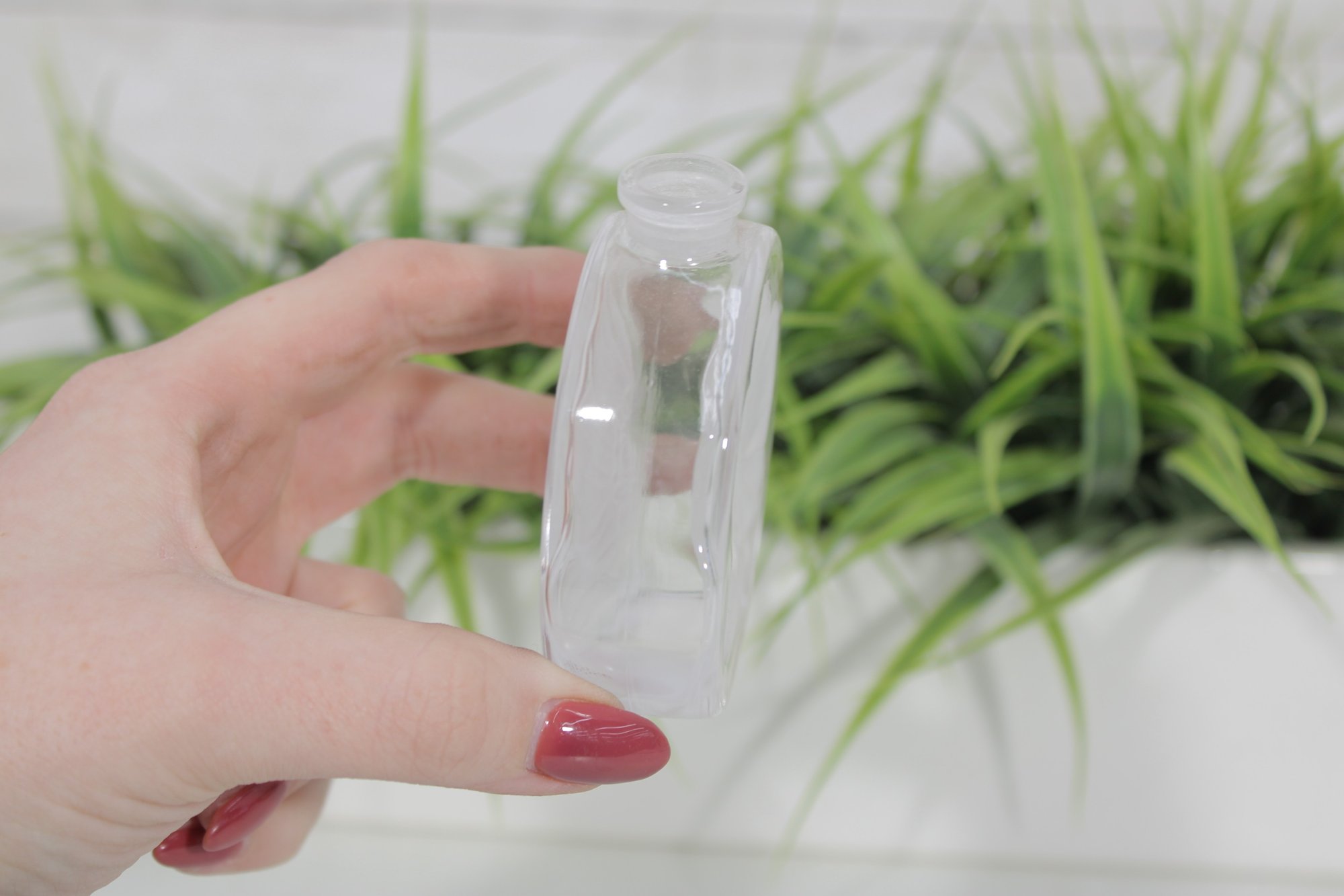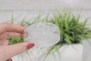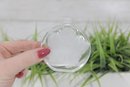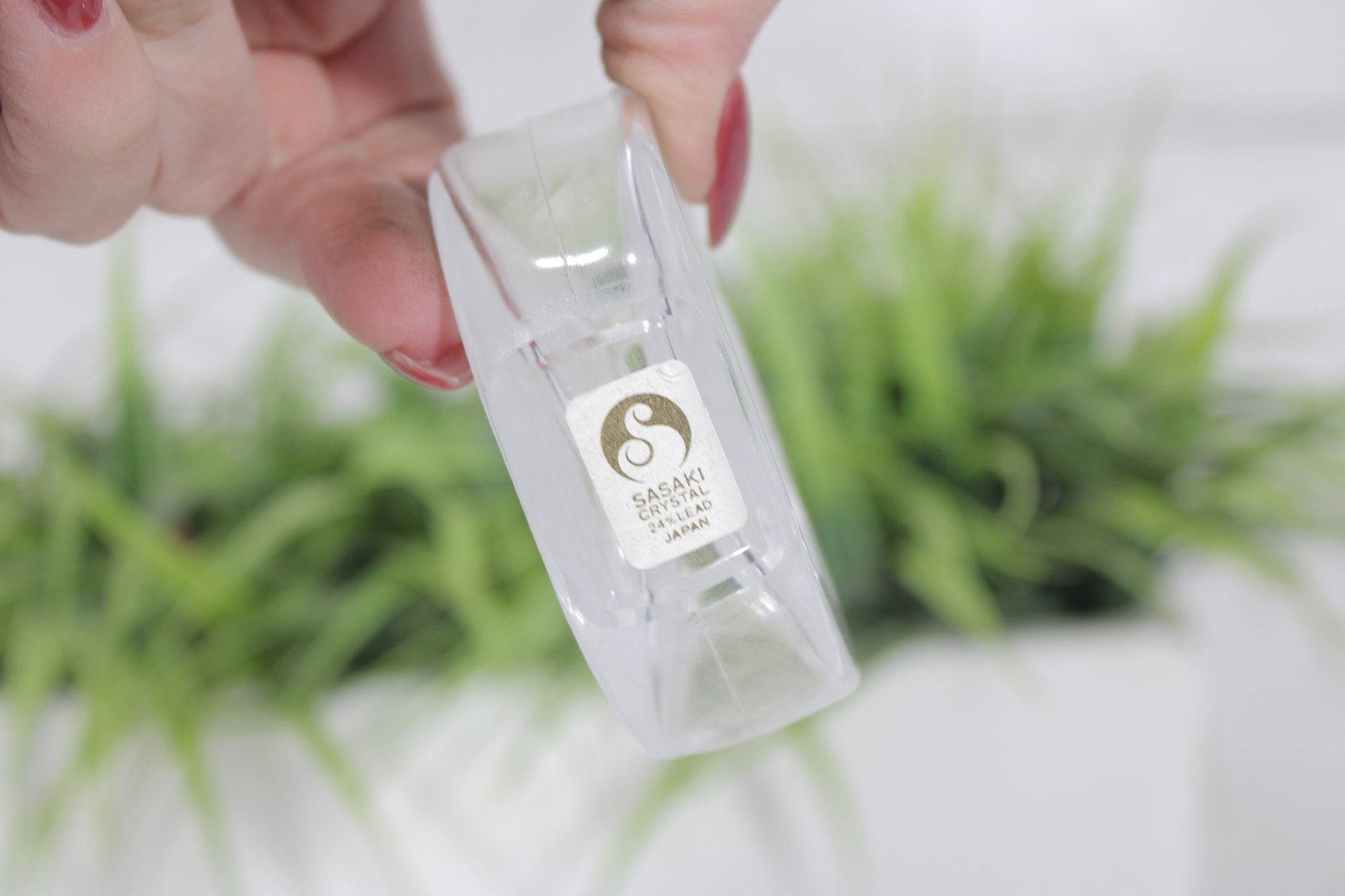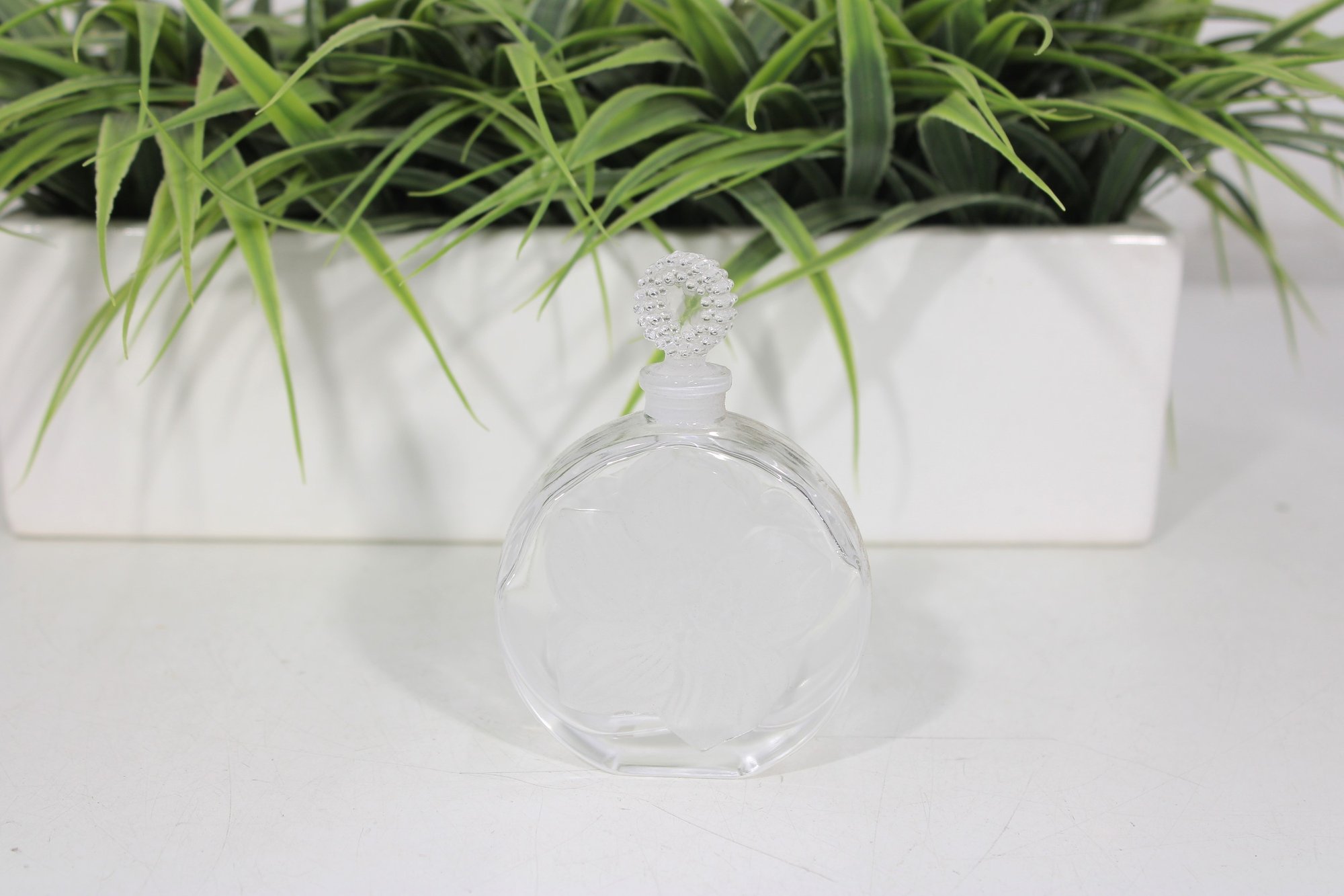 This delicate piece showcases a soft frosted glass body shaped like a stylized flower, complemented by a beautifully textured circular stopper with raised beaded detailing. The underside retains the original Sasaki label.