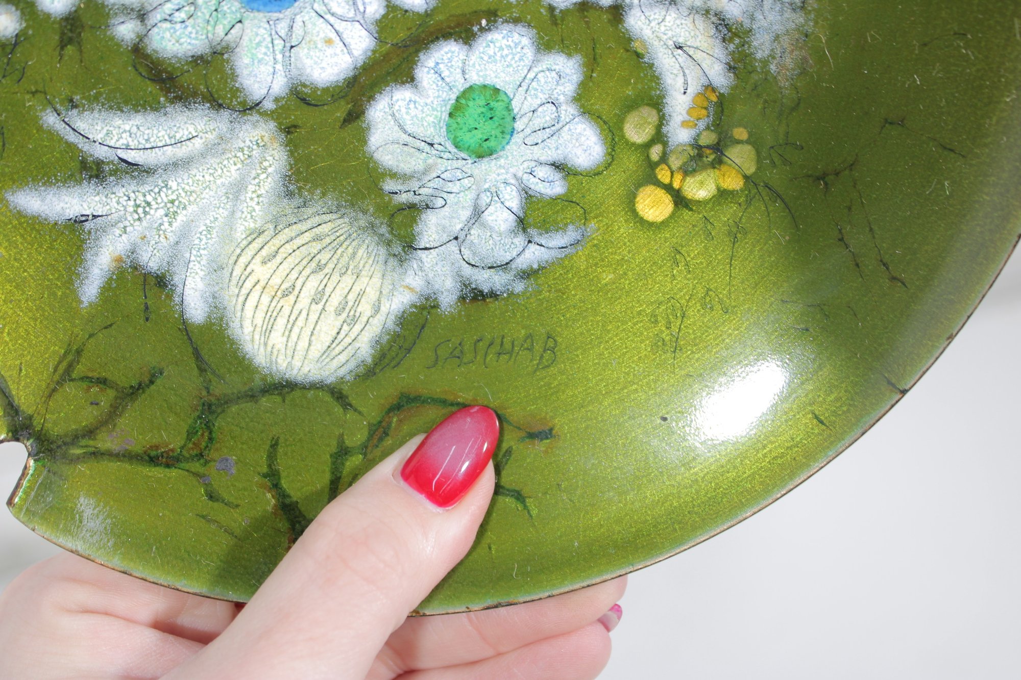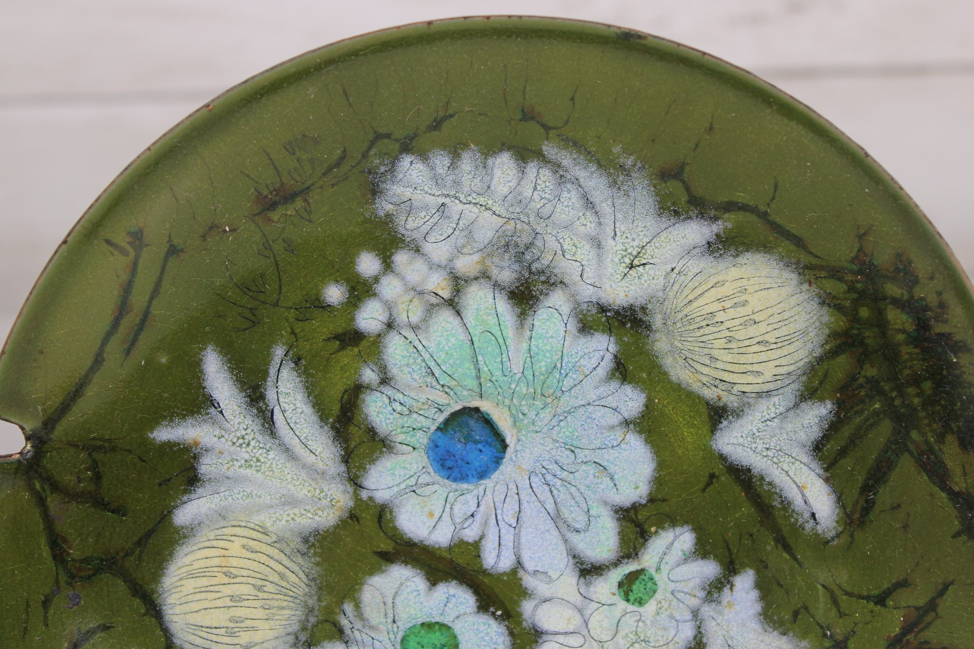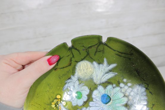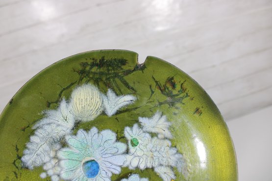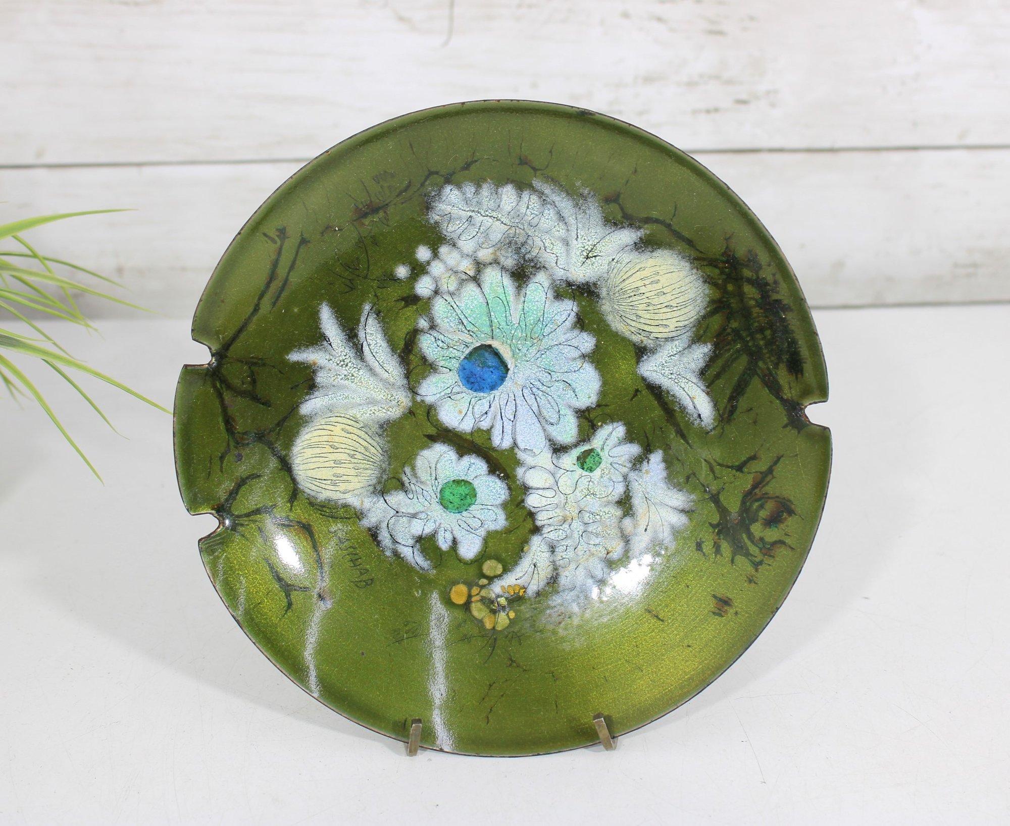 a beautiful vintage mid-century modern enamel on copper ashtray by Sascha Brastoff. This piece features an elegant floral motif in soft white, blue, and cream tones set against a rich olive green background, accented with delicate branch-like detailing.