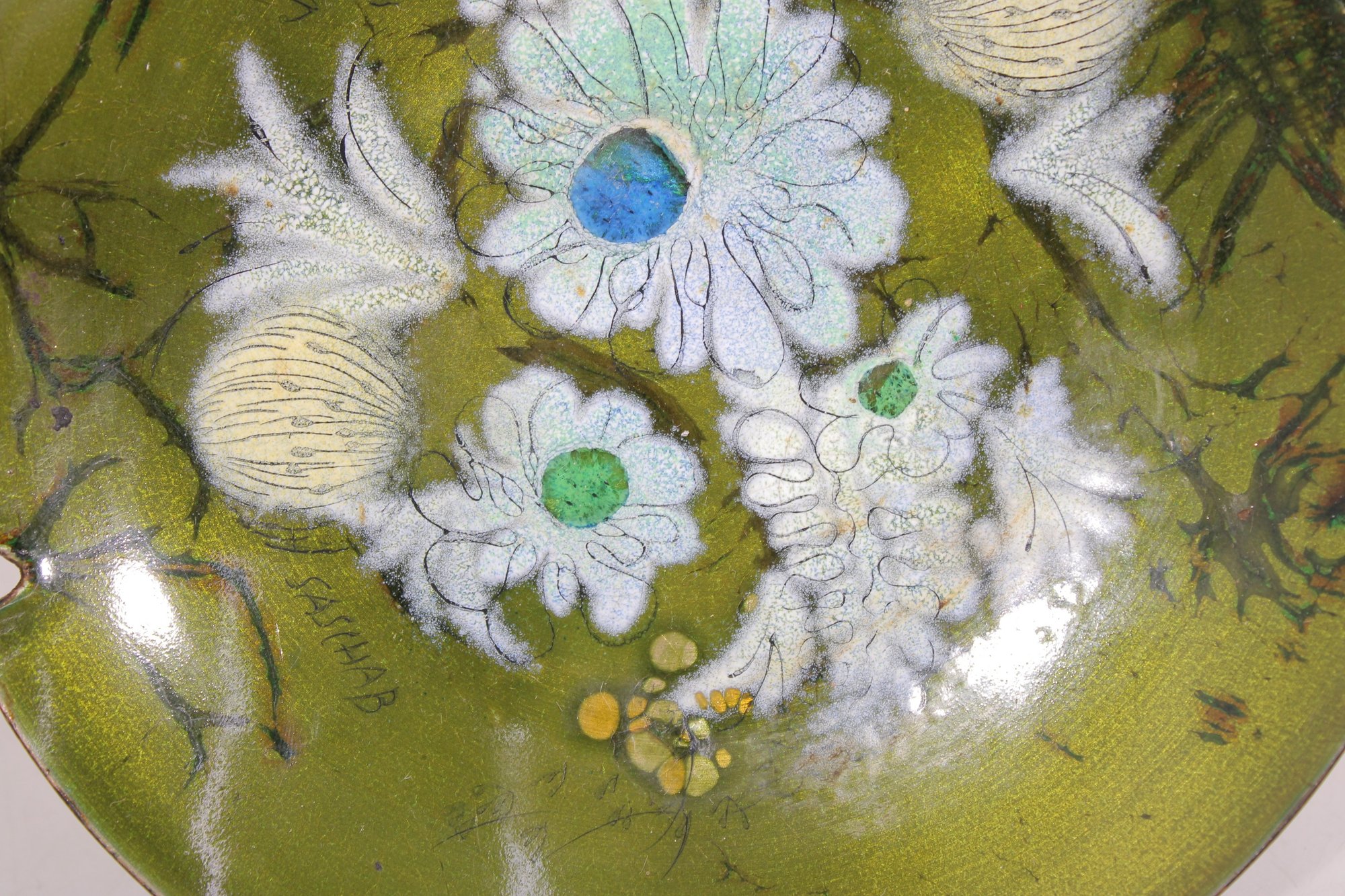 The design showcases Brastoff’s signature style—organic forms, fine linework, and a luminous enamel finish that adds depth and texture. The ashtray form includes notched edges for cigarette rests, while still functioning as a striking decorative bowl or display piece. The front is signed “Sascha B,” confirming authenticity.