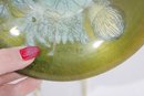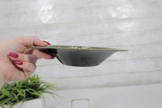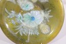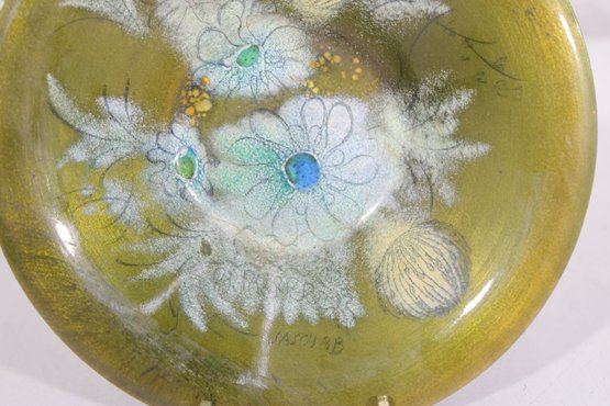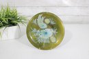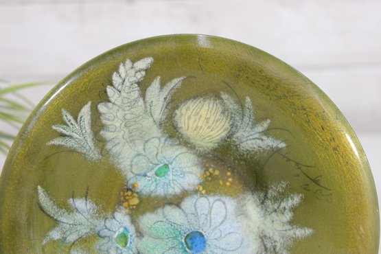 Beautiful vintage Sascha Brastoff enamel on copper bowl, featuring a soft and elegant floral design in delicate tones of white, blue, and green set against a warm olive-green background. The painterly composition and subtle textures reflect Brastoff’s signature mid-century modern aesthetic.