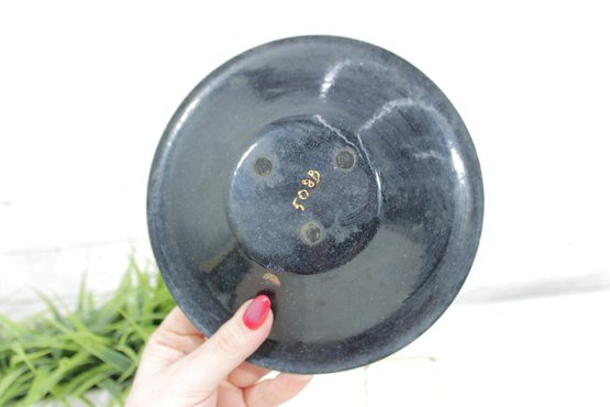 Measuring approximately 7” in diameter, this shallow bowl has a gently curved form with a glossy enamel finish that enhances the layered colors and fine detailing.