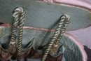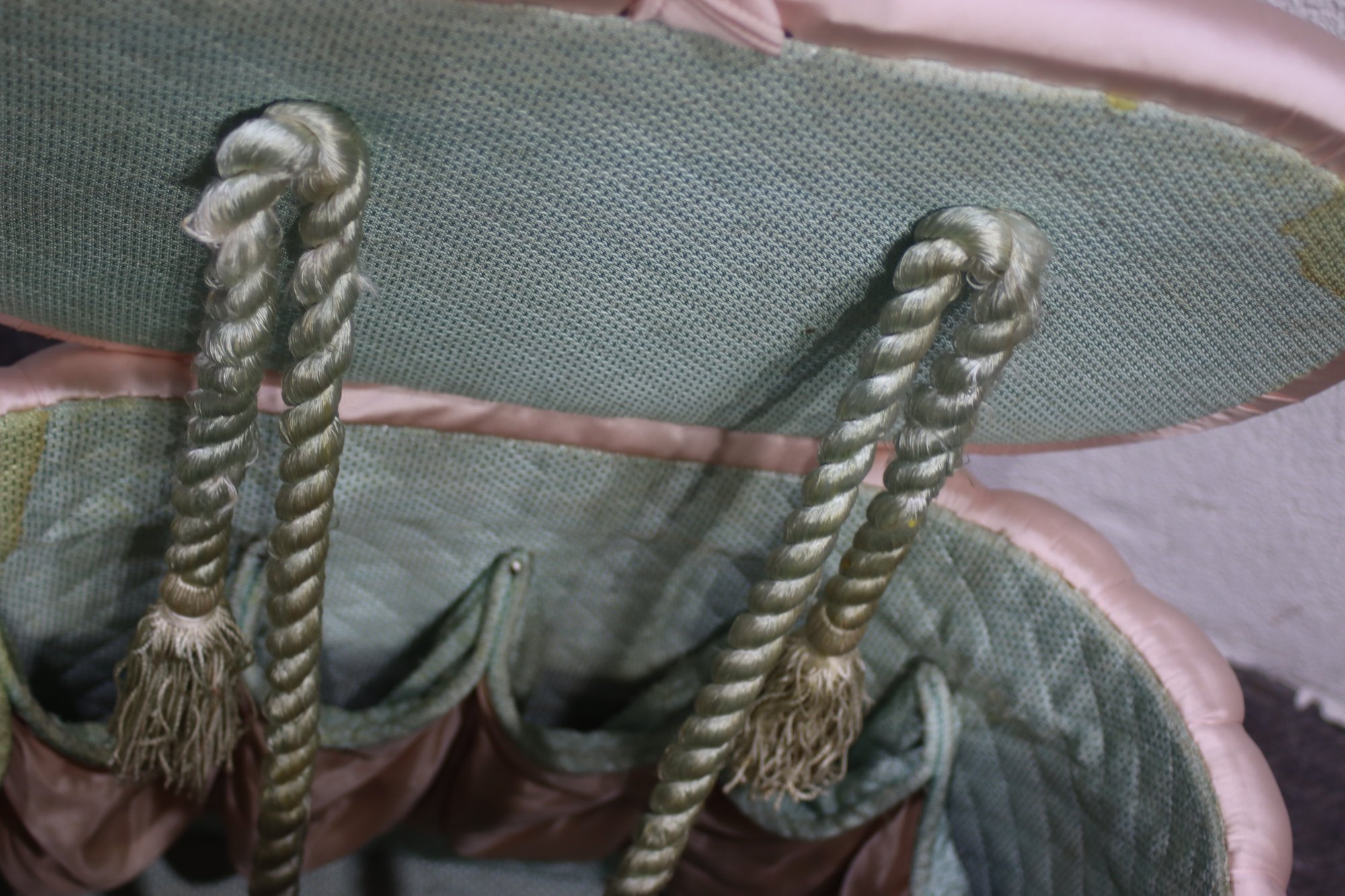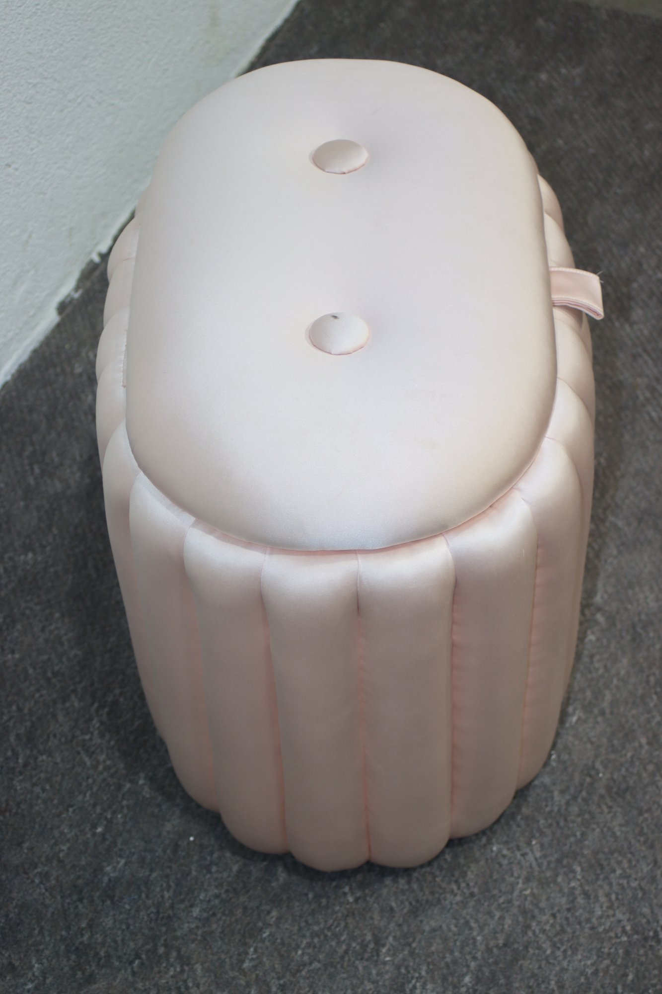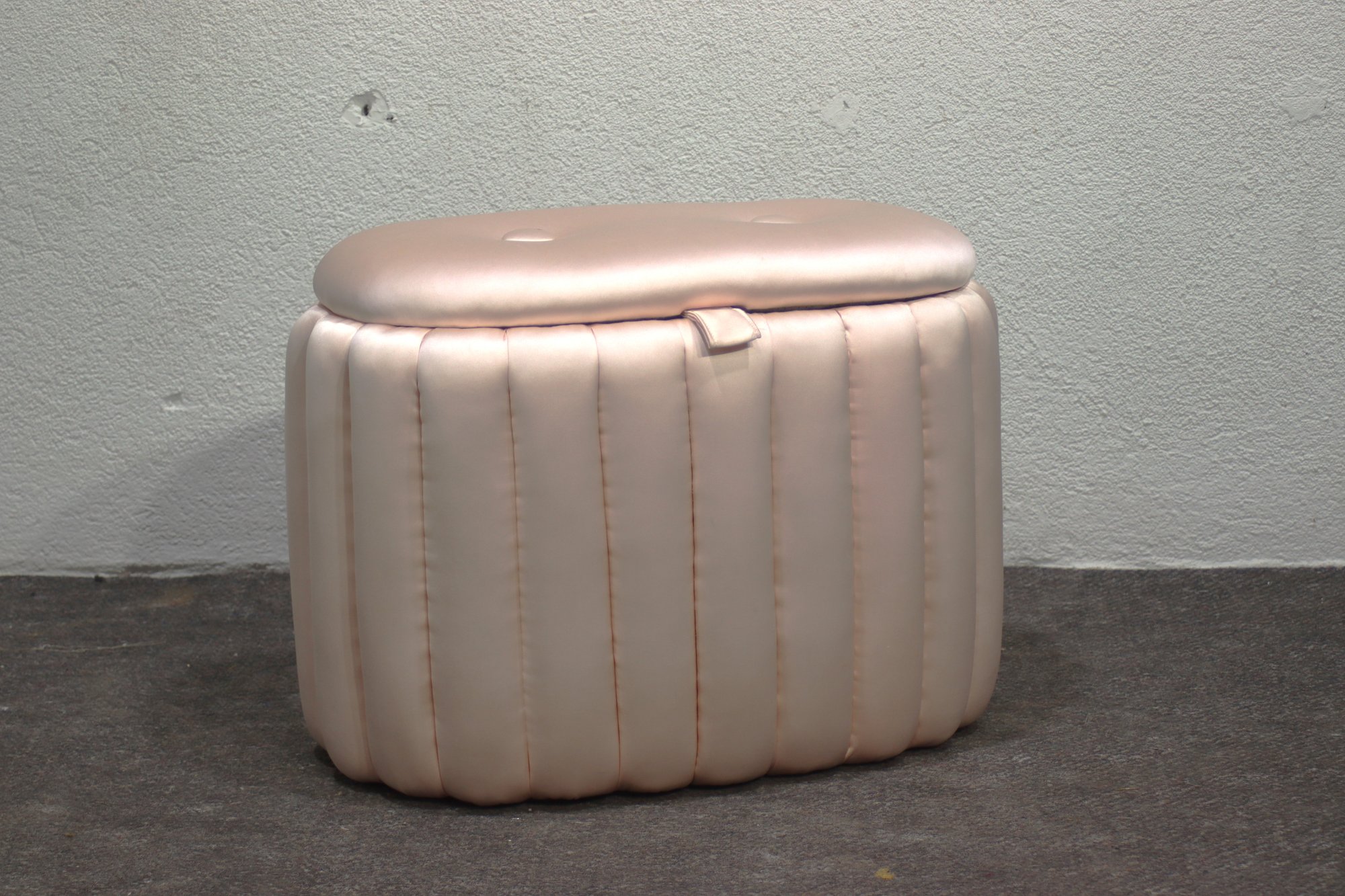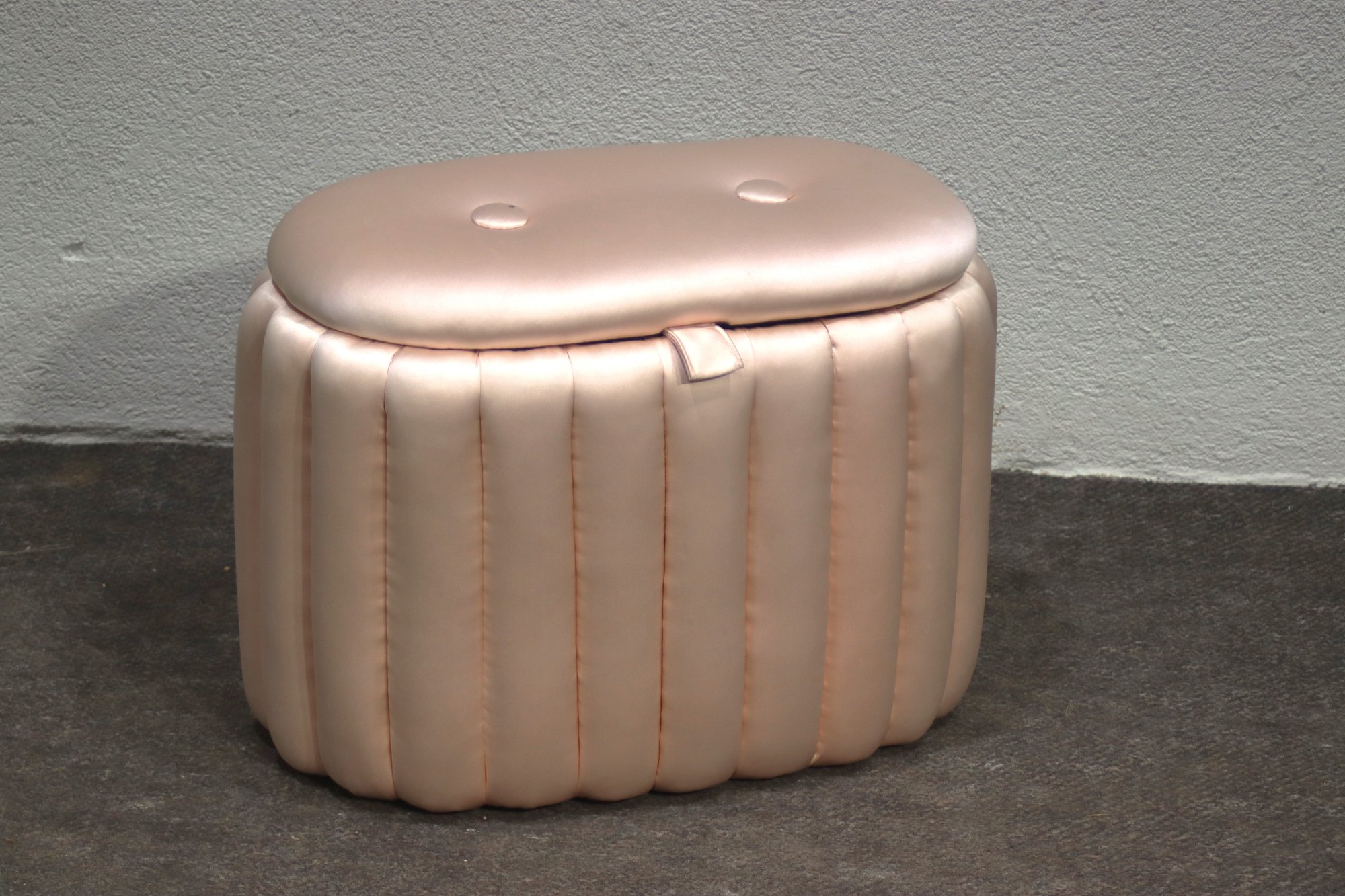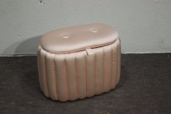 Add a touch of vintage charm to your home with this mid-century satin pink quilted sewing storage ottoman. Featuring a plush, padded exterior, this unique piece combines functionality with elegant retro style. The soft pink satin fabric gives it a luxurious look, while the interior provides convenient storage for sewing accessories, cosmetics, or other small essentials.