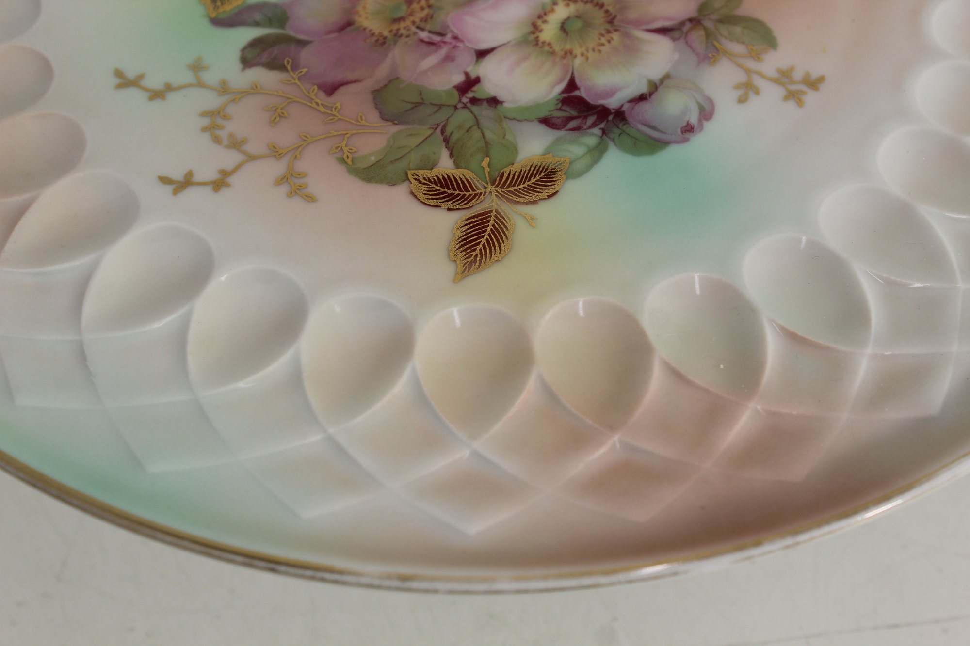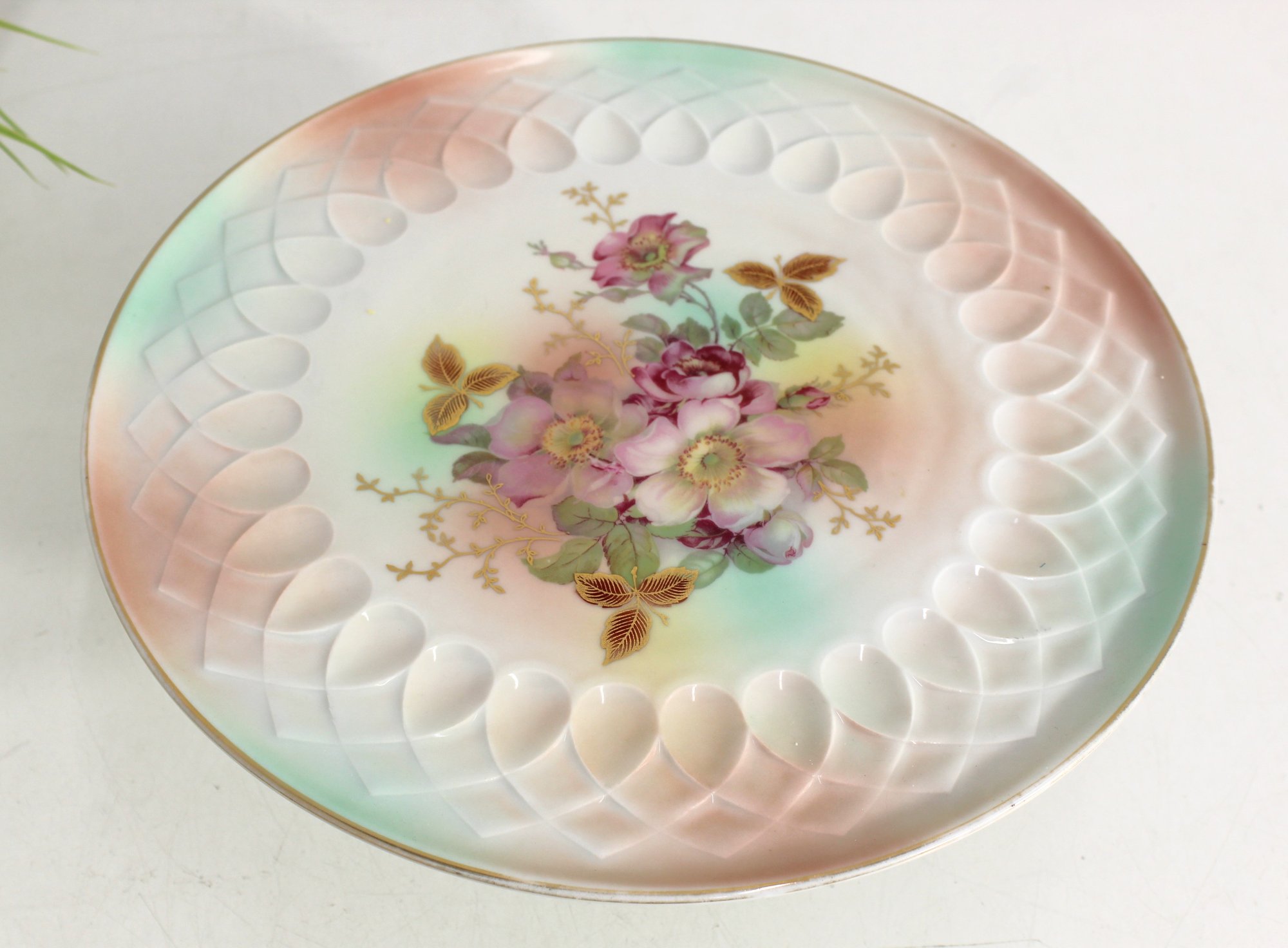 A beautiful example of early 20th-century porcelain artistry, this RS Prussia pedestal cake stand showcases delicate craftsmanship and soft, romantic color tones.