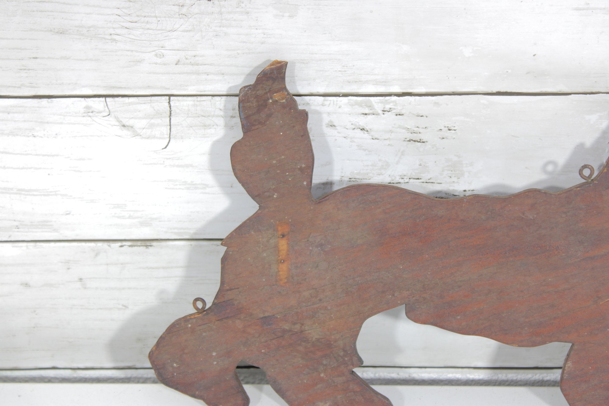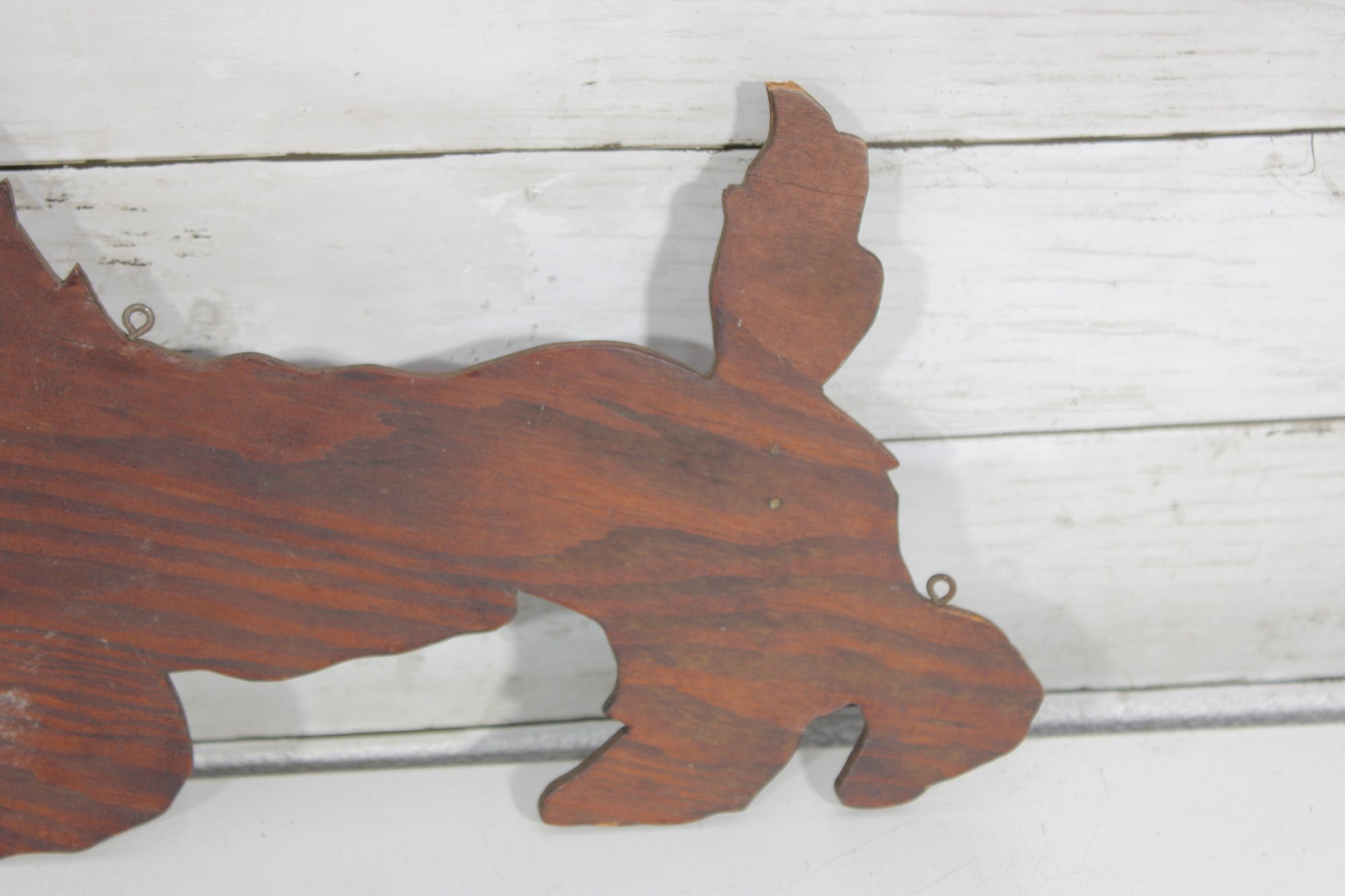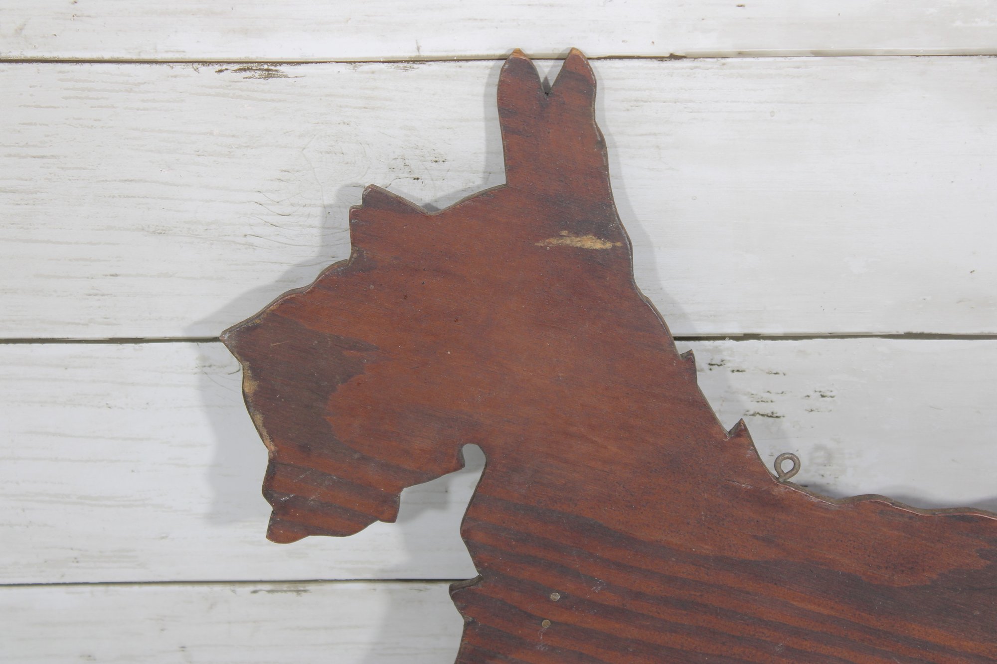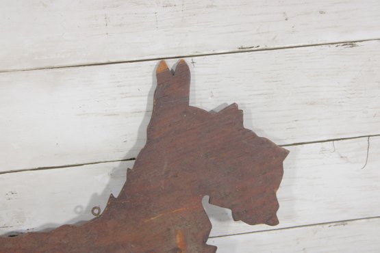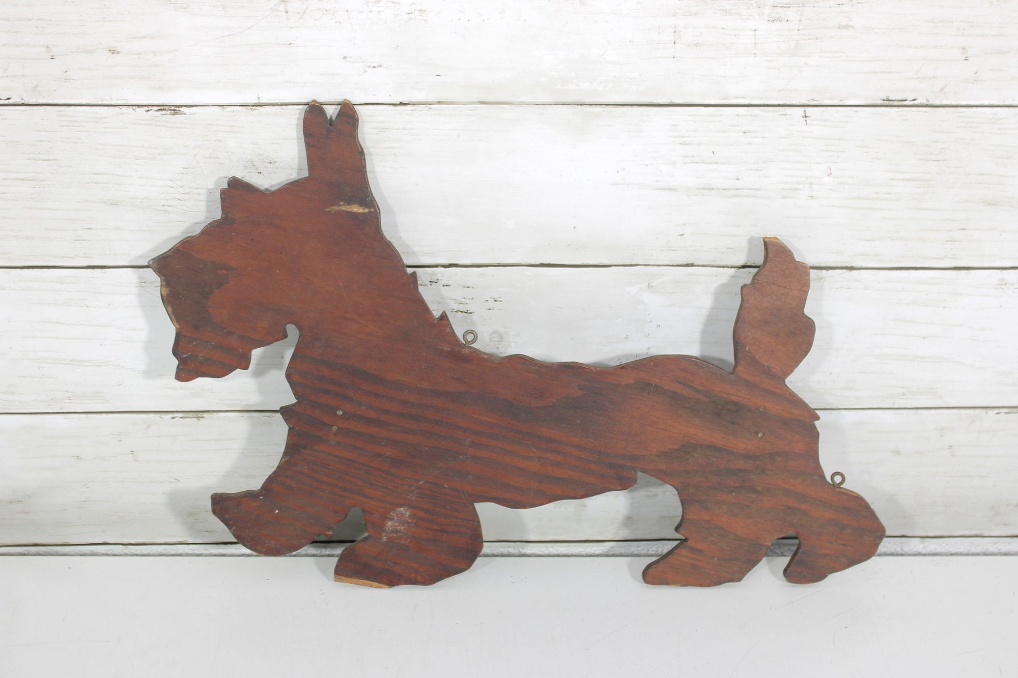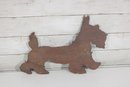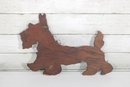The playful pose of the Scottie with its raised tail and distinctive beard captures the classic look of this beloved breed. Small metal loops are present for wall hanging, making it a great decorative accent.