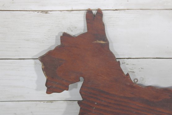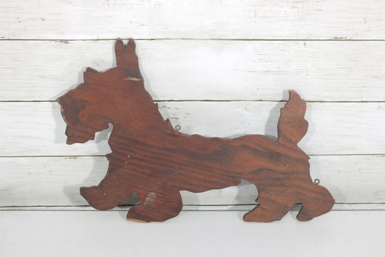 wooden Scottie dog wall plaque, featuring a charming Scottish Terrier silhouette design. The piece is cut from wood and finished with a dark stained surface that highlights the natural wood grain.