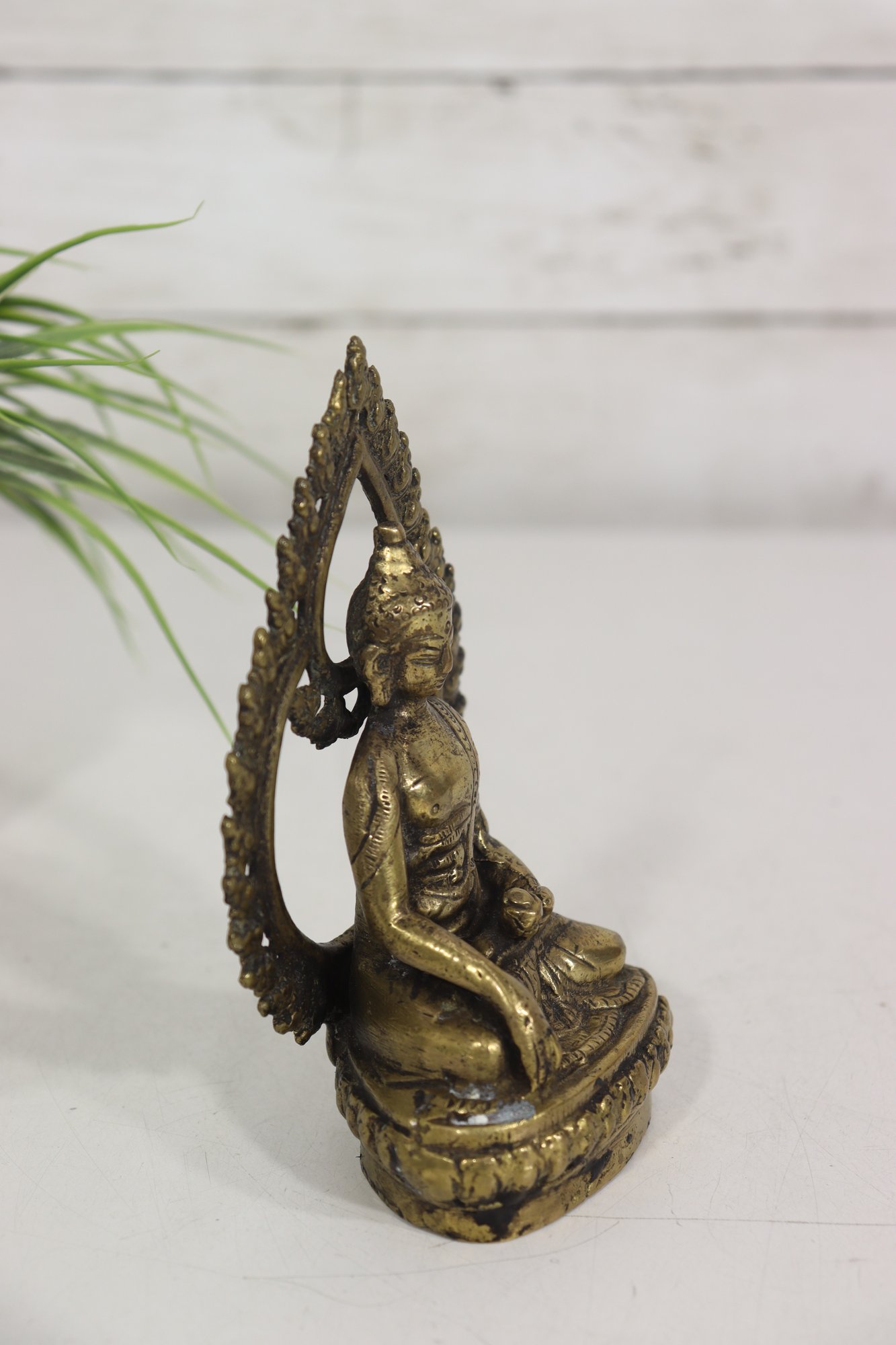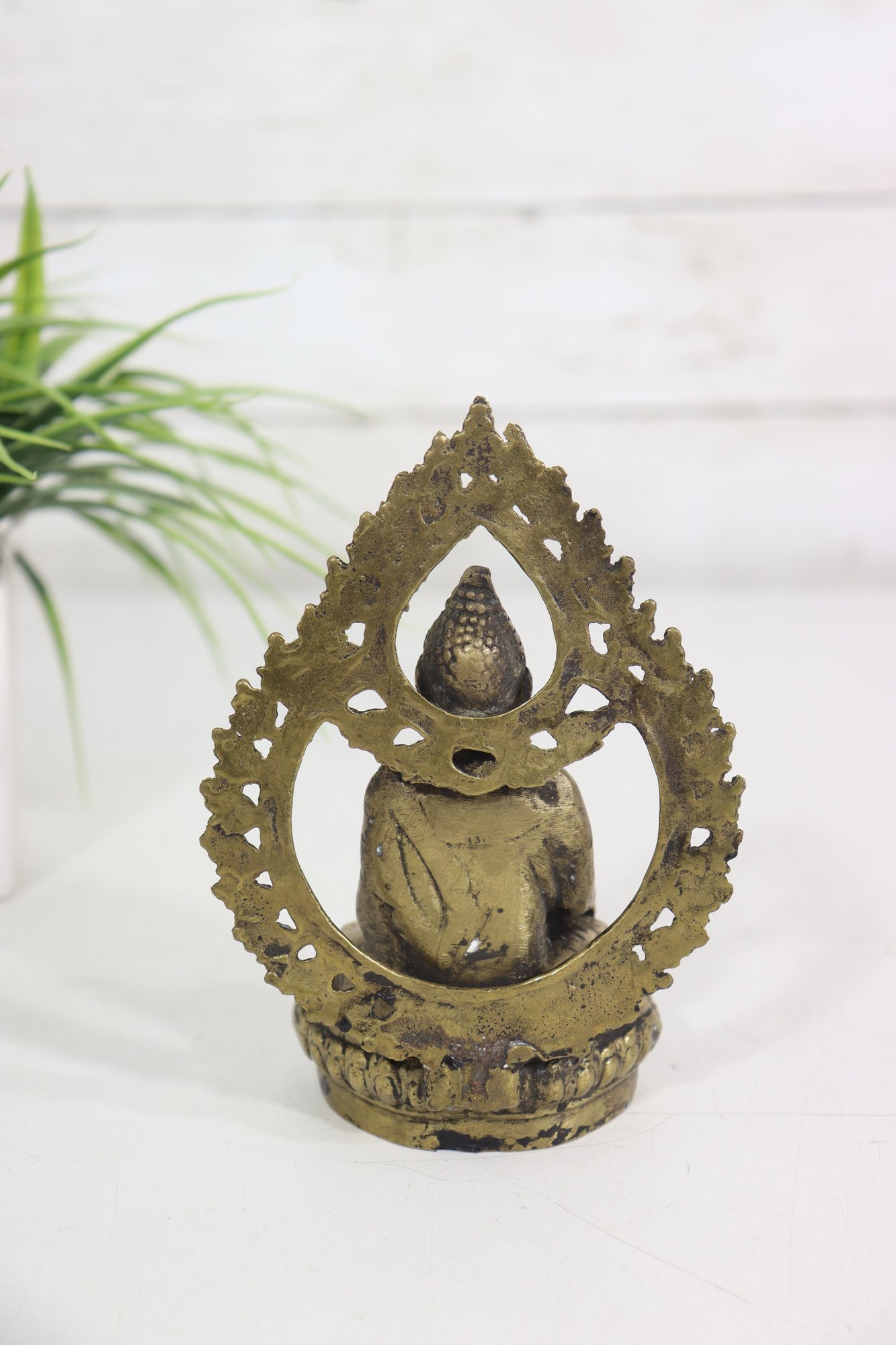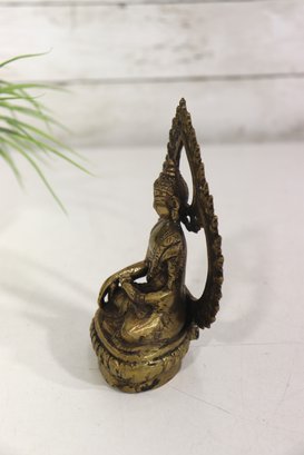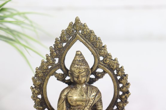 Beautiful vintage seated Buddha figurine, cast in metal with a warm aged patina and detailed sculptural features. The figure is seated in a meditative pose and framed by an ornate openwork halo-style back, richly decorated with scrolling and floral motifs.