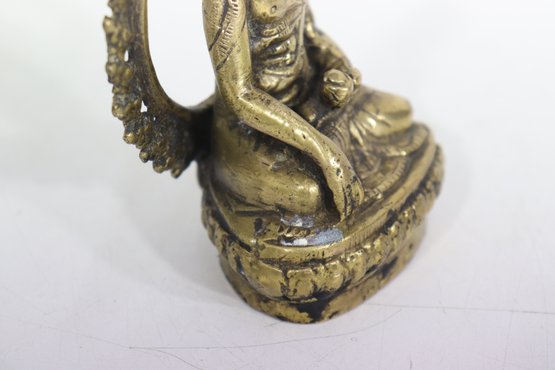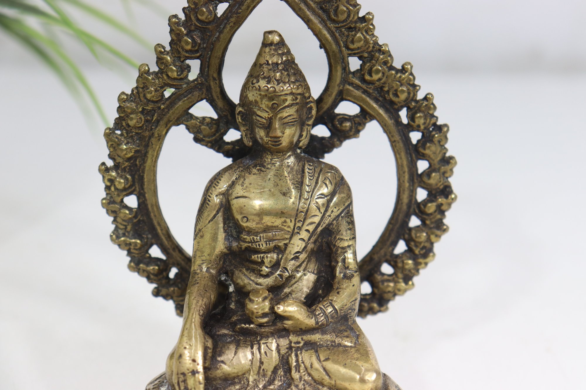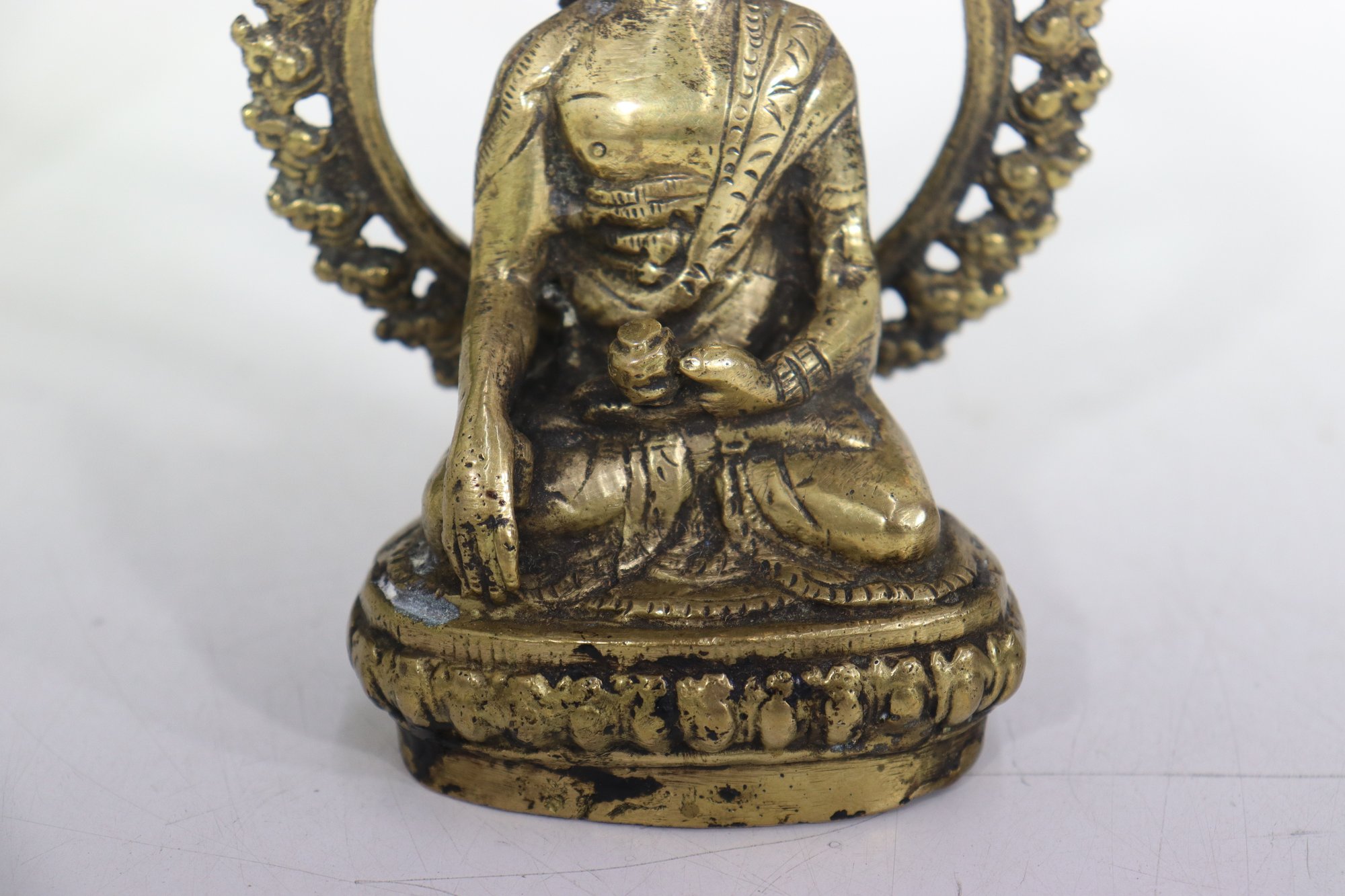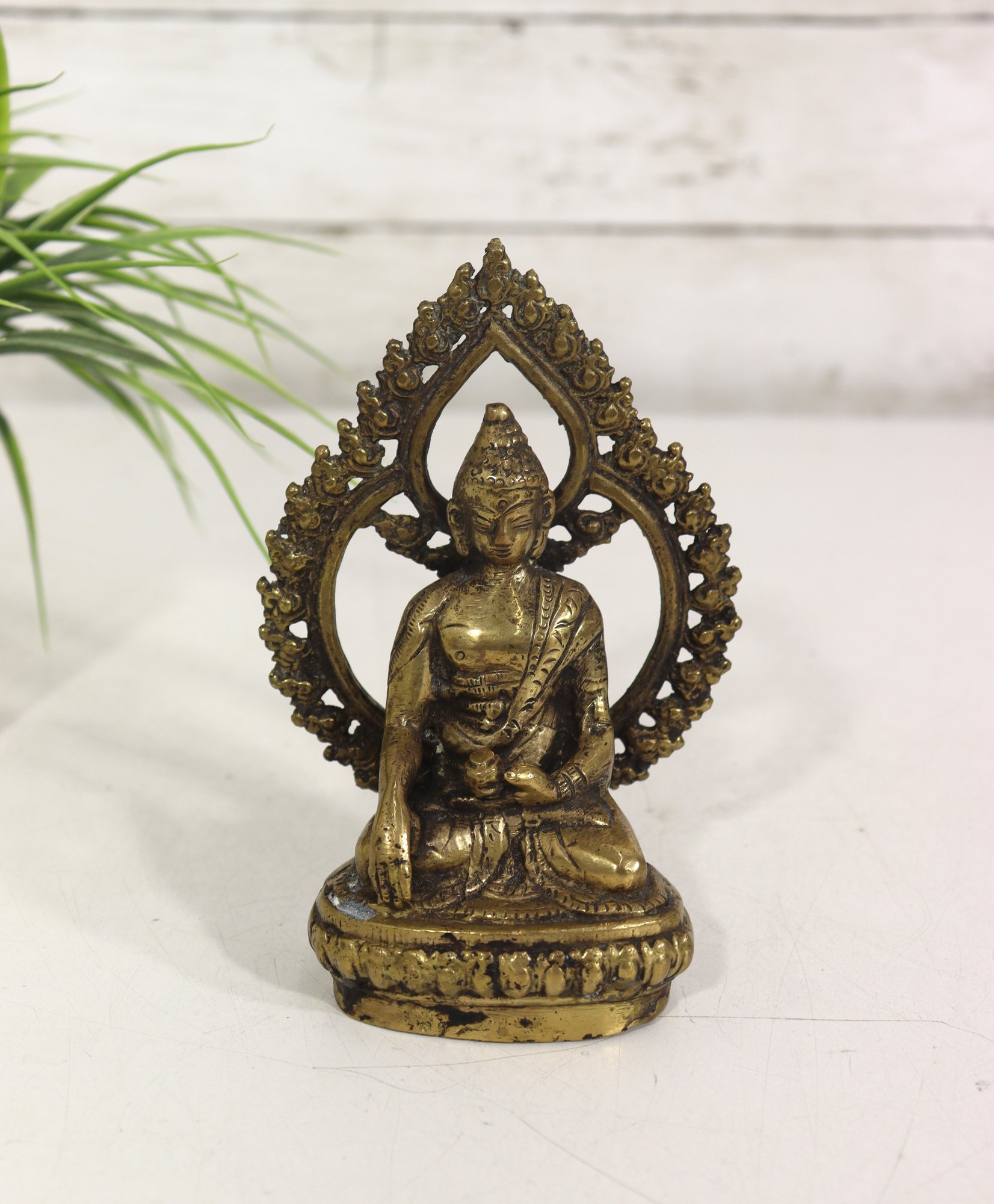 Beautiful vintage seated Buddha figurine, cast in metal with a warm aged patina and detailed sculptural features. The figure is seated in a meditative pose and framed by an ornate openwork halo-style back, richly decorated with scrolling and floral motifs.