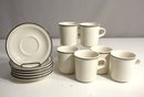 This is a charming set of vintage stoneware china, including 6 mugs and 6 saucers. Each piece features a simple yet elegant off-white finish with black rims, adding a timeless appeal to your collection. The base of each mug is marked "Stoneware China." This set is perfect for tea or coffee lovers and adds a touch of vintage charm to your kitchen or dining area.