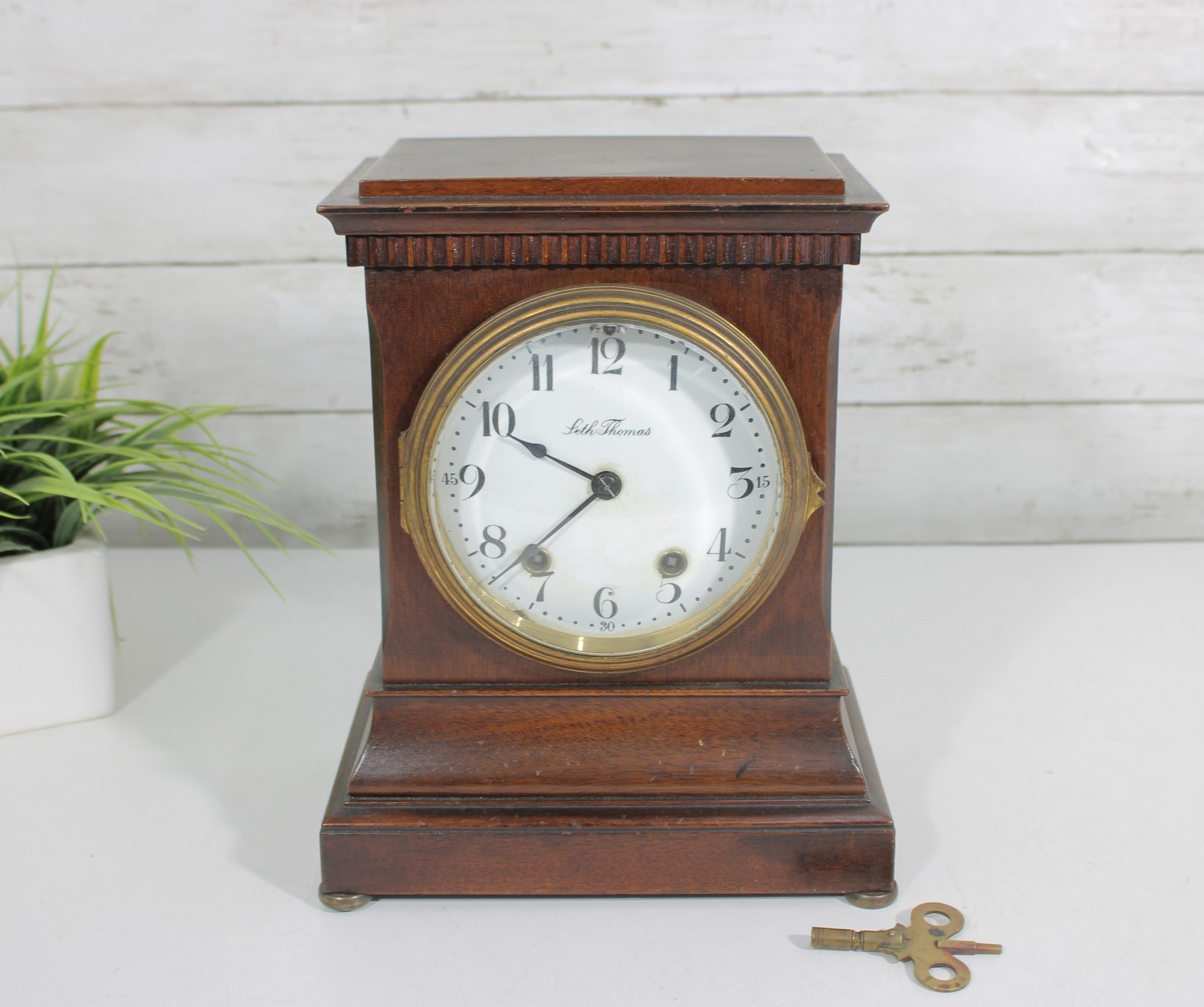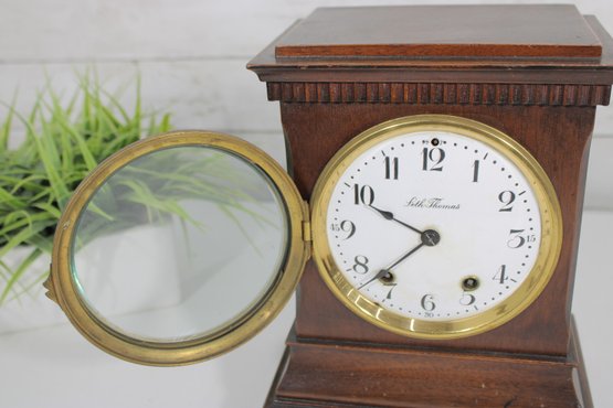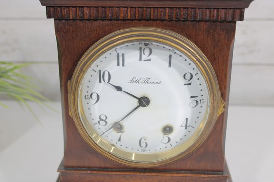 a classic vintage mantel clock by Seth Thomas, featuring a timeless design and quality craftsmanship. Housed in a rich wooden case with a stepped base and decorative trim, this piece embodies traditional elegance and would make a wonderful addition to any home, office, or collection.