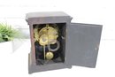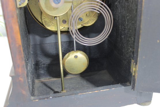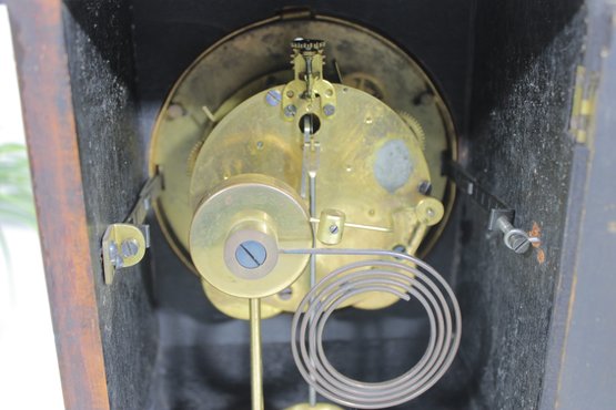 The clock features a round white dial with black Arabic numerals and the Seth Thomas name prominently displayed. The hinged glass door opens smoothly, allowing easy access to the face and hands. Inside, the mechanical movement is visible, complete with pendulum and coil gong, offering both visual and functional appeal. The original winding key is included.
