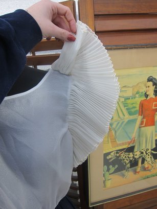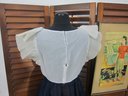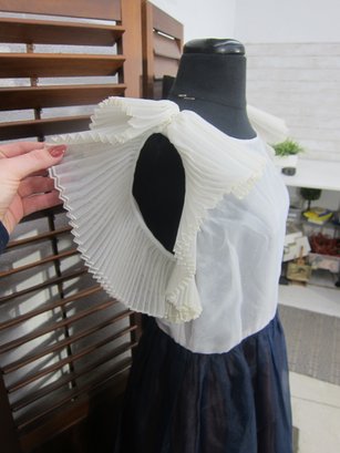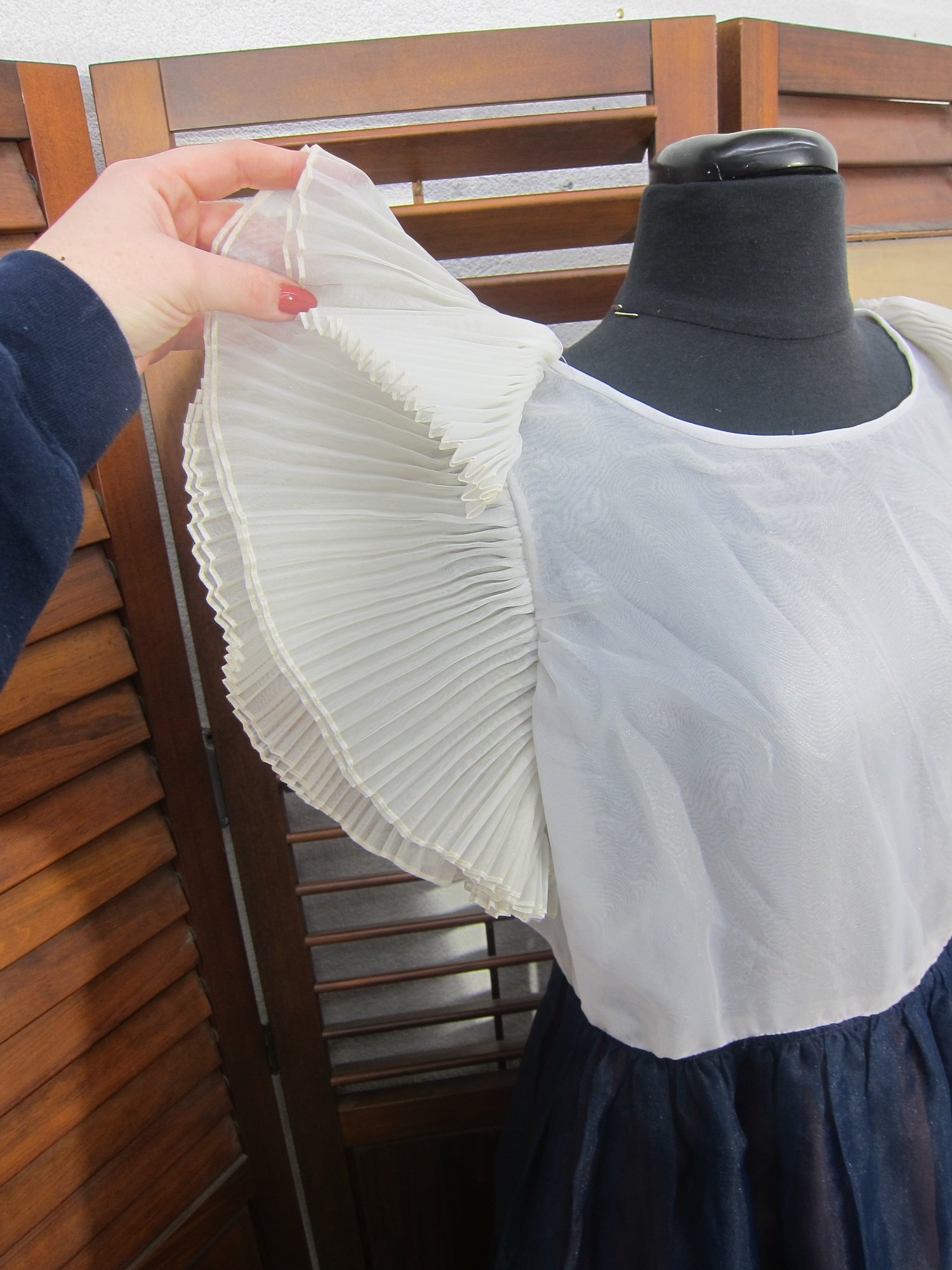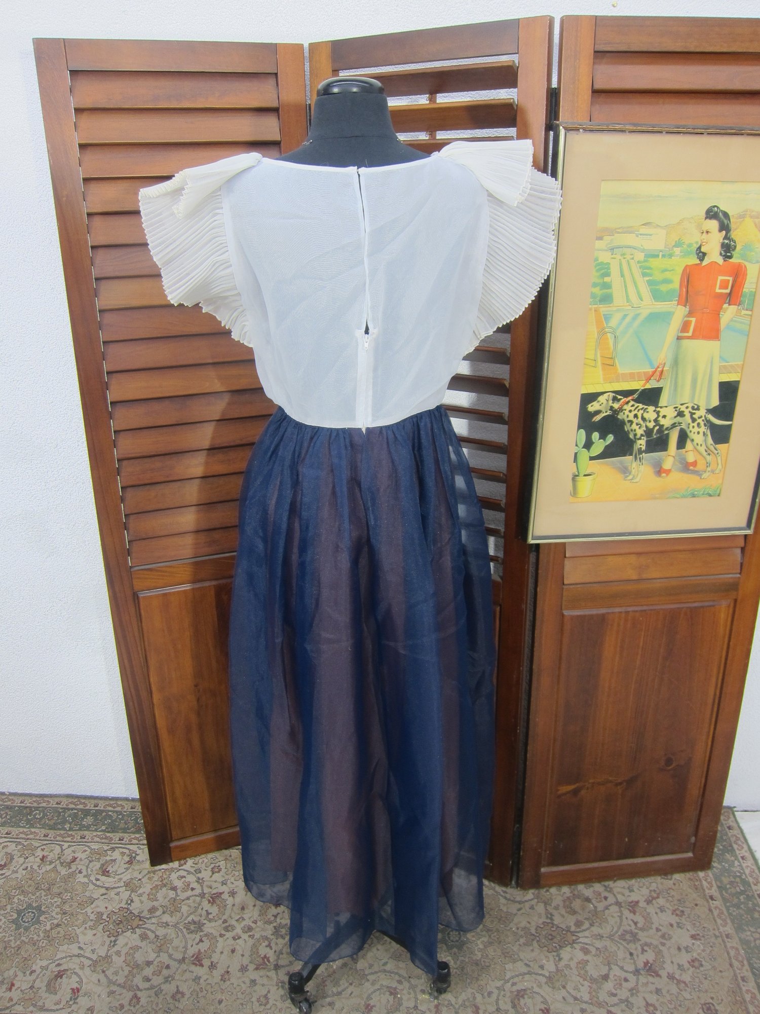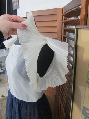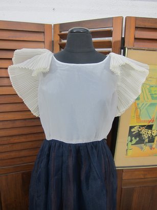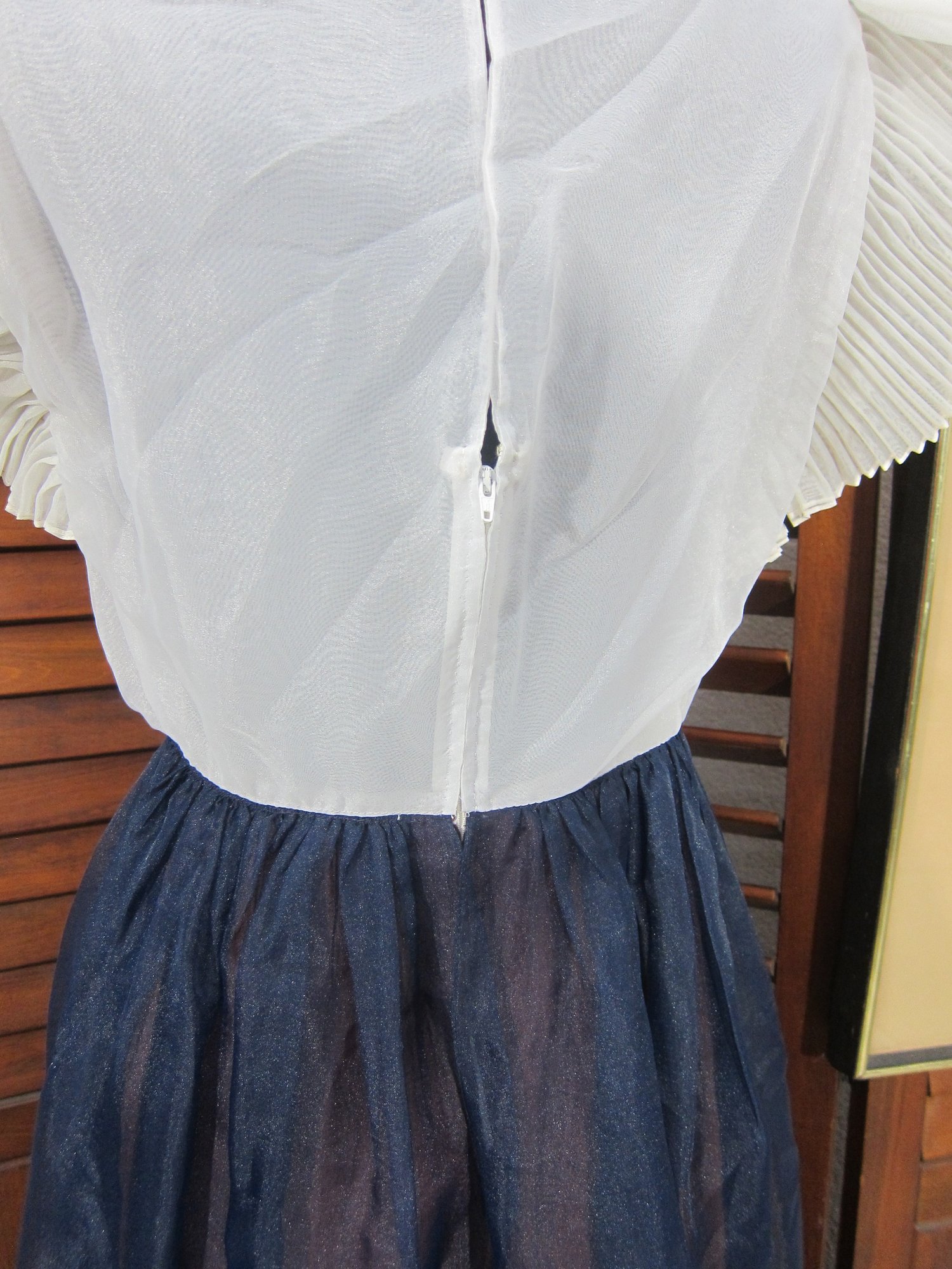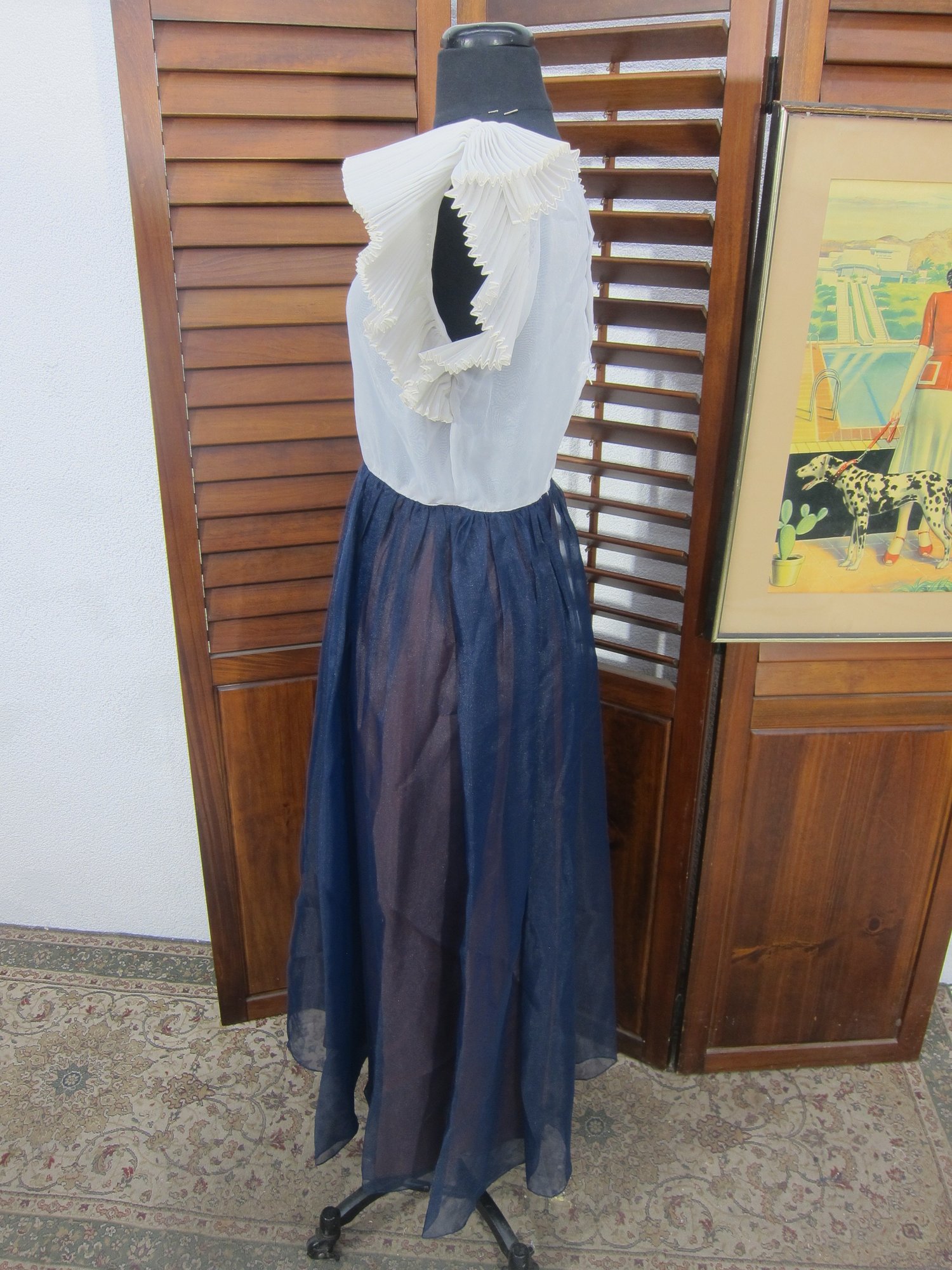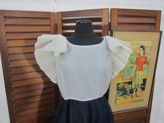 Charming vintage two-piece outfit featuring a delicate sheer blouse paired with a flowing navy skirt. The blouse is designed with dramatic pleated flutter sleeves that create a soft, romantic silhouette, along with a simple round neckline and back zipper closure. The lightweight fabric gives an airy, elegant look.