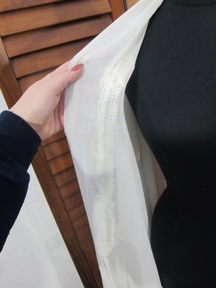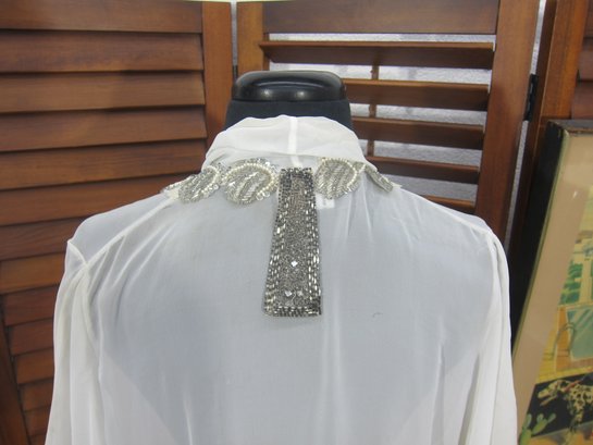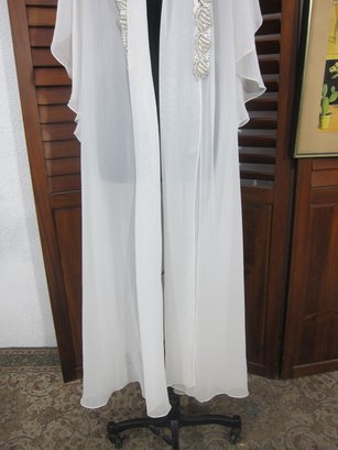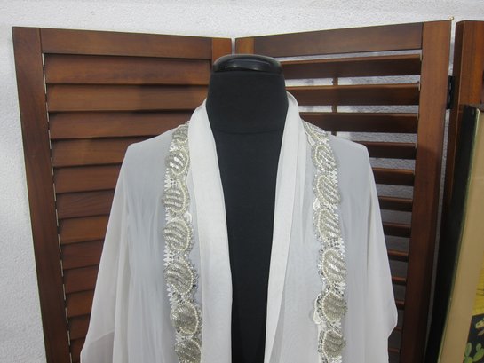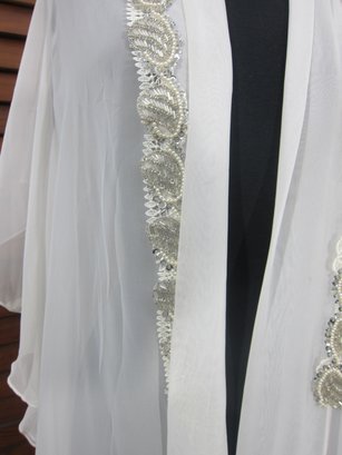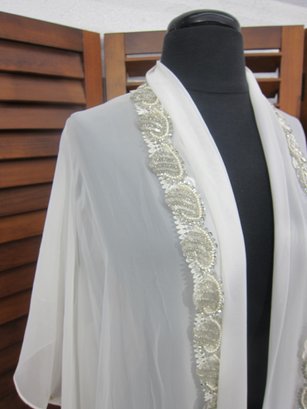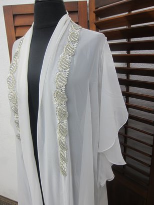 vintage sheer chiffon robe in a soft ivory tone, featuring beautiful beaded trim along the front opening and neckline. This piece has a graceful, flowing silhouette with wide, draped sleeves that create a dramatic and romantic look when worn.