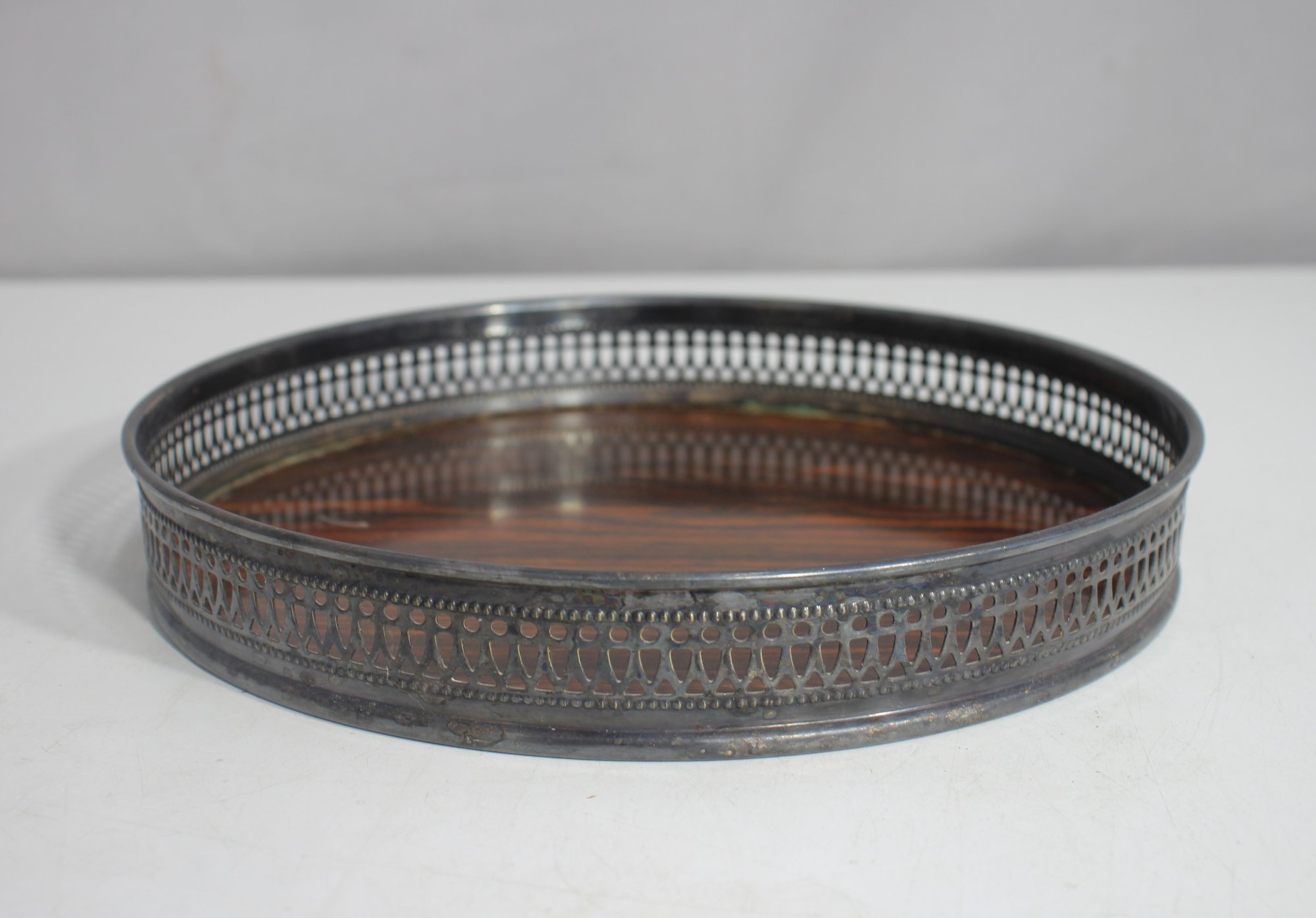 This vintage Sheffield Silver gallery tray is a classic mid-century serving piece, featuring an elegant pierced silver-tone metal rim and a rich woodgrain Formica inlay. Made in the USA, this round tray measures 10 inches in diameter and 1.5 inches high, making it perfect for serving drinks, displaying barware, or as a stylish vanity tray.