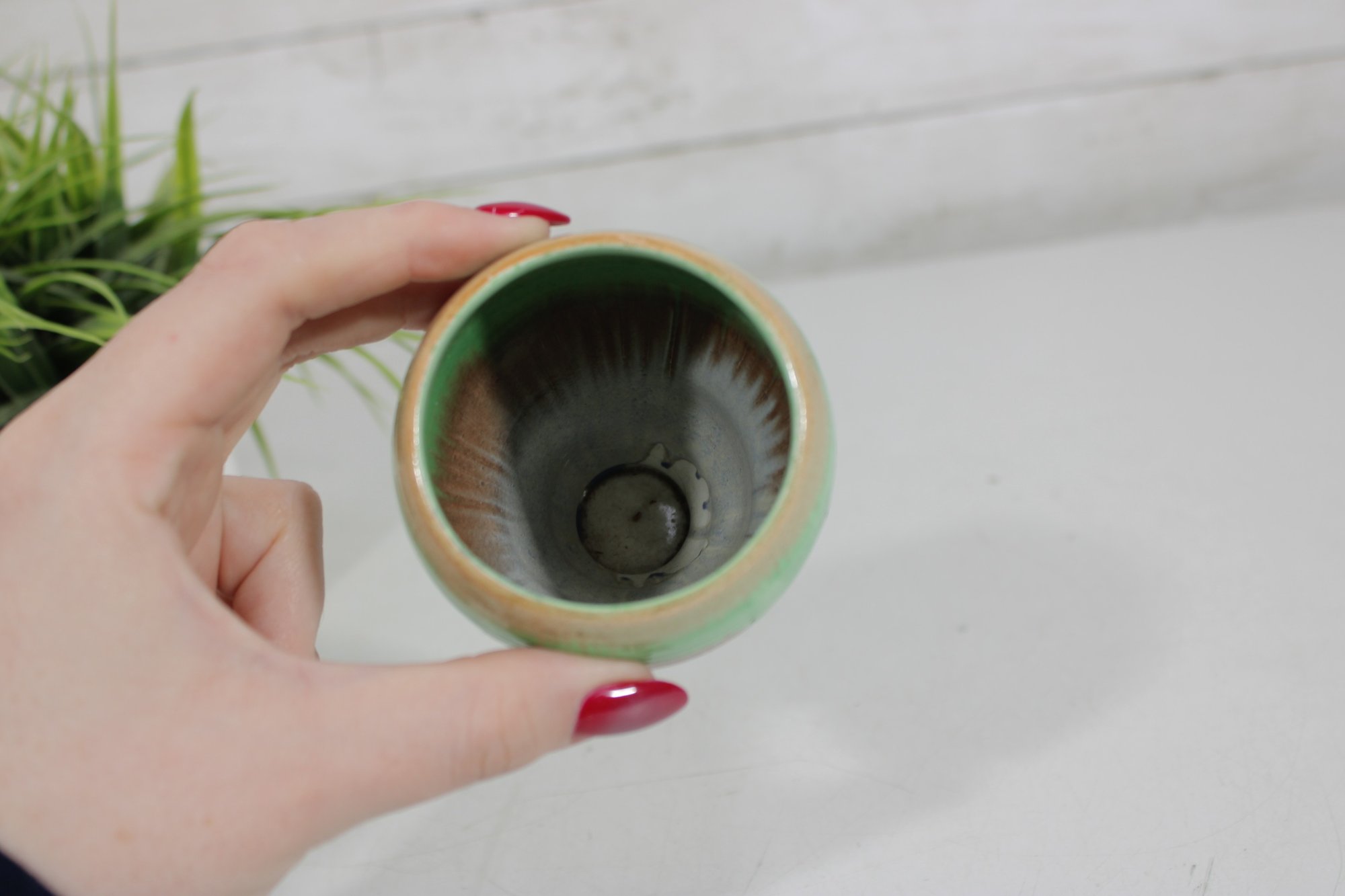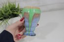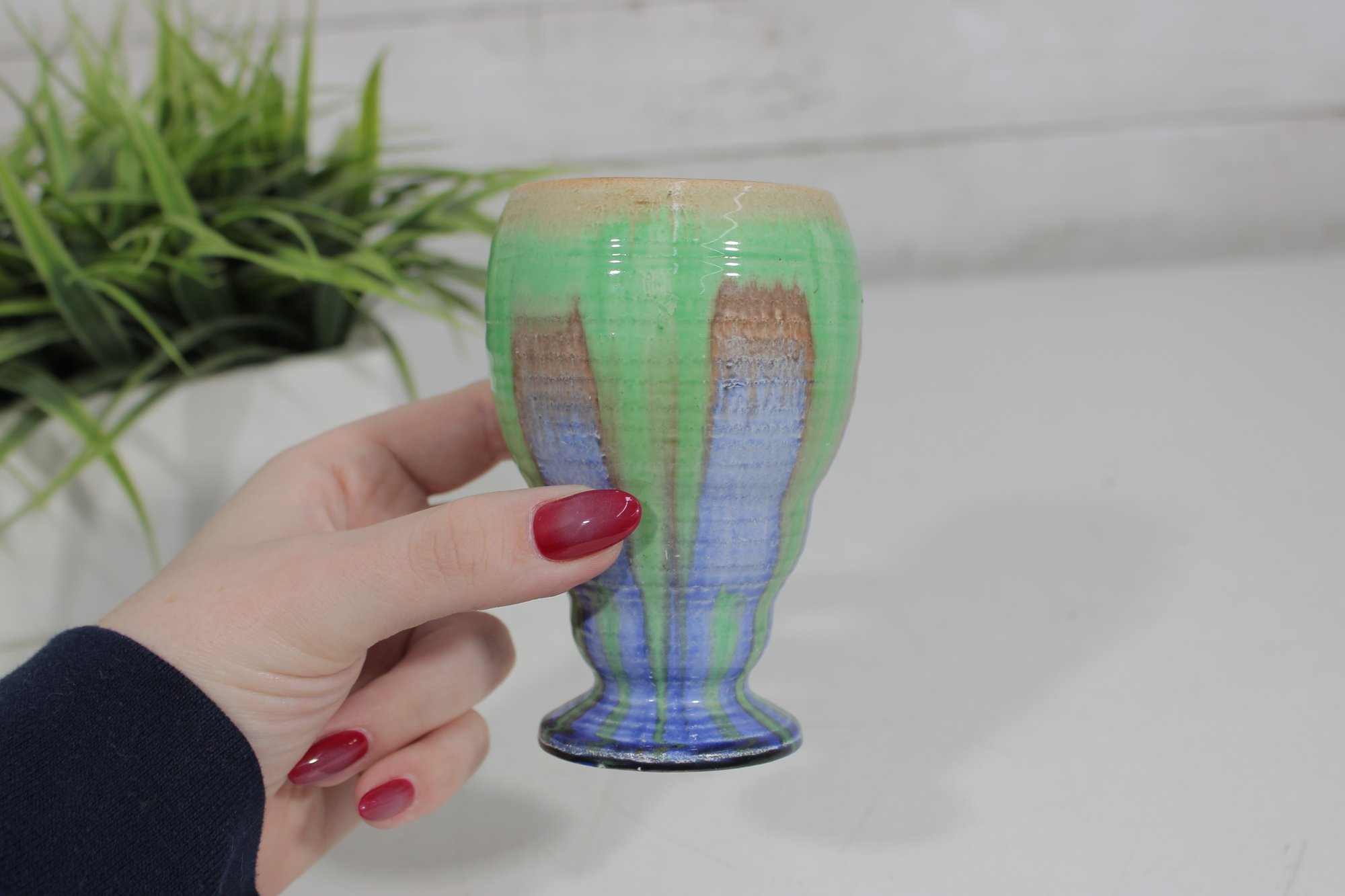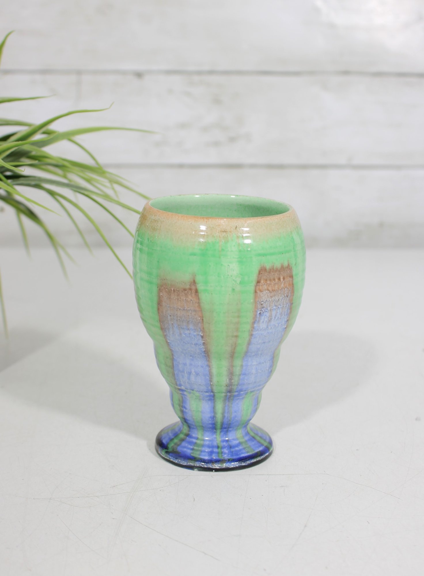 Beautiful vintage Shelley vase featuring a classic Art Deco-inspired form with a flared foot and gently tapered body. This piece showcases a striking drip glaze in soft green, blue, and warm earthy tones, creating a vibrant and eye-catching finish.