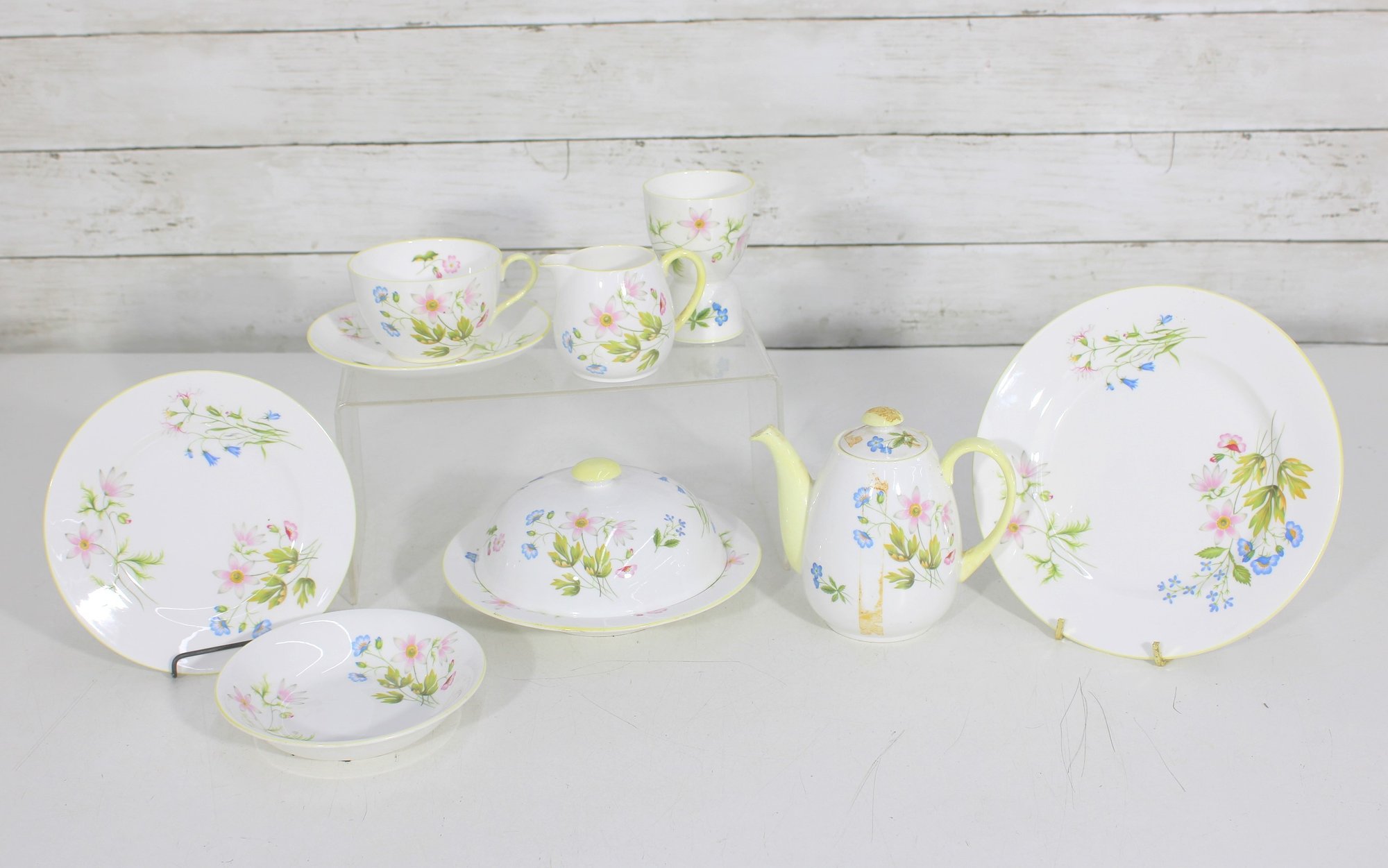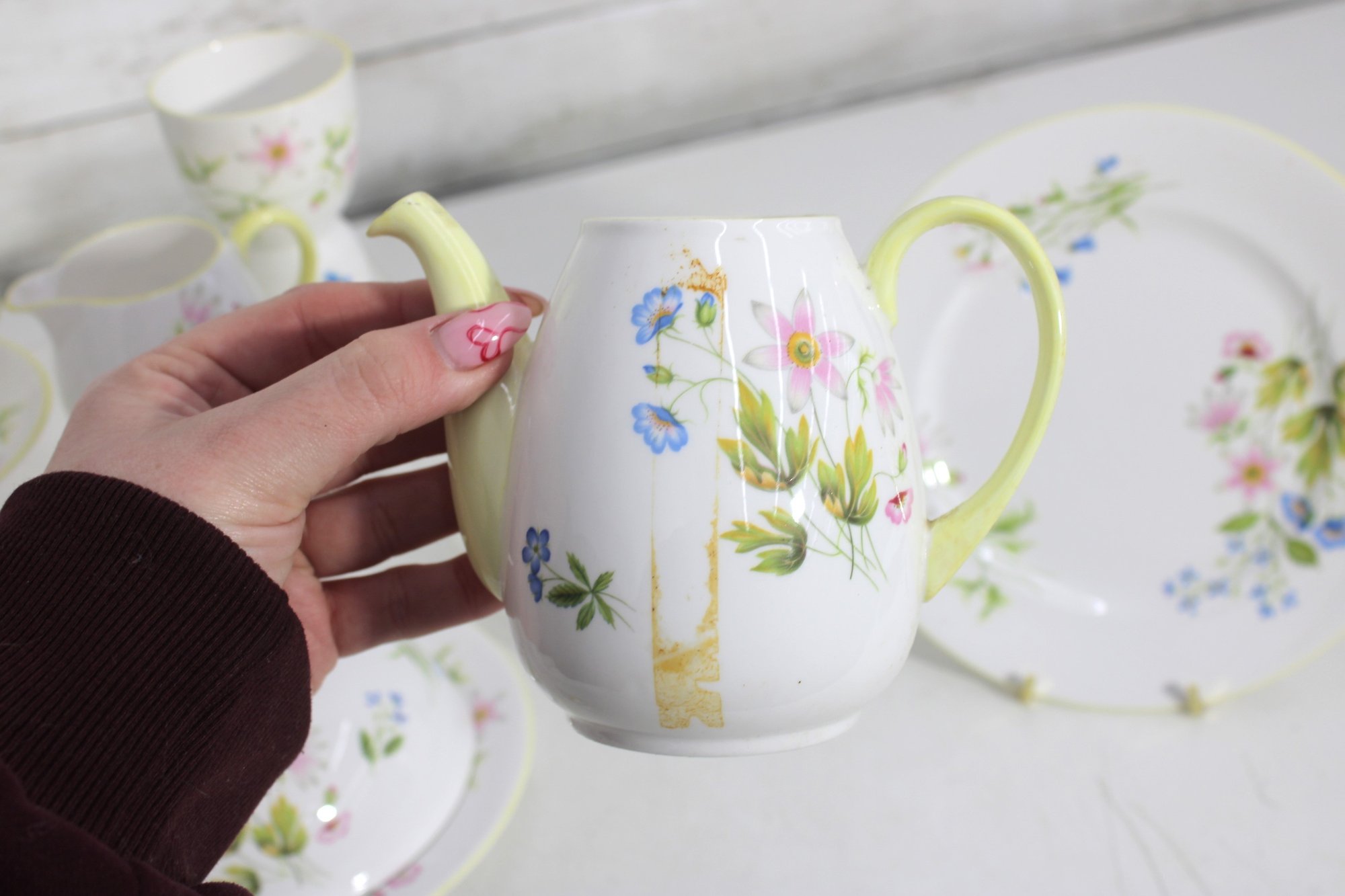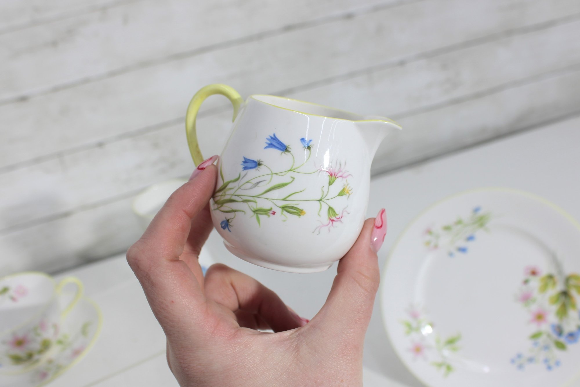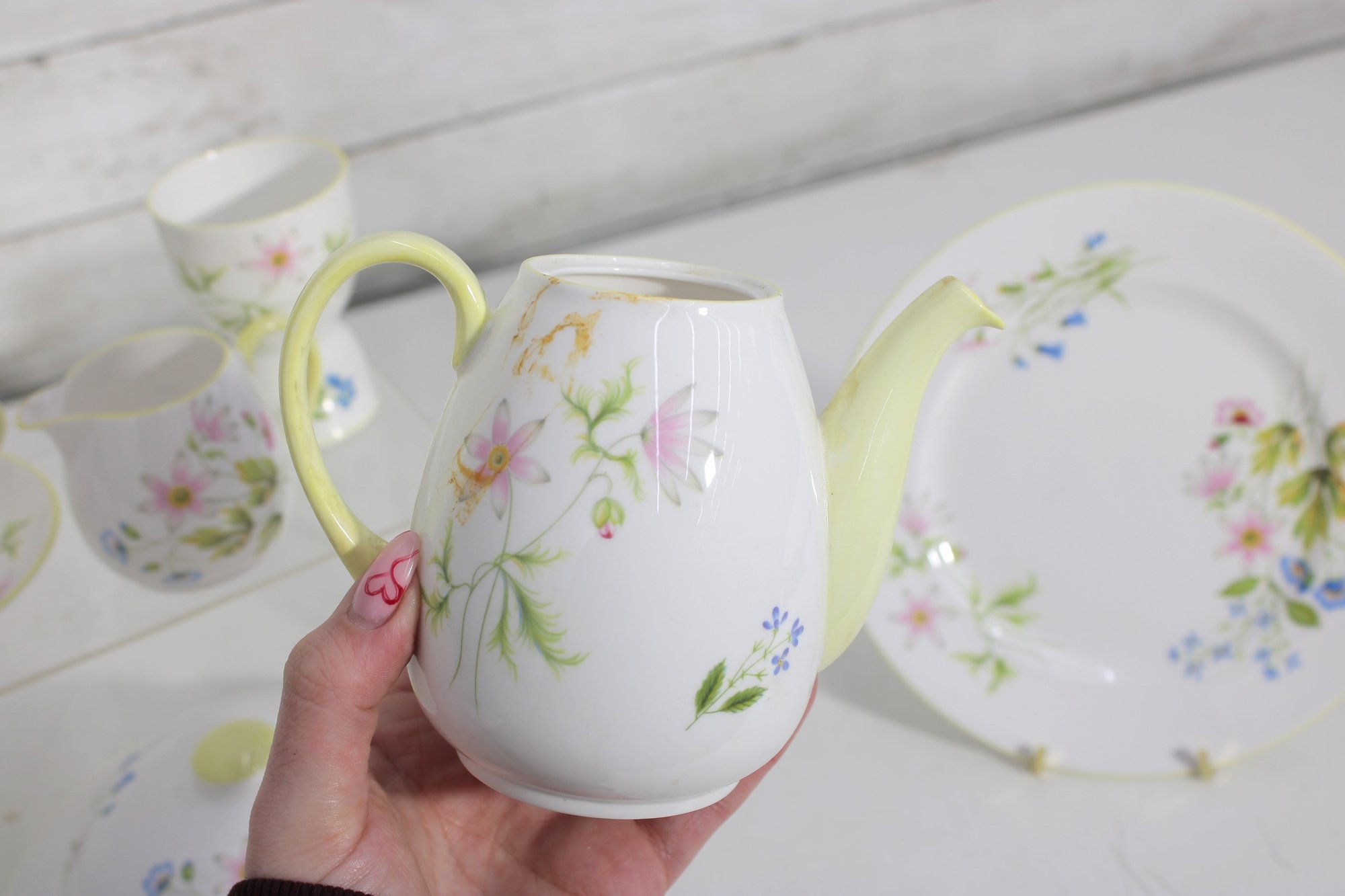 Charming vintage Shelley Fine Bone China tea set featuring a delicate pastel floral pattern accented with soft yellow trim and handles. This beautifully coordinated set showcases classic English craftsmanship, with hand-applied floral sprays in pink, blue, and green against a crisp white ground.