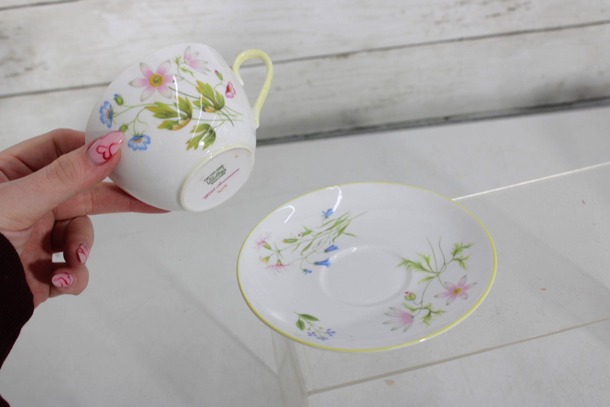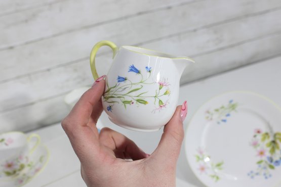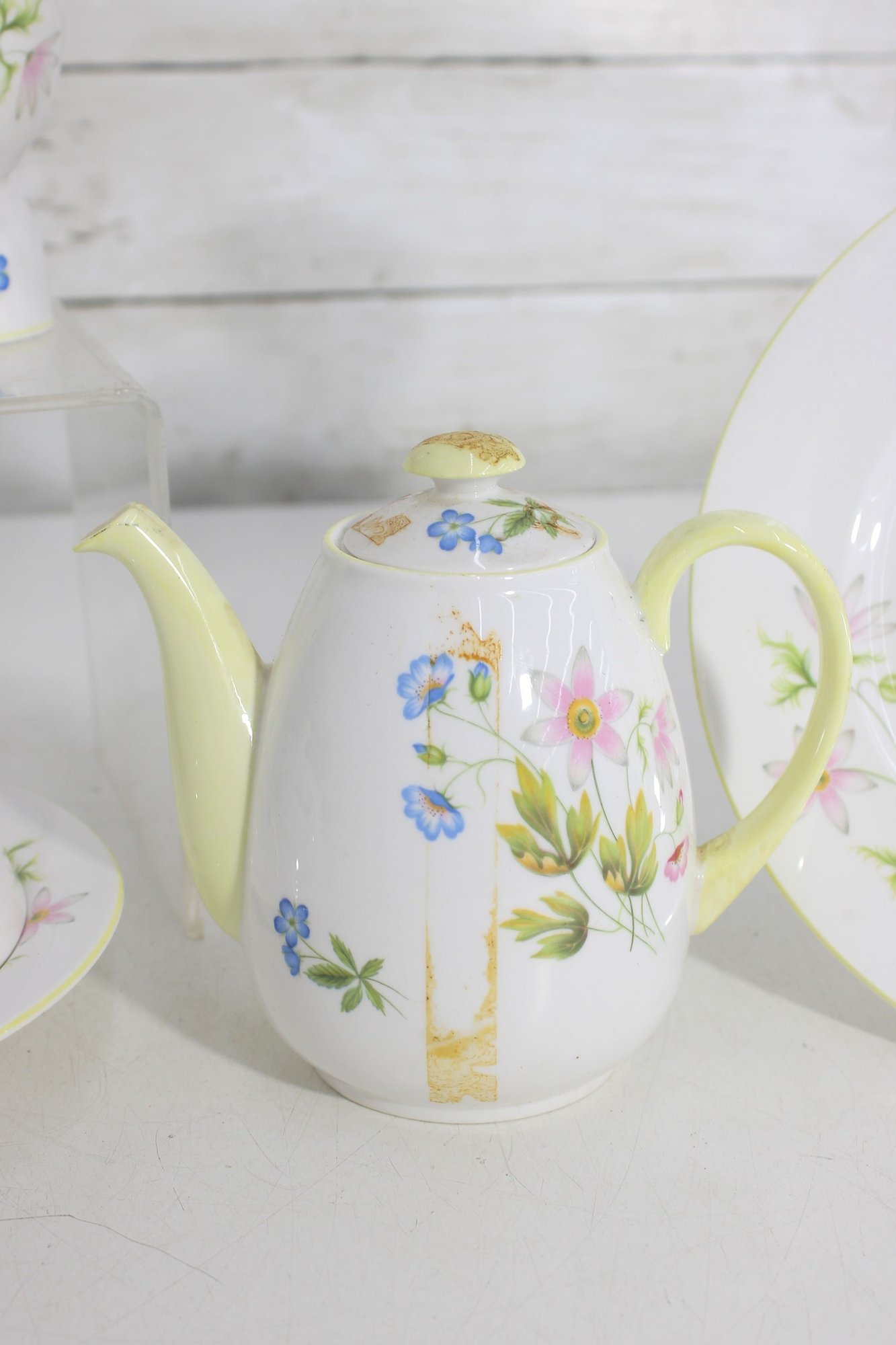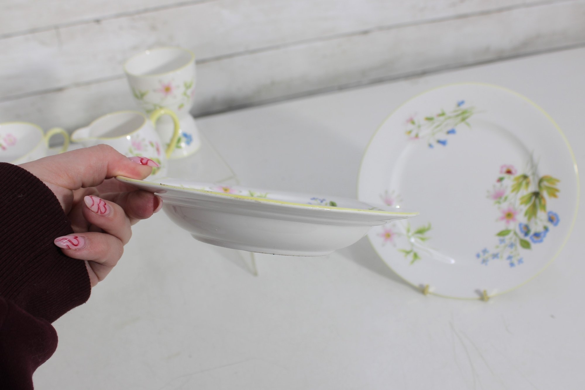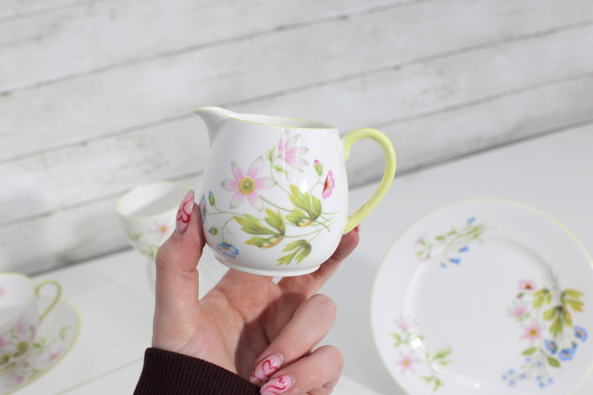 Charming vintage Shelley Fine Bone China tea set featuring a delicate pastel floral pattern accented with soft yellow trim and handles. This beautifully coordinated set showcases classic English craftsmanship, with hand-applied floral sprays in pink, blue, and green against a crisp white ground.