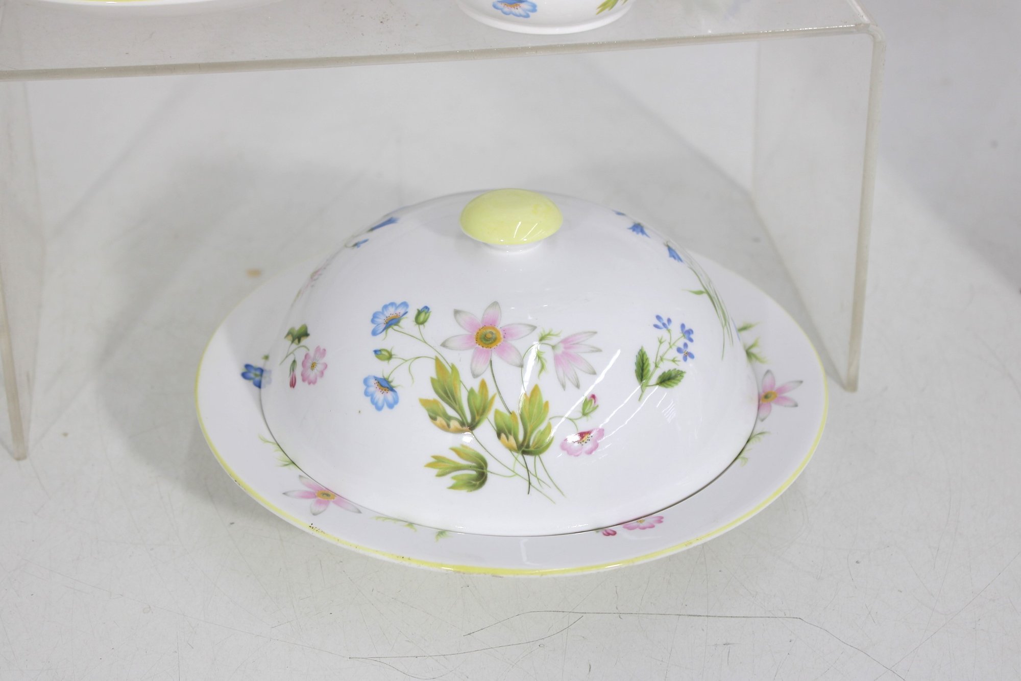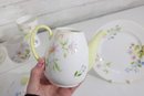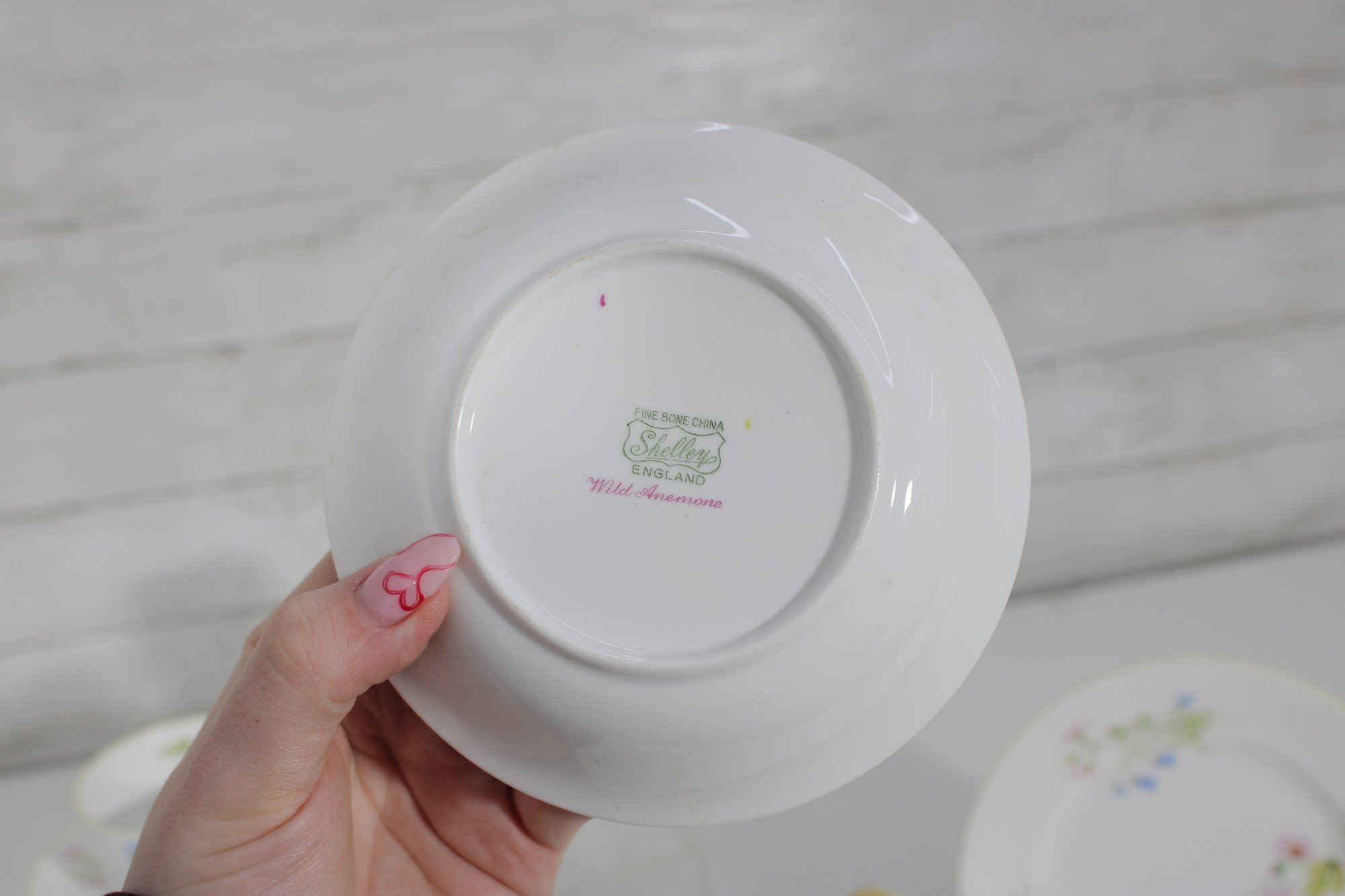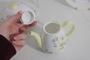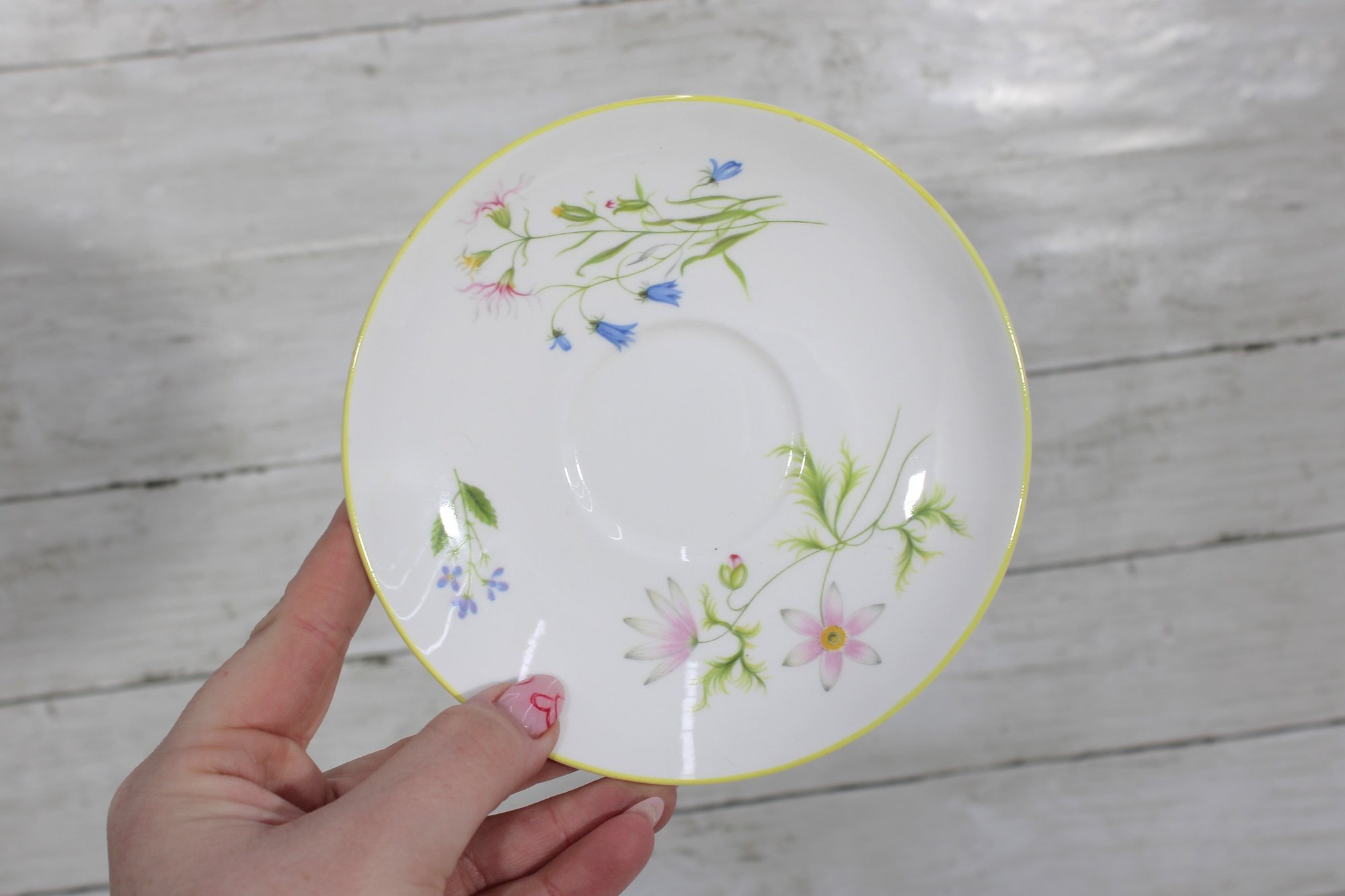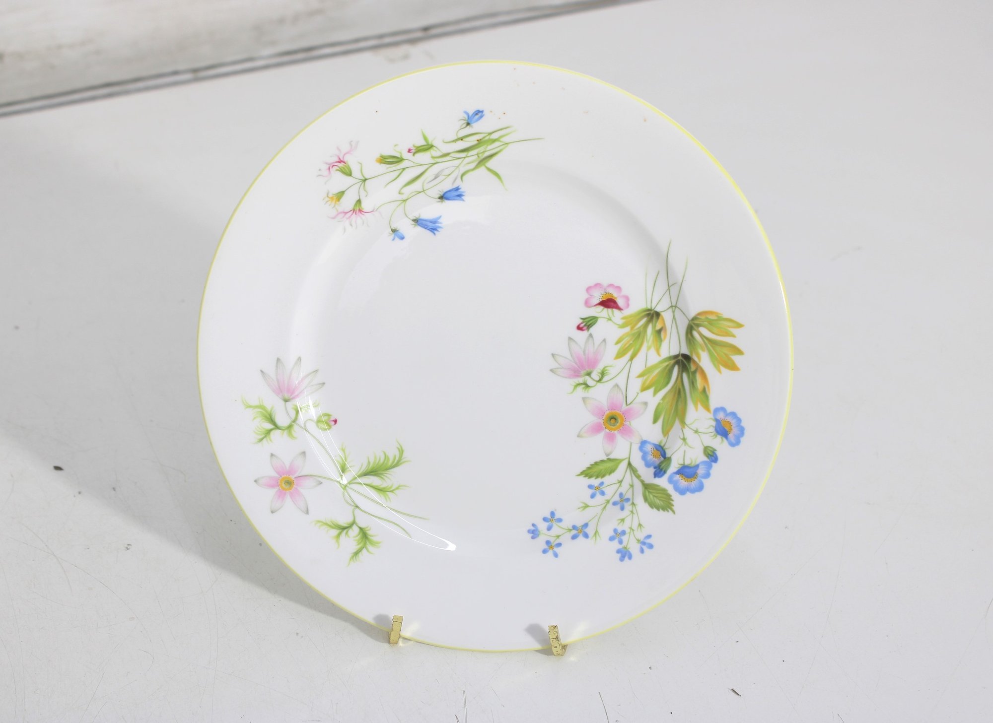 Charming vintage Shelley Fine Bone China tea set featuring a delicate pastel floral pattern accented with soft yellow trim and handles. This beautifully coordinated set showcases classic English craftsmanship, with hand-applied floral sprays in pink, blue, and green against a crisp white ground.