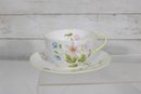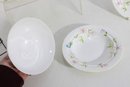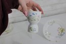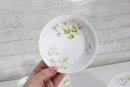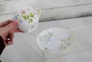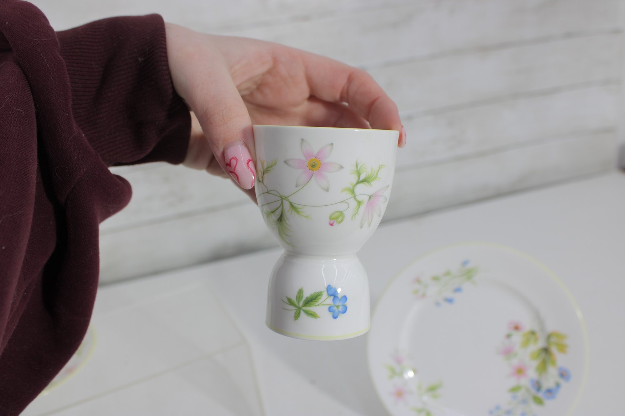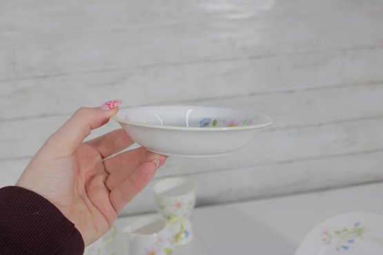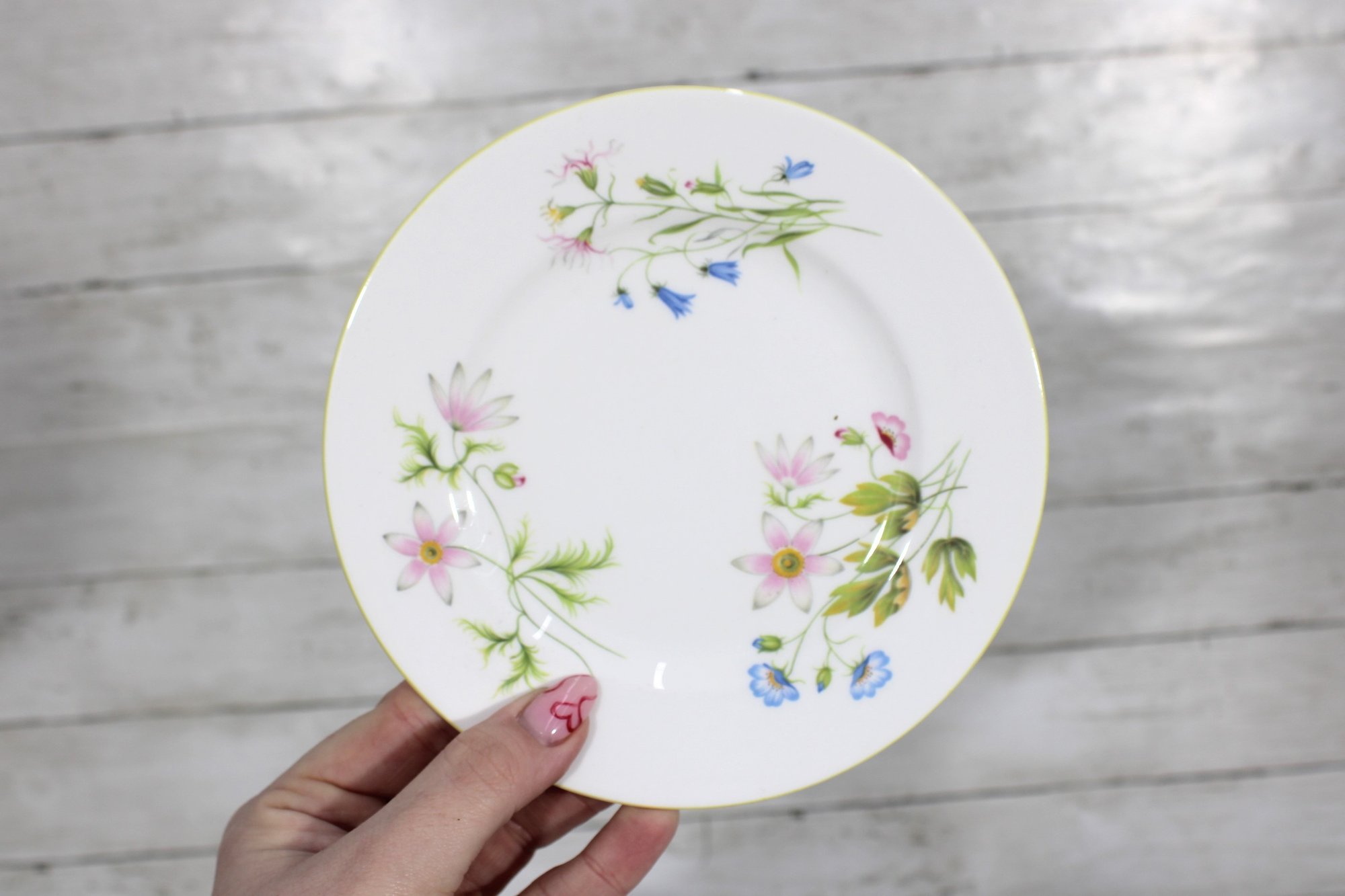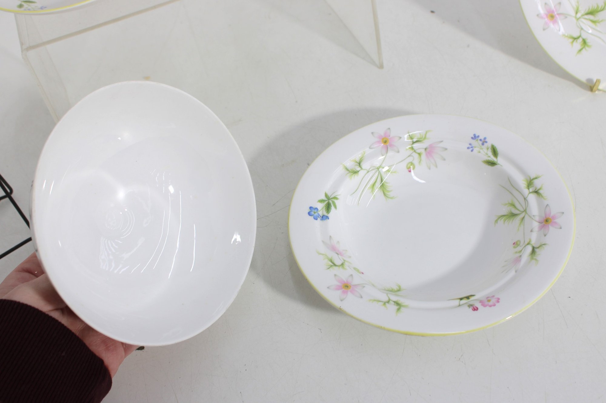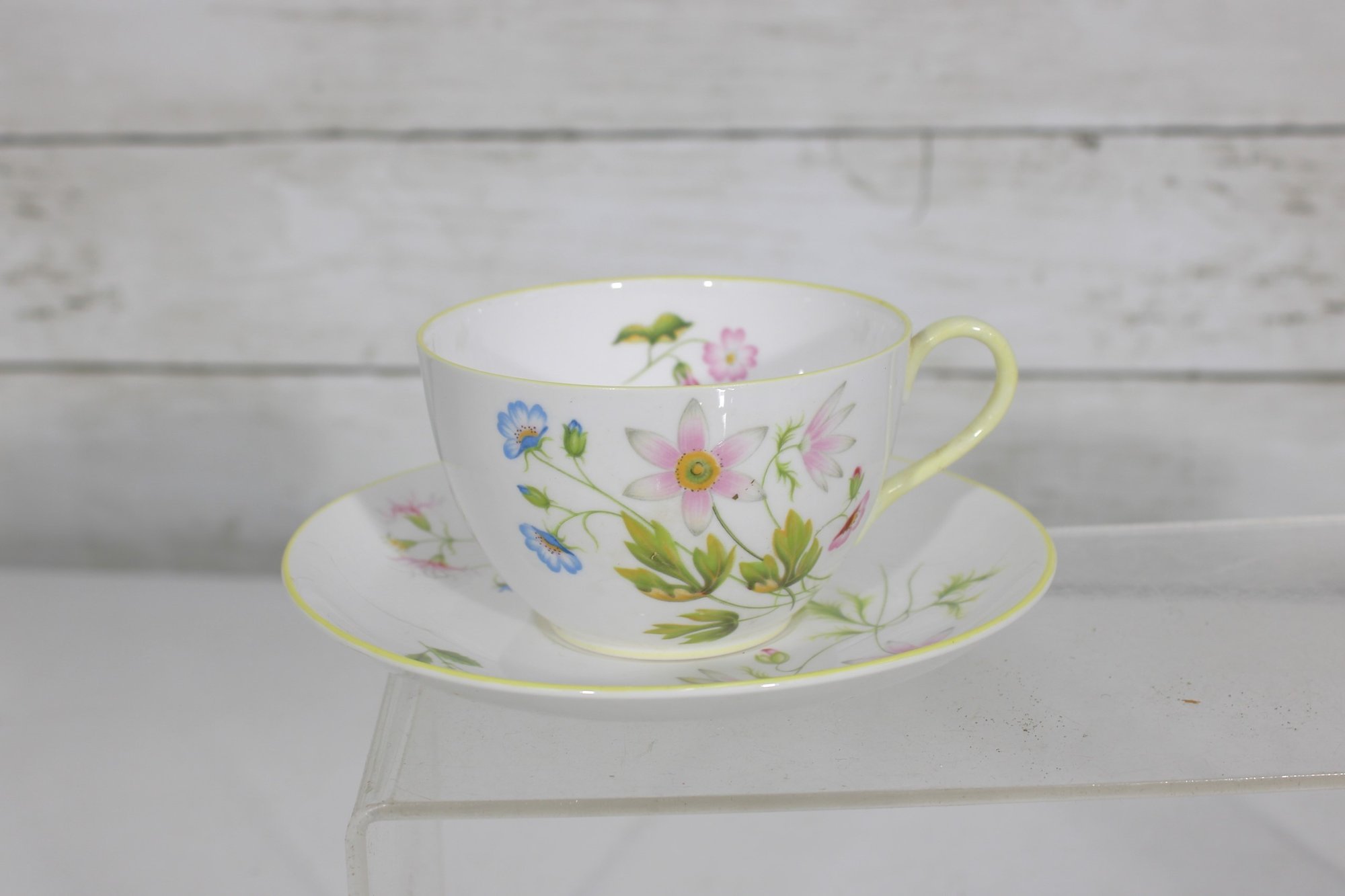 Charming vintage Shelley Fine Bone China tea set featuring a delicate pastel floral pattern accented with soft yellow trim and handles. This beautifully coordinated set showcases classic English craftsmanship, with hand-applied floral sprays in pink, blue, and green against a crisp white ground.