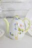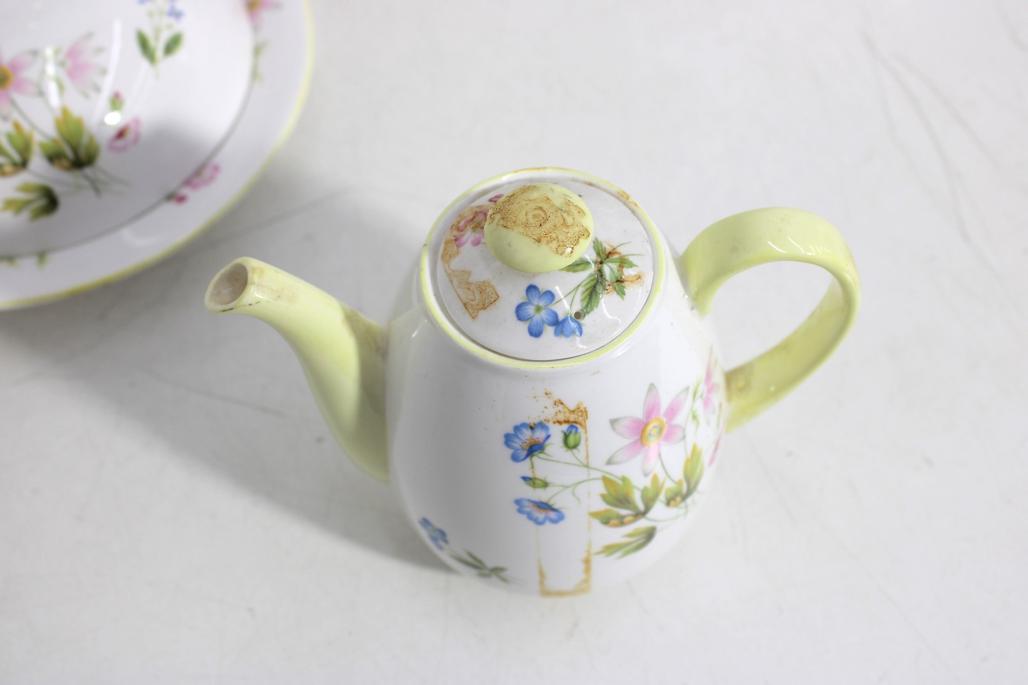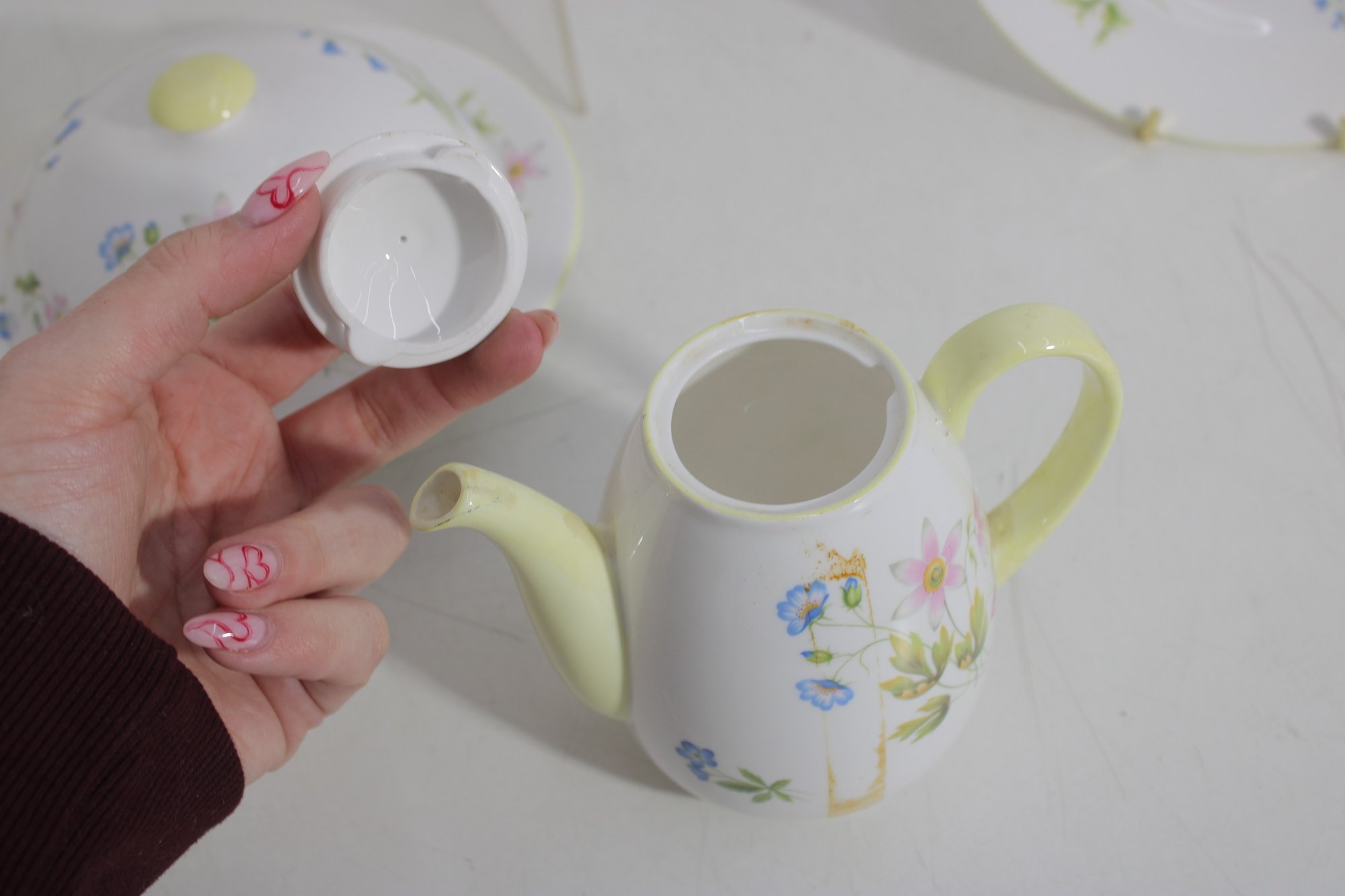 The teapot features a pale yellow handle, spout, and finial, complemented by fine detailing and a graceful silhouette. Each piece carries the Shelley backstamp (as shown), confirming authenticity.