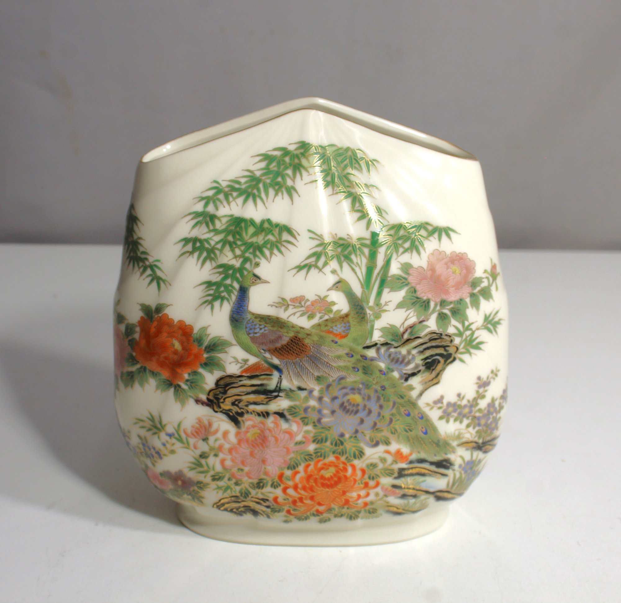 This beautiful vintage porcelain vase from Shibata Japan features an elegant hand-painted design of a peacock among vibrant florals and bamboo. The intricate details of the colorful peacock and surrounding flowers make this a standout decorative piece. The vase has a unique, slightly fluted shape, adding texture and dimension, while the back has a subtle scalloped design.