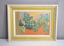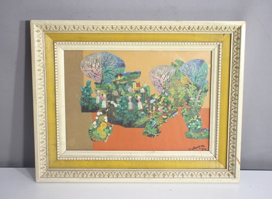 This captivating vintage mixed-media collage, signed Coborn '72, is a whimsical and surreal landscape composition featuring a fusion of vibrant colors, nature-inspired elements, and village life scenes. The intricate collage technique blends hand-cut pieces to form a dreamlike scene filled with lush greenery, blooming trees, and human figures engaged in daily activities.