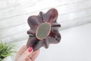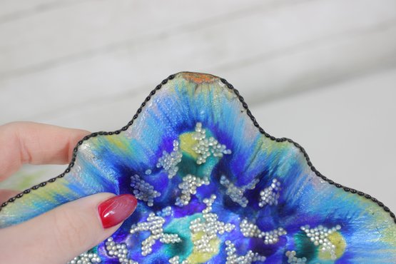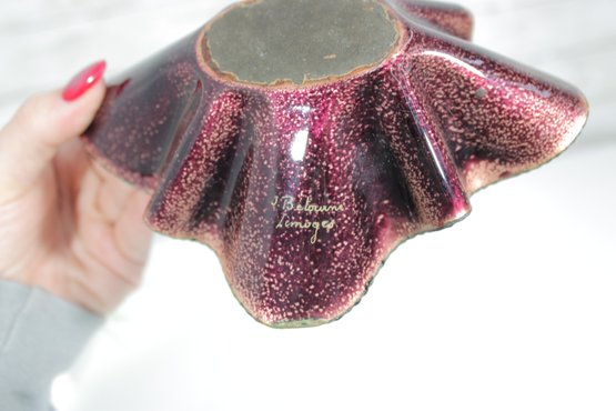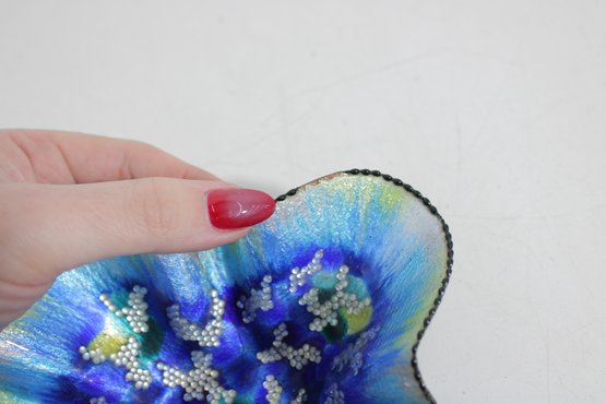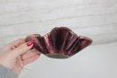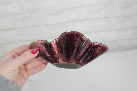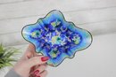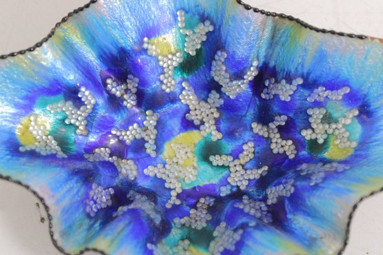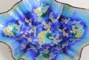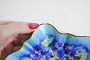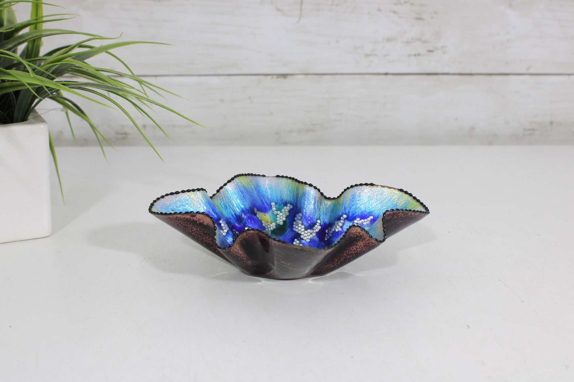 Striking vintage enamel on copper dish featuring a beautifully sculpted organic form with ruffled edges. The interior displays a vivid iridescent palette of blues, greens, and purples with delicate white clustered accents, creating a dynamic, almost floral or crystalline effect. The exterior contrasts with a rich, textured burgundy enamel finish.