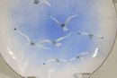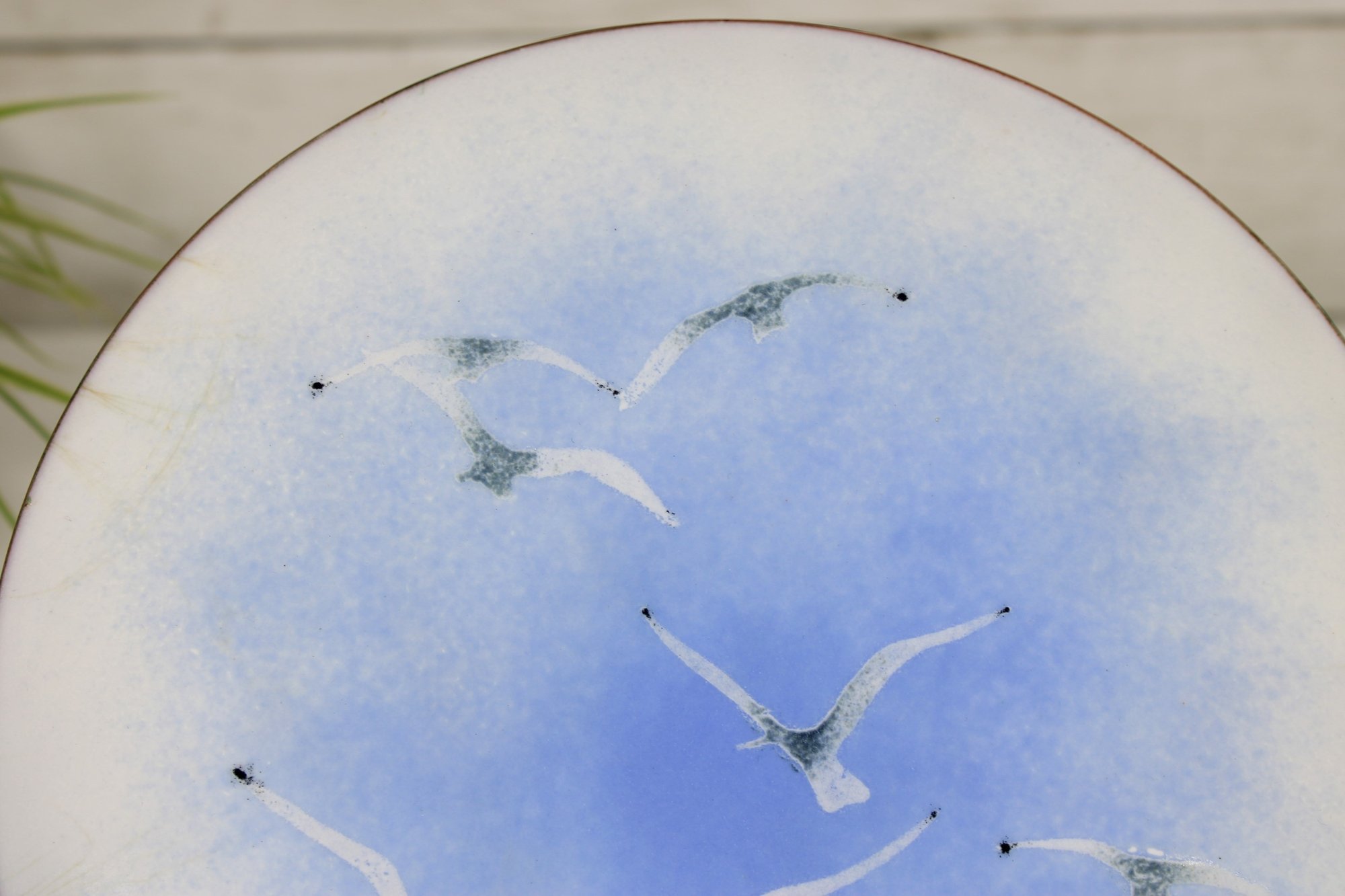 Beautiful vintage enamel on copper plate featuring a serene scene of seagulls gliding across a soft blue sky. This signed piece measures approximately 7.75 inches in diameter and showcases delicate craftsmanship, with finely detailed white birds set against a gradient blue and white enamel background.