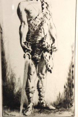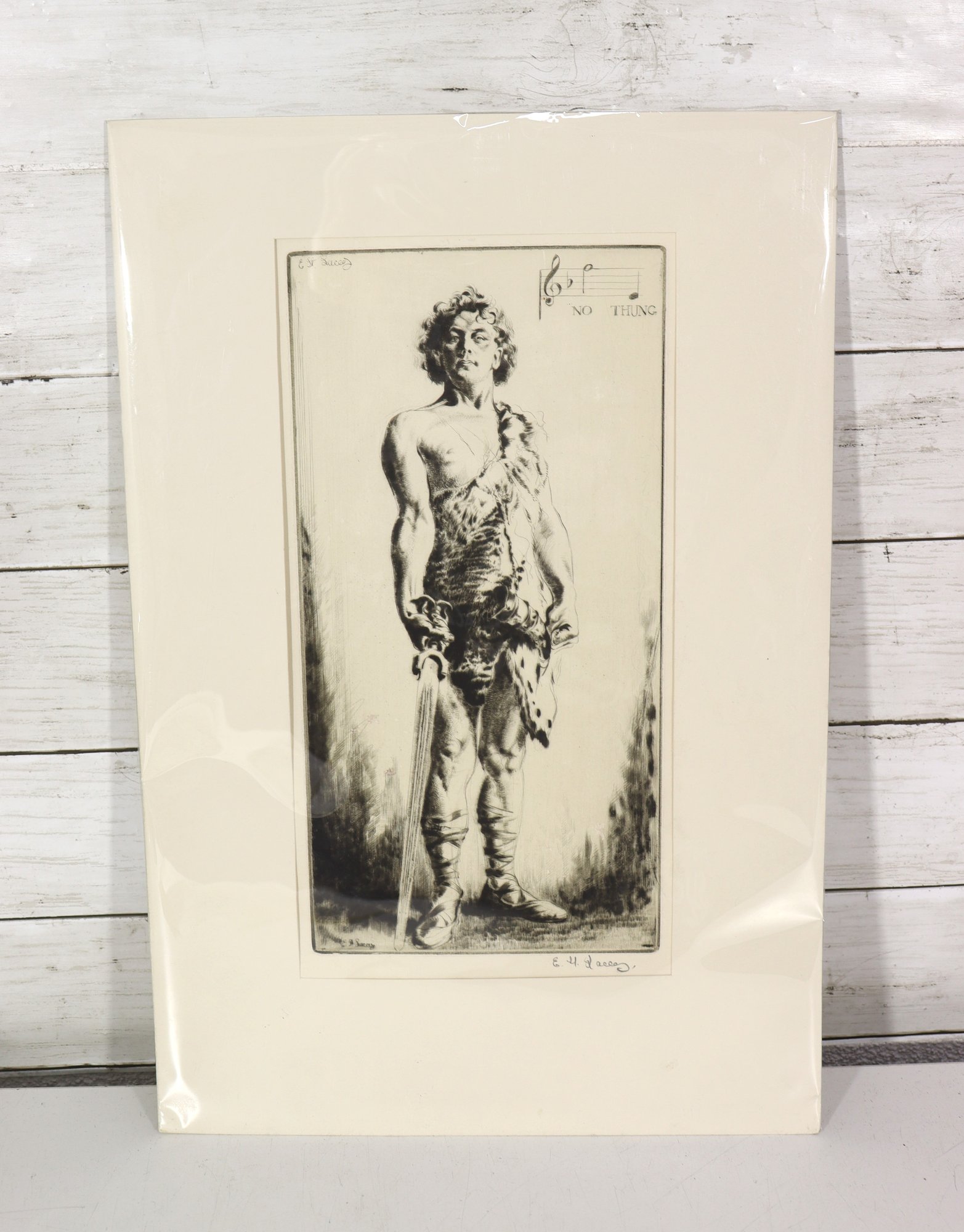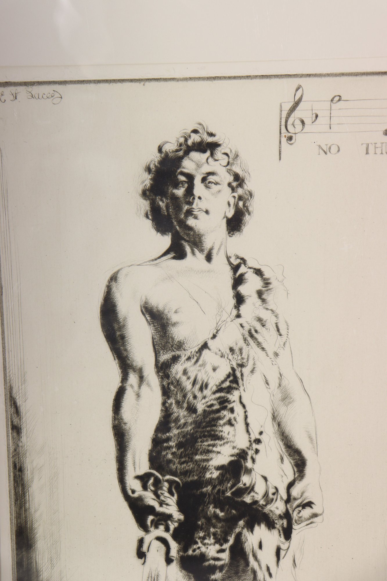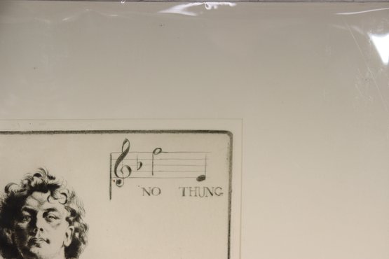 Striking vintage black-and-white etching depicting a young boy standing barefoot/booted in a natural setting, rendered with expressive line work and fine detail. The composition includes a subtle musical notation with the phrase “No Thing” near the upper portion, adding an intriguing symbolic element to the piece.