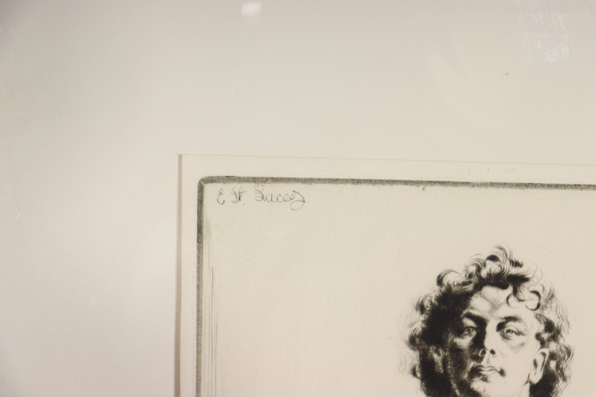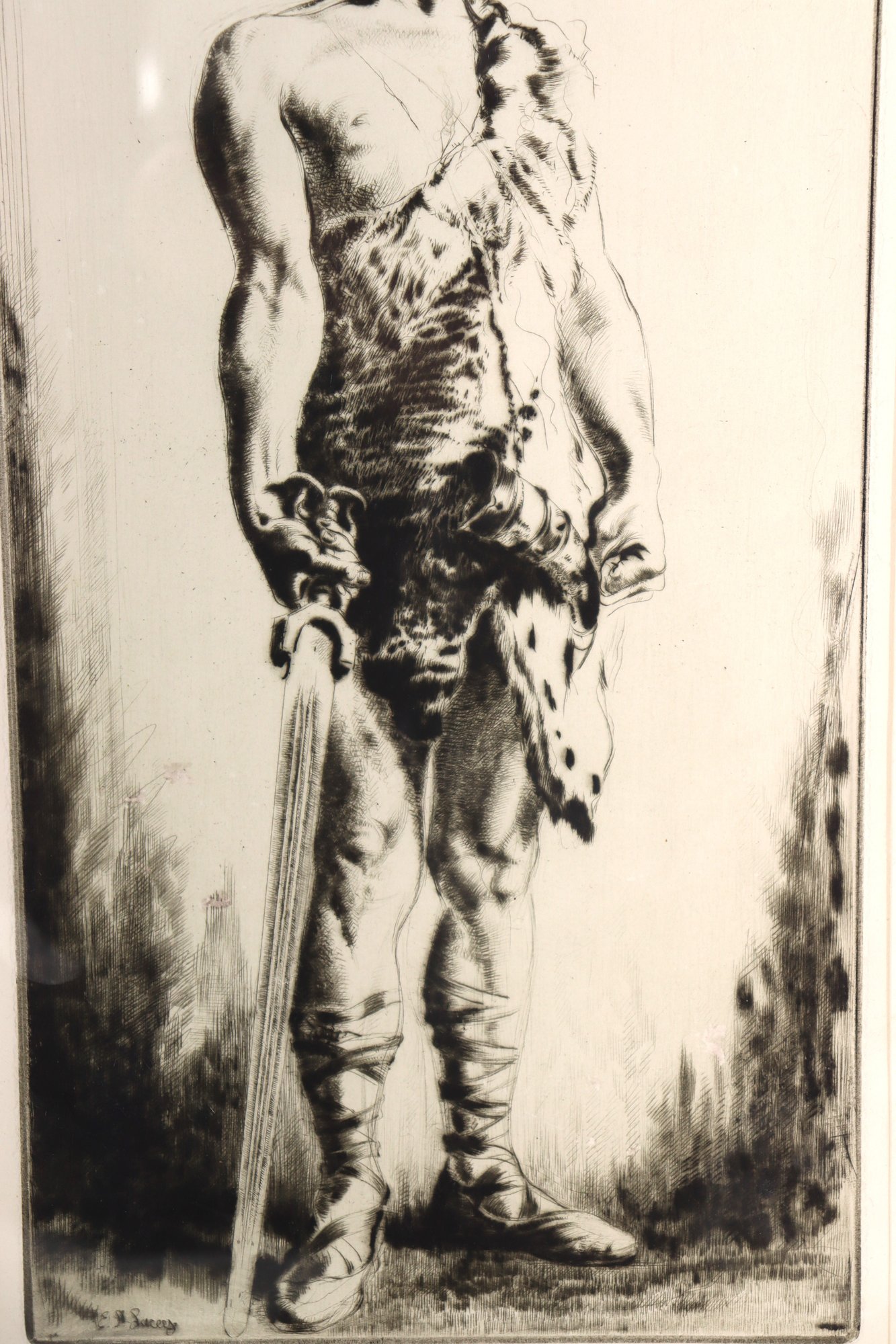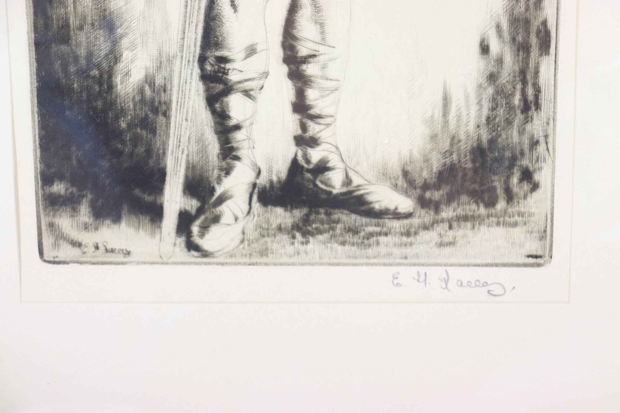 Striking vintage black-and-white etching depicting a young boy standing barefoot/booted in a natural setting, rendered with expressive line work and fine detail. The composition includes a subtle musical notation with the phrase “No Thing” near the upper portion, adding an intriguing symbolic element to the piece.