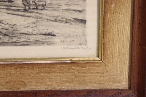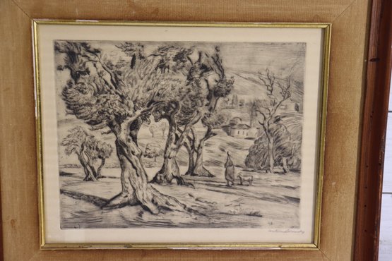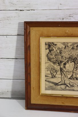 Beautiful vintage pencil / charcoal style landscape sketch featuring large old trees with a shepherd and animals in a countryside setting. This drawing is signed in the lower right corner (see close-up photos). Lovely tonal shading, detailed tree textures and a classic pastoral composition give this artwork a timeless traditional feel.