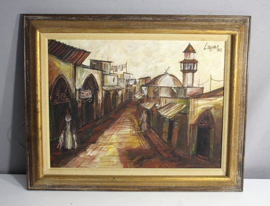 Capture the essence of a bustling Middle Eastern street with this signed painting by artist Lazar, dated 966. This vibrant piece showcases a detailed marketplace scene featuring domed architecture, arched doorways, and figures in traditional attire, inviting viewers into a world rich with cultural ambiance. Housed in a gilded frame that complements its warm tones, this artwork adds an exotic charm to any space. The painting is signed “Lazar 966” in the upper right corner, denoting its age and authenticity. A perfect addition for collectors of vintage Middle Eastern art or unique travel-inspired décor.