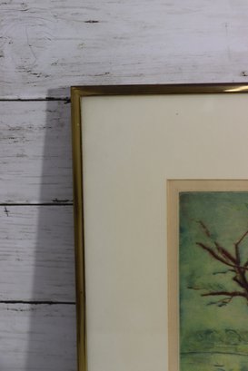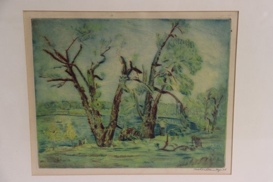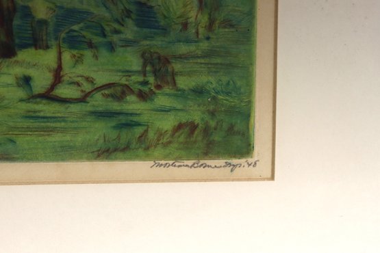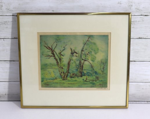 Beautiful vintage hand-done landscape artwork in soft greens and earth tones featuring trees in a countryside setting. This piece appears to be created in pastel or colored pencil medium and is signed in the lower right corner (artist signature present – see photos). Lovely impressionist style with soft blending and scenic rural charm.