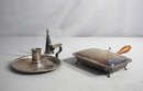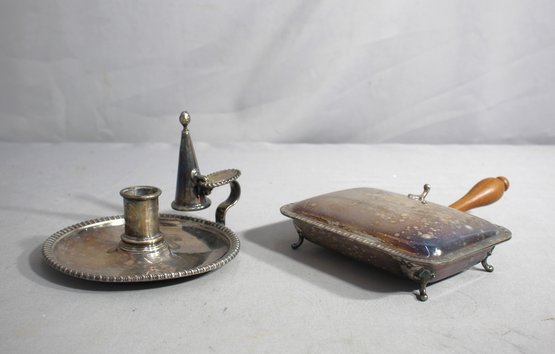 perfect for adding a touch of traditional charm to any setting. The silent butler, often used for tableside service, features a hinged lid with an ornate handle for easy carrying, and a body showcasing a patina that tells the story of its past. The accompanying silver-plated candlestick holder exudes classic beauty with its detailed design and robust silhouette.
