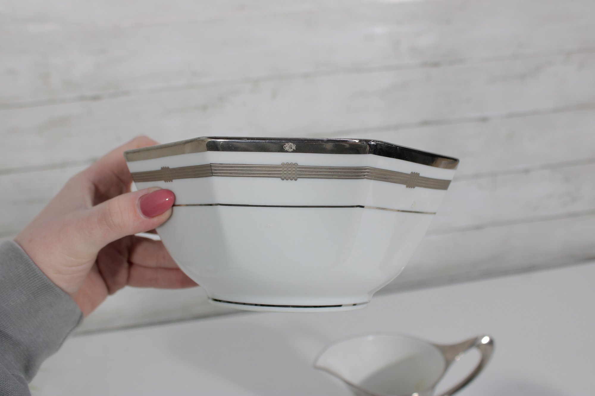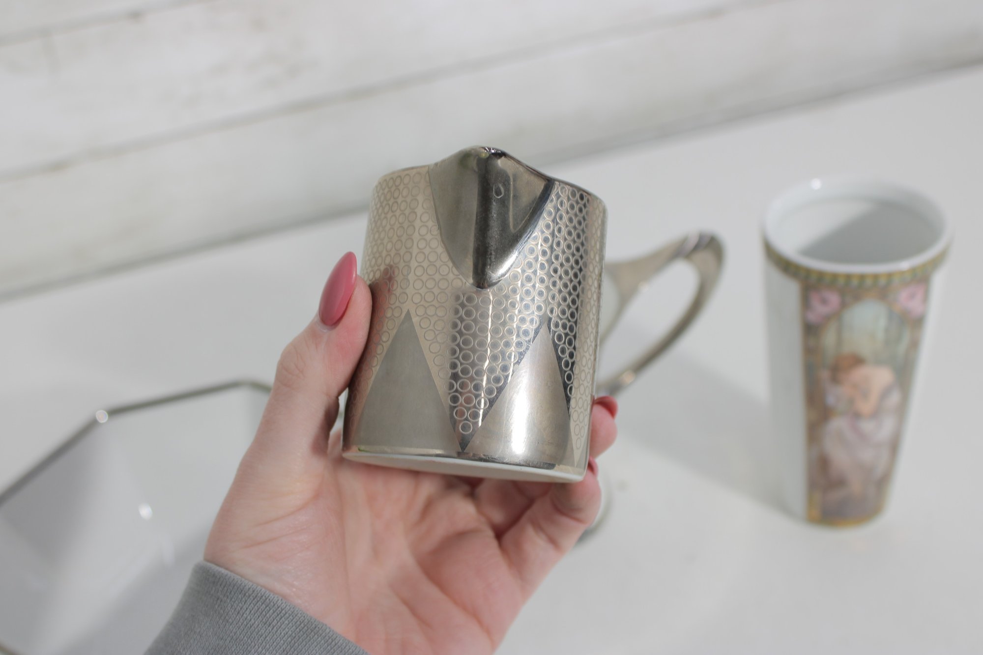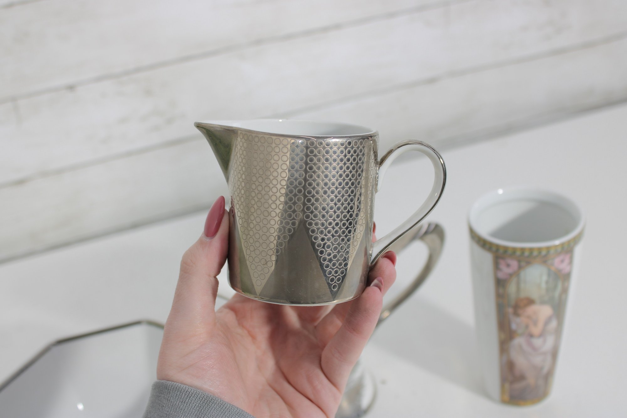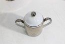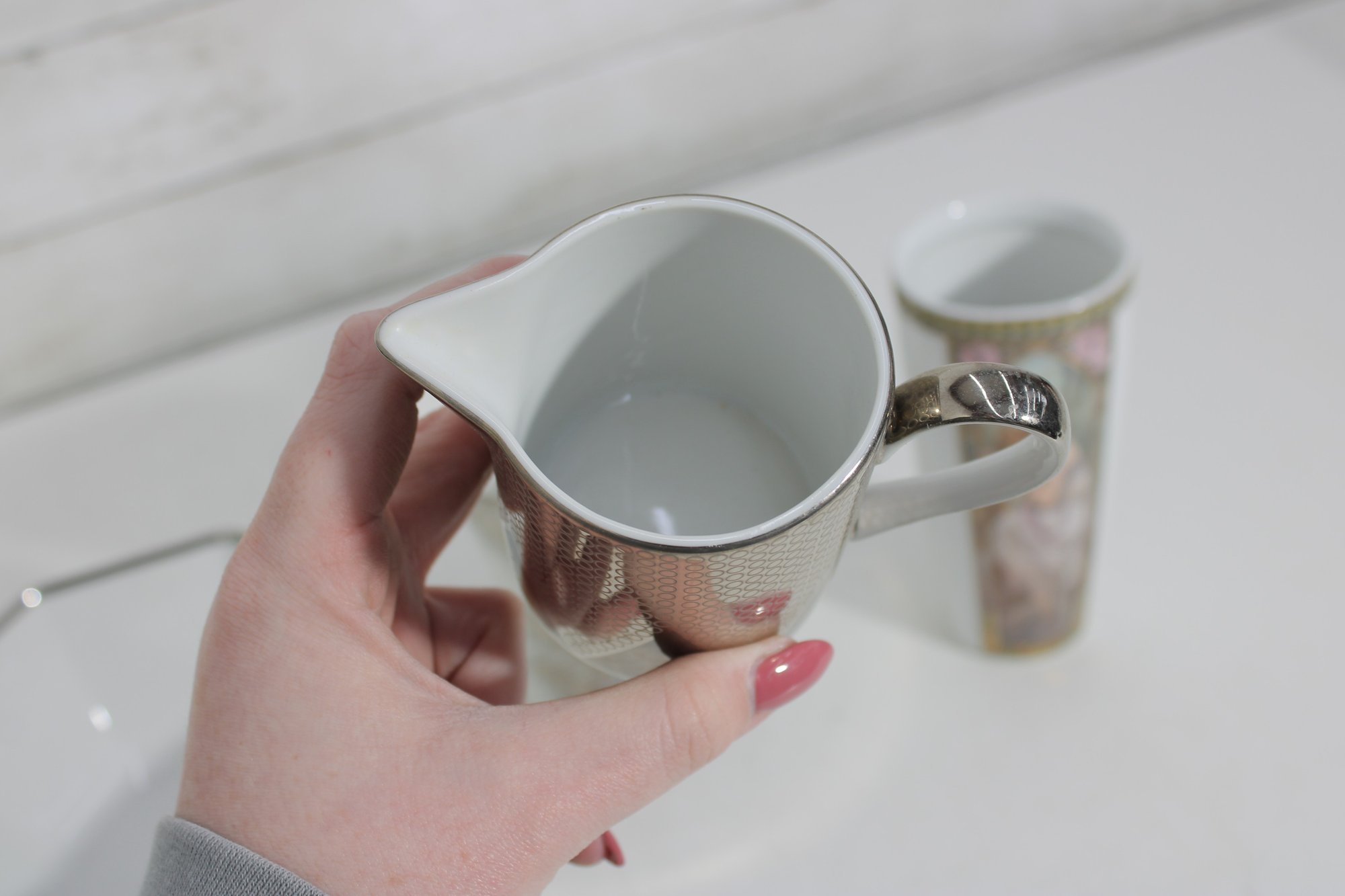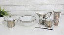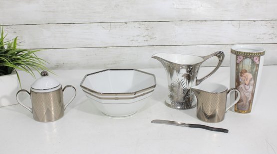 Vintage Silver Plate & Porcelain Serving Lot Creamer, Sugar Bowl, Mugs, Bowl & Knife Mixed Group