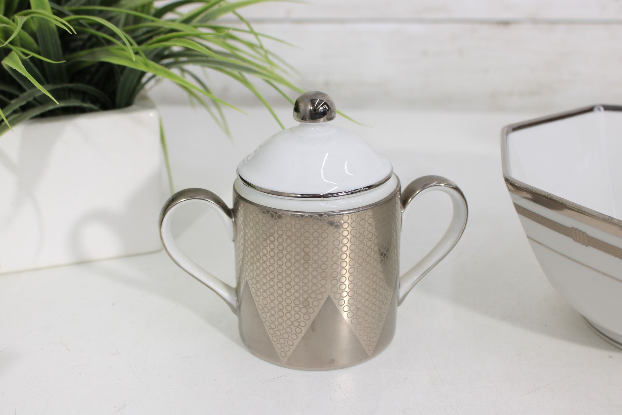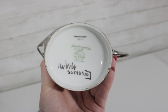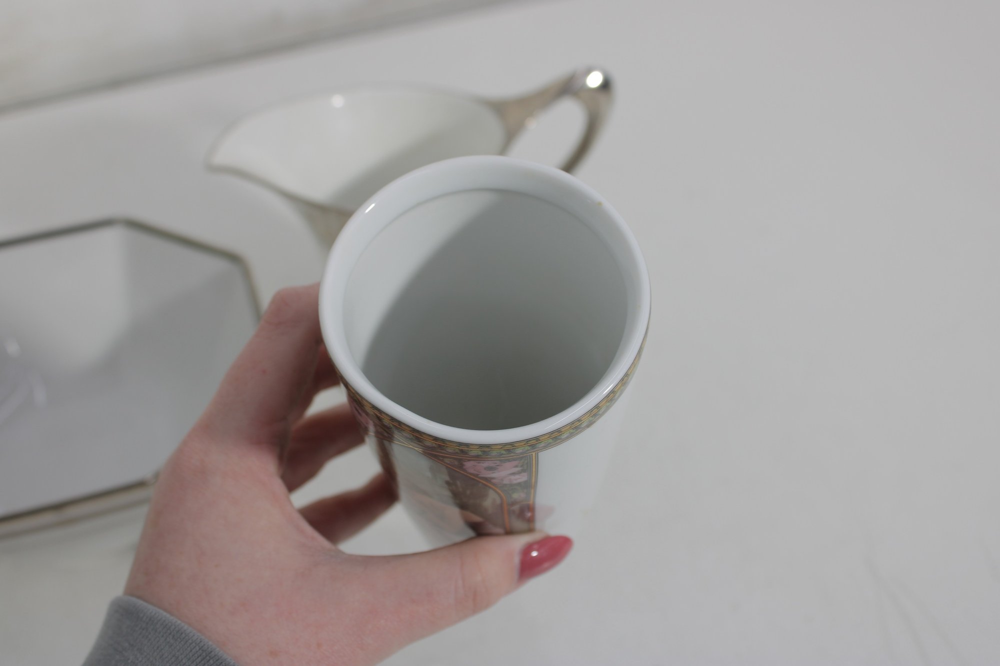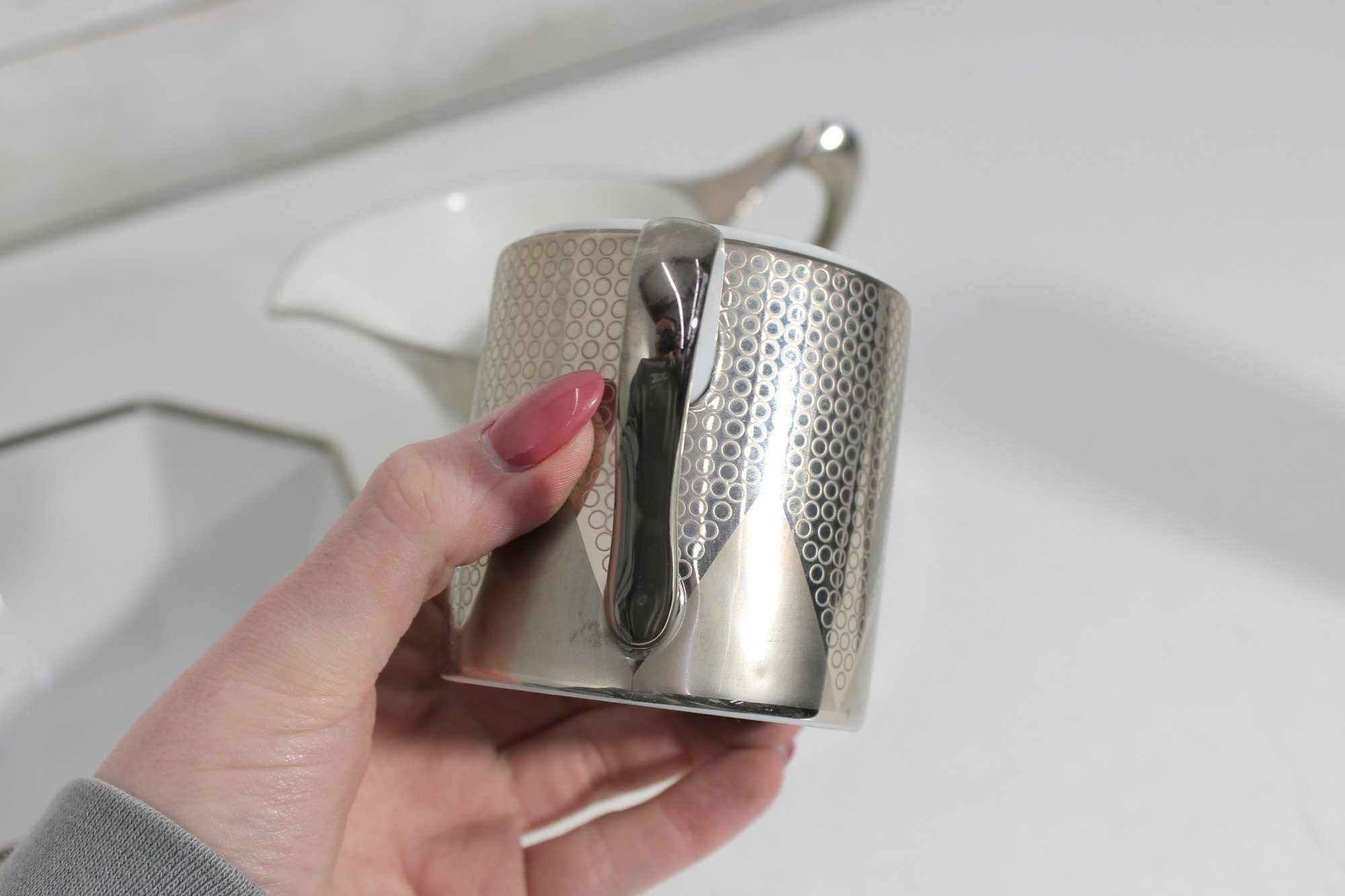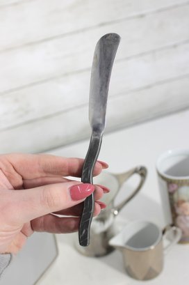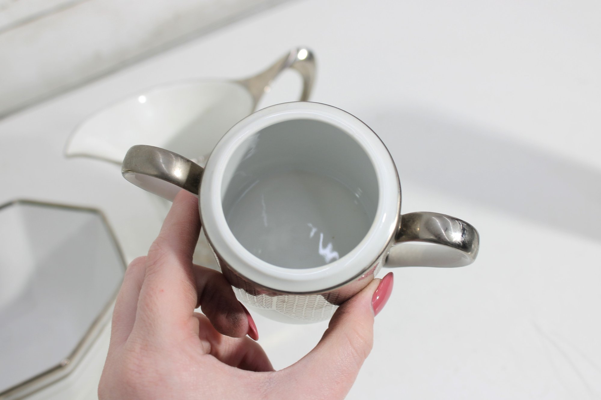 Vintage Silver Plate & Porcelain Serving Lot Creamer, Sugar Bowl, Mugs, Bowl & Knife Mixed Group