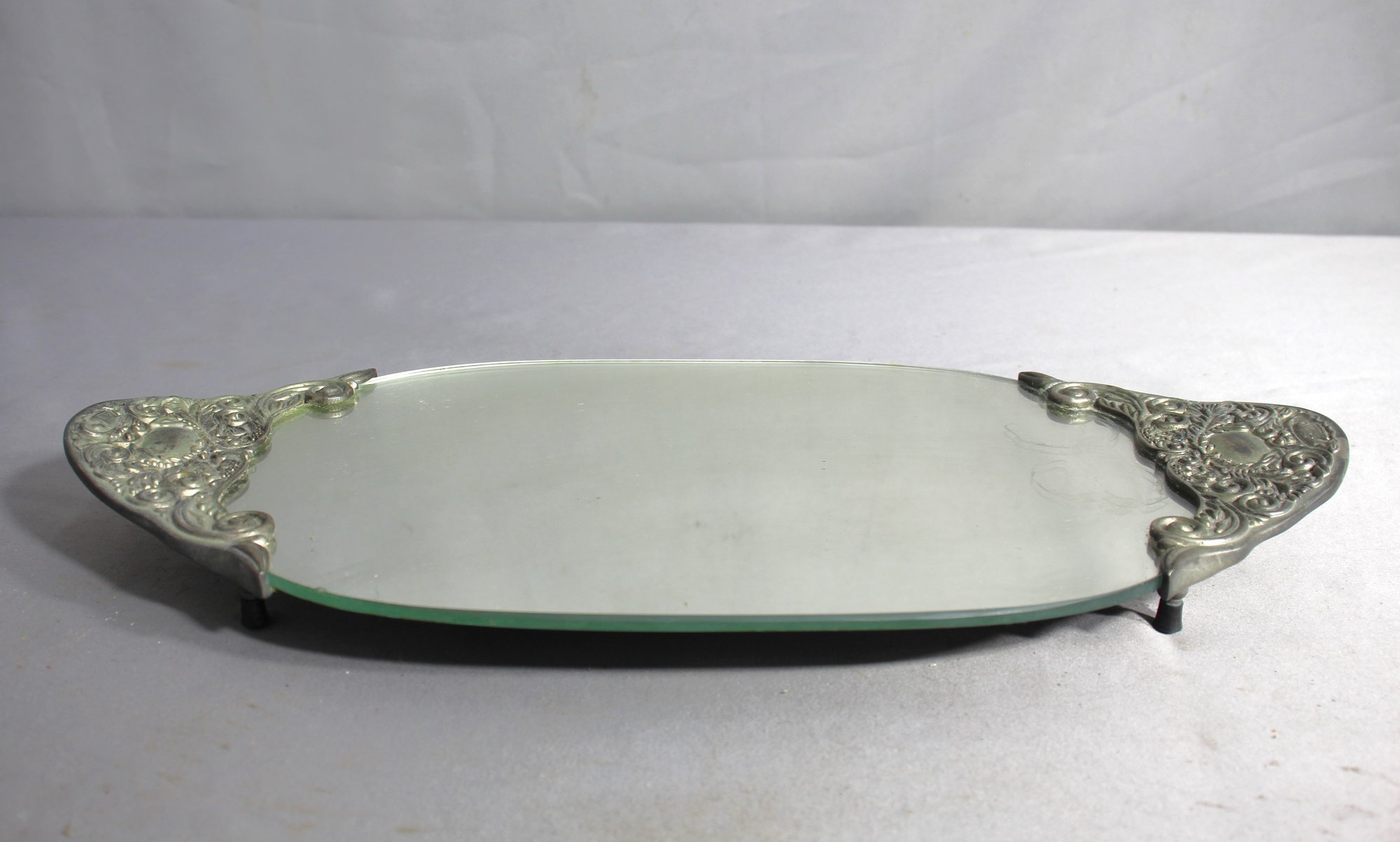 Vintage Silver-Plated Mirrored Vanity Tray With Ornate Handles 15.5"x 7"