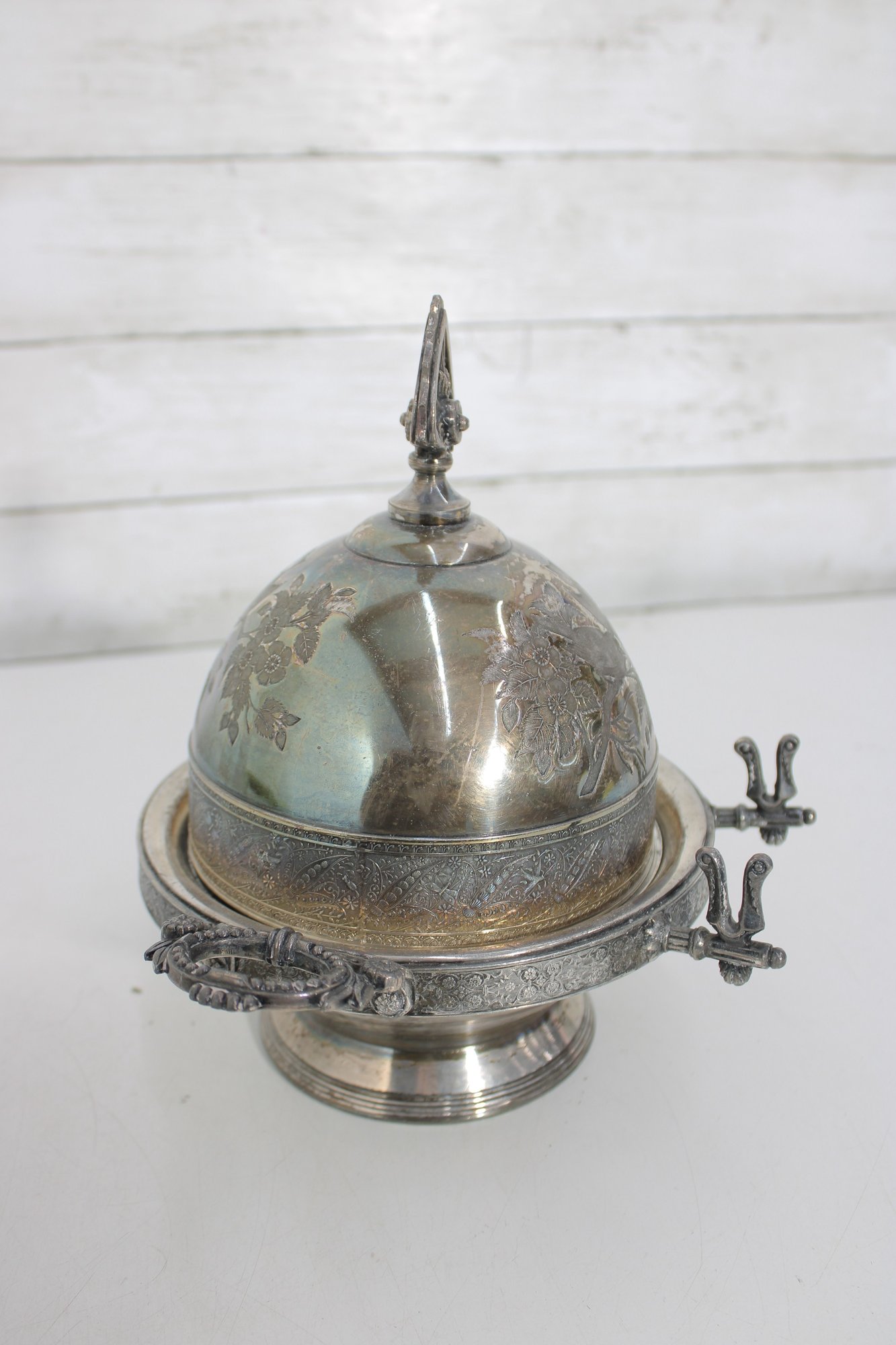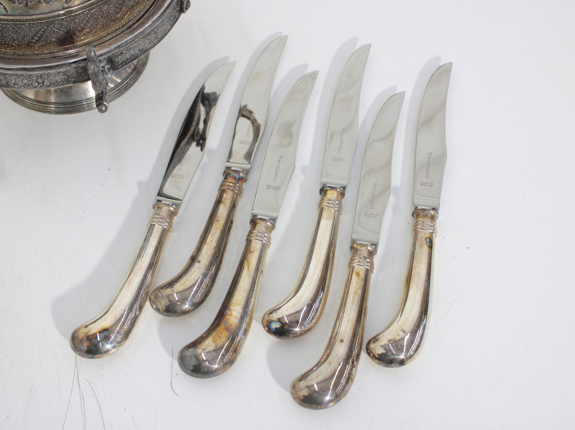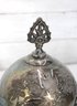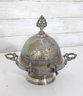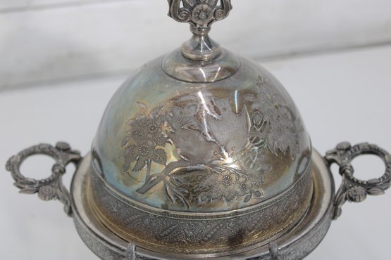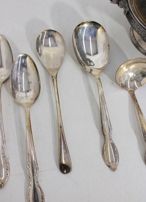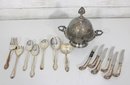 Assorted vintage silverplate mix lot featuring a variety of flatware and a decorative lidded serving dish. This eclectic group includes curved-handle dinner knives, assorted spoons and forks, and an ornate handled lidded bowl or butter dish with engraved detailing and finial top.
