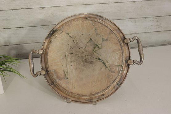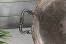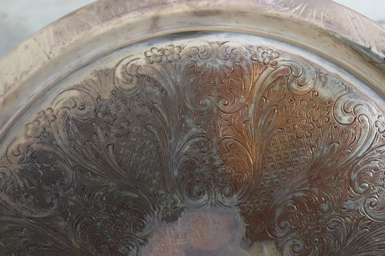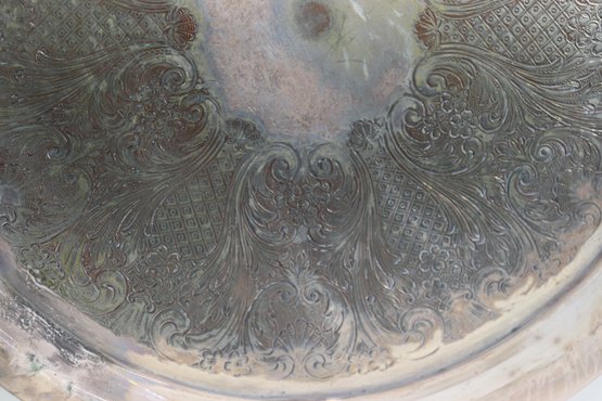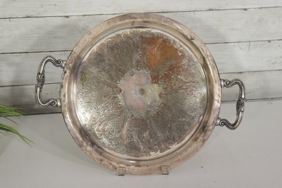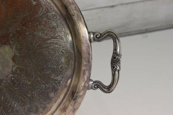 Beautiful vintage silverplate serving tray with ornate etched floral design and decorative side handles. Tray measures approx. 13” round (not including handle width) and features an elegant raised rim and classic scroll style handles. Marked on underside as shown.
