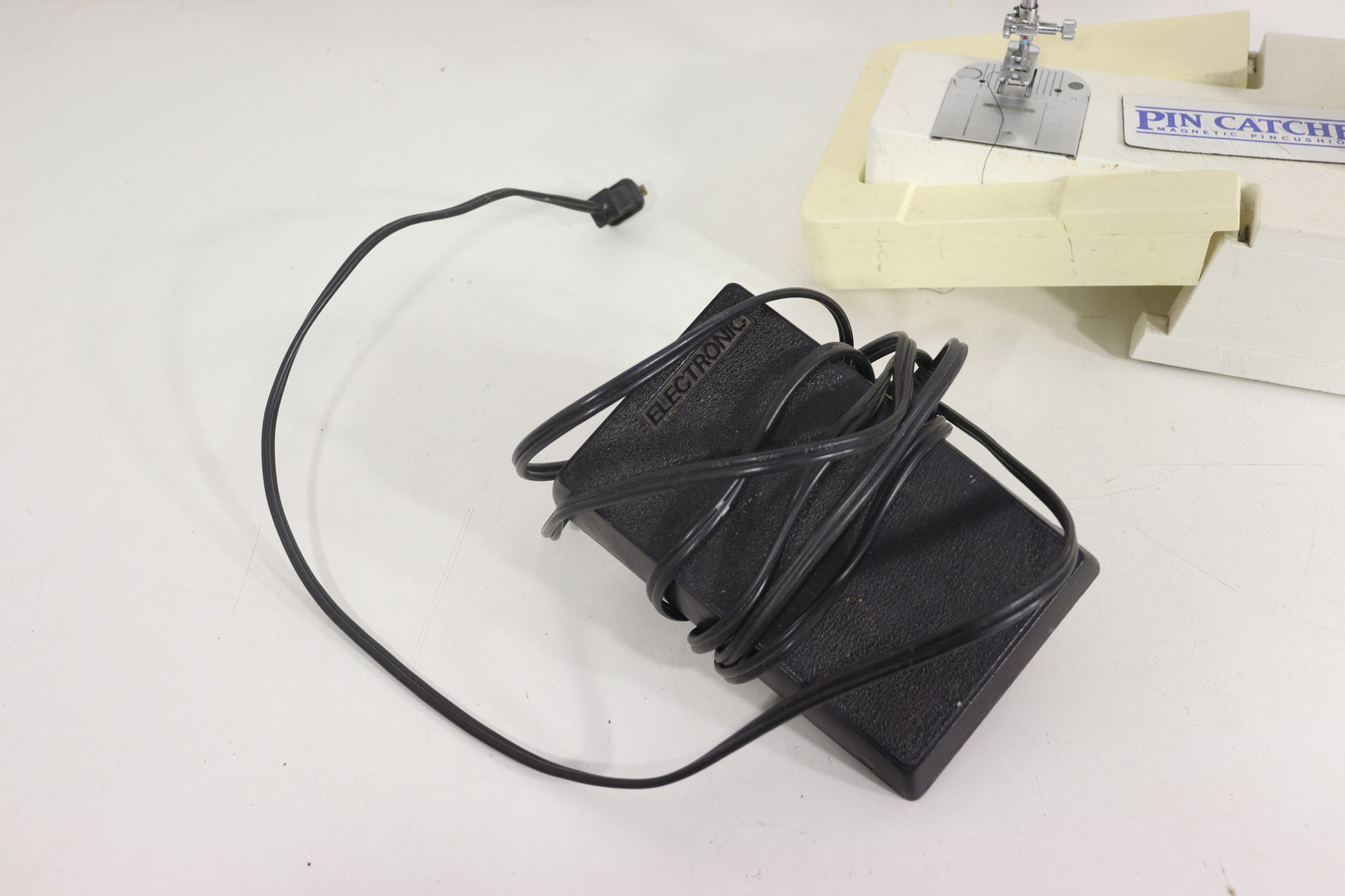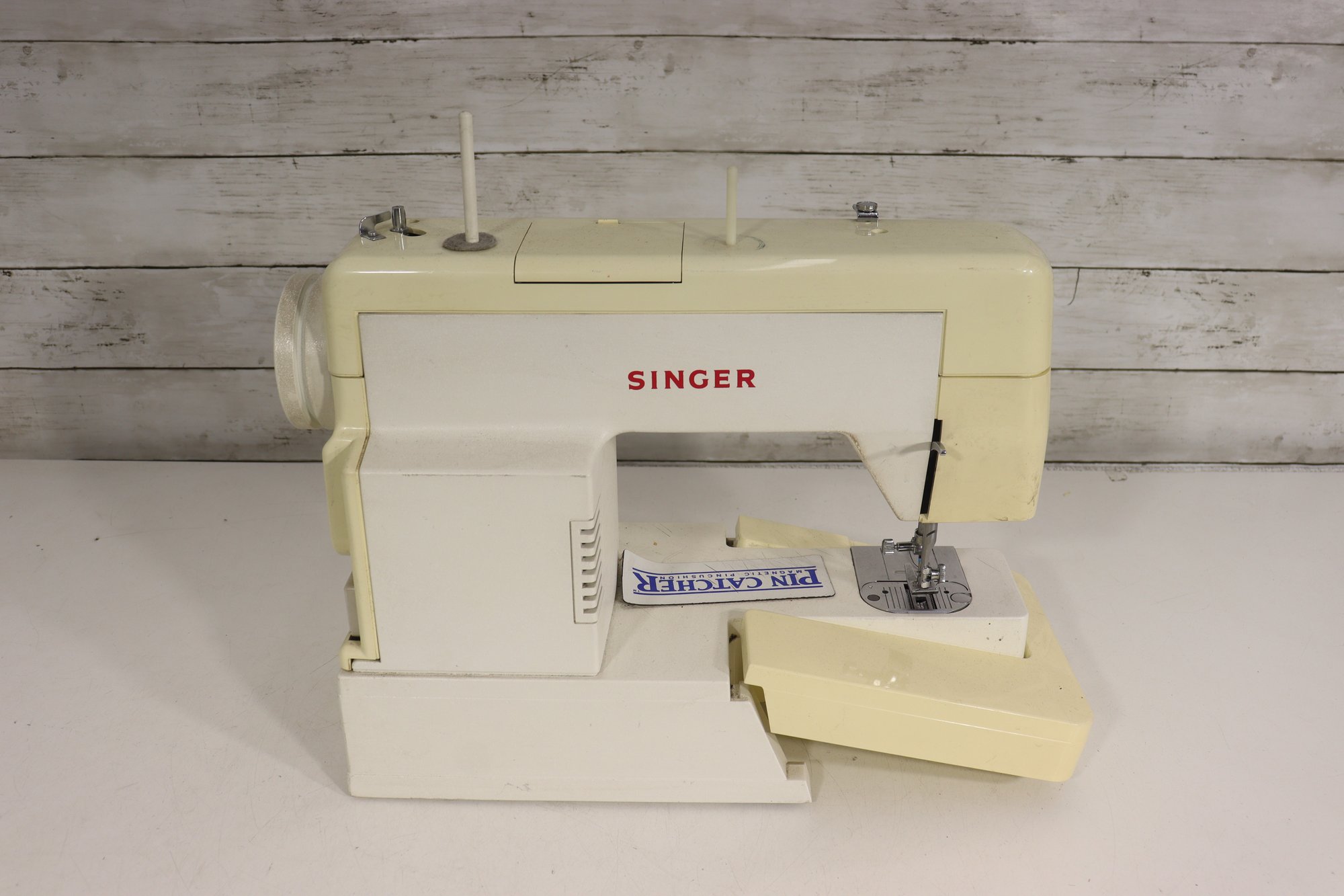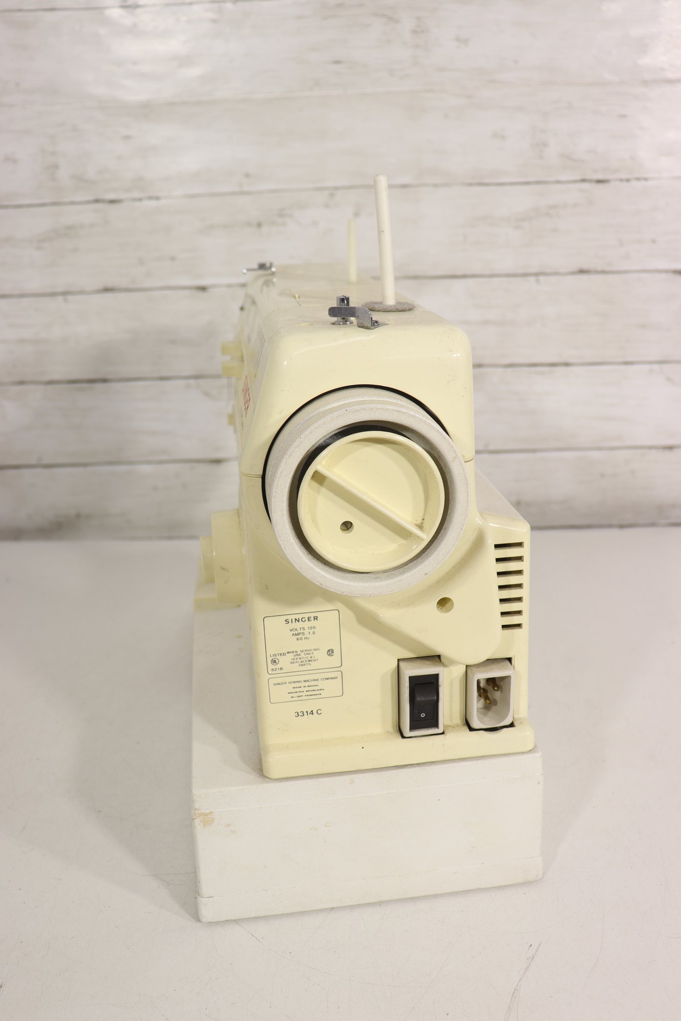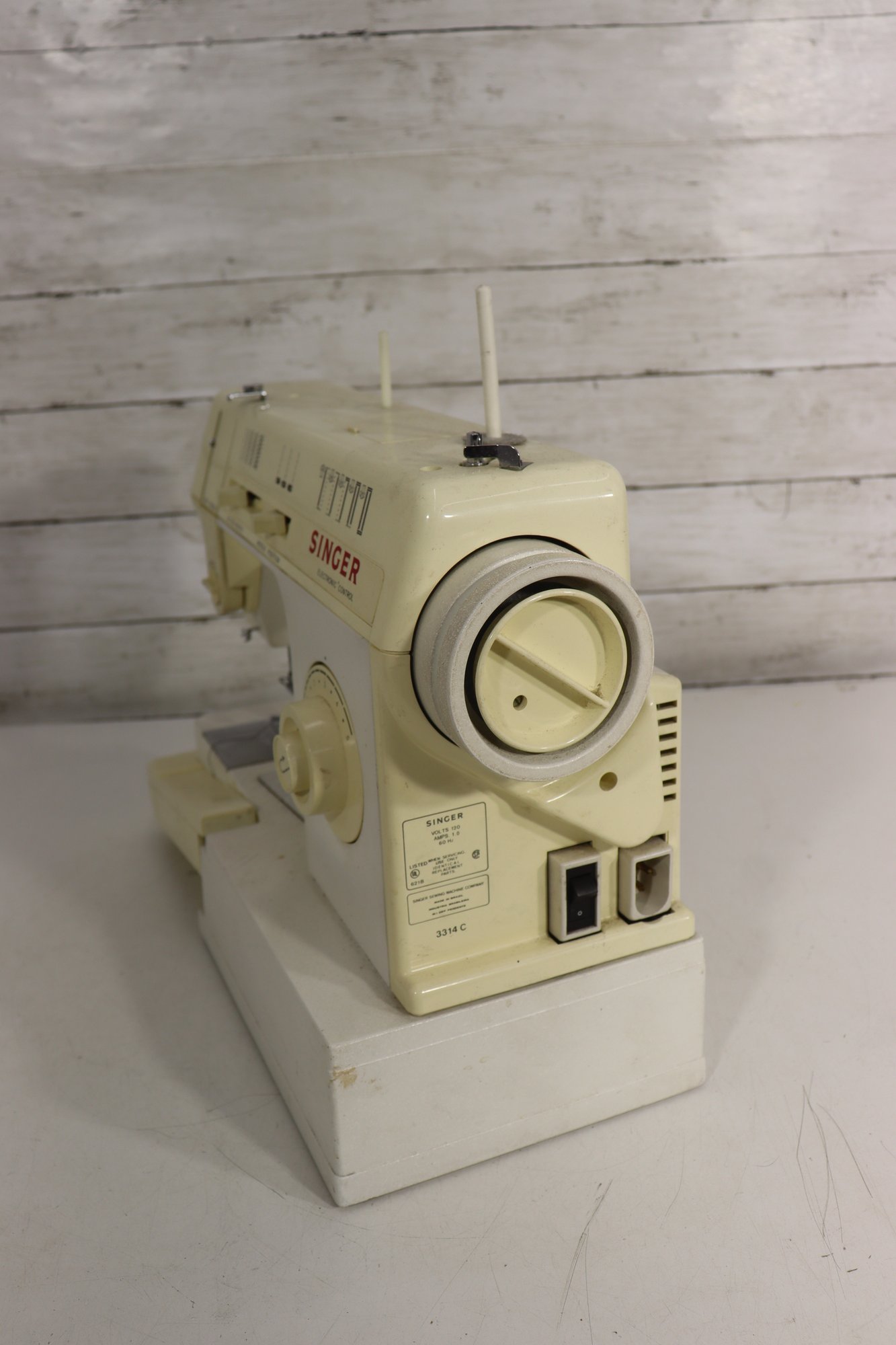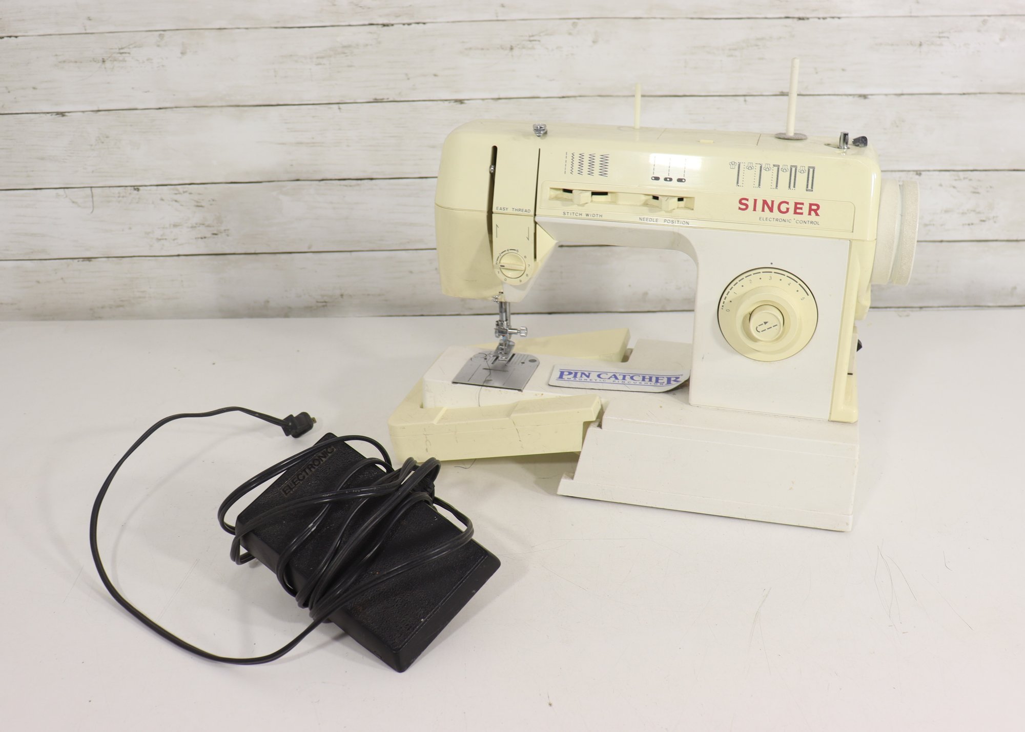 vintage Singer sewing machine in its original off-white/cream finish. This machine includes the original foot pedal and power cord, as shown in the photos.