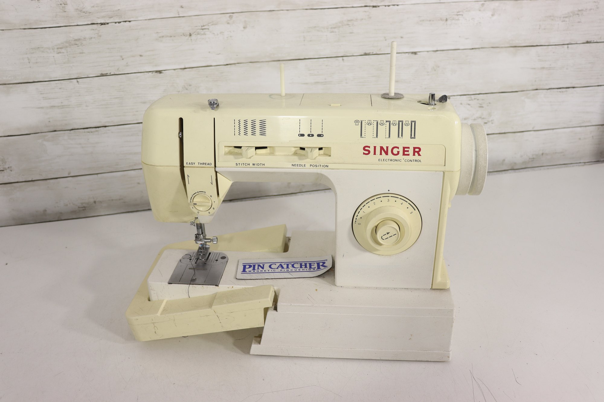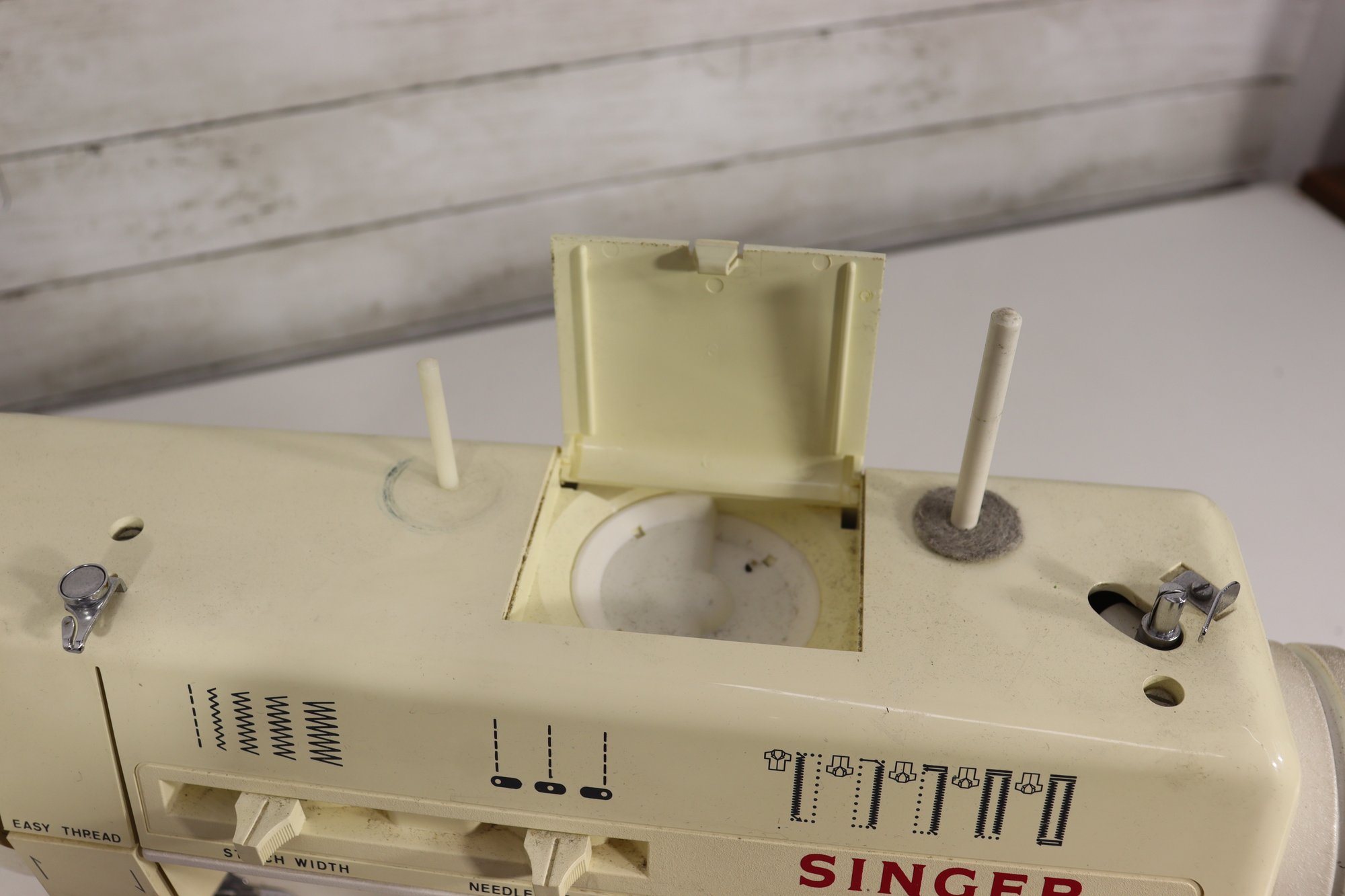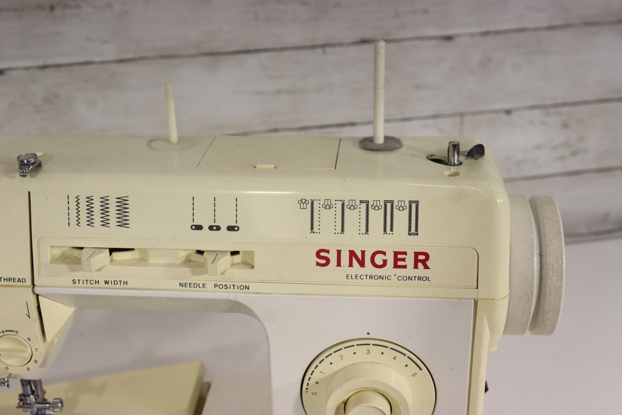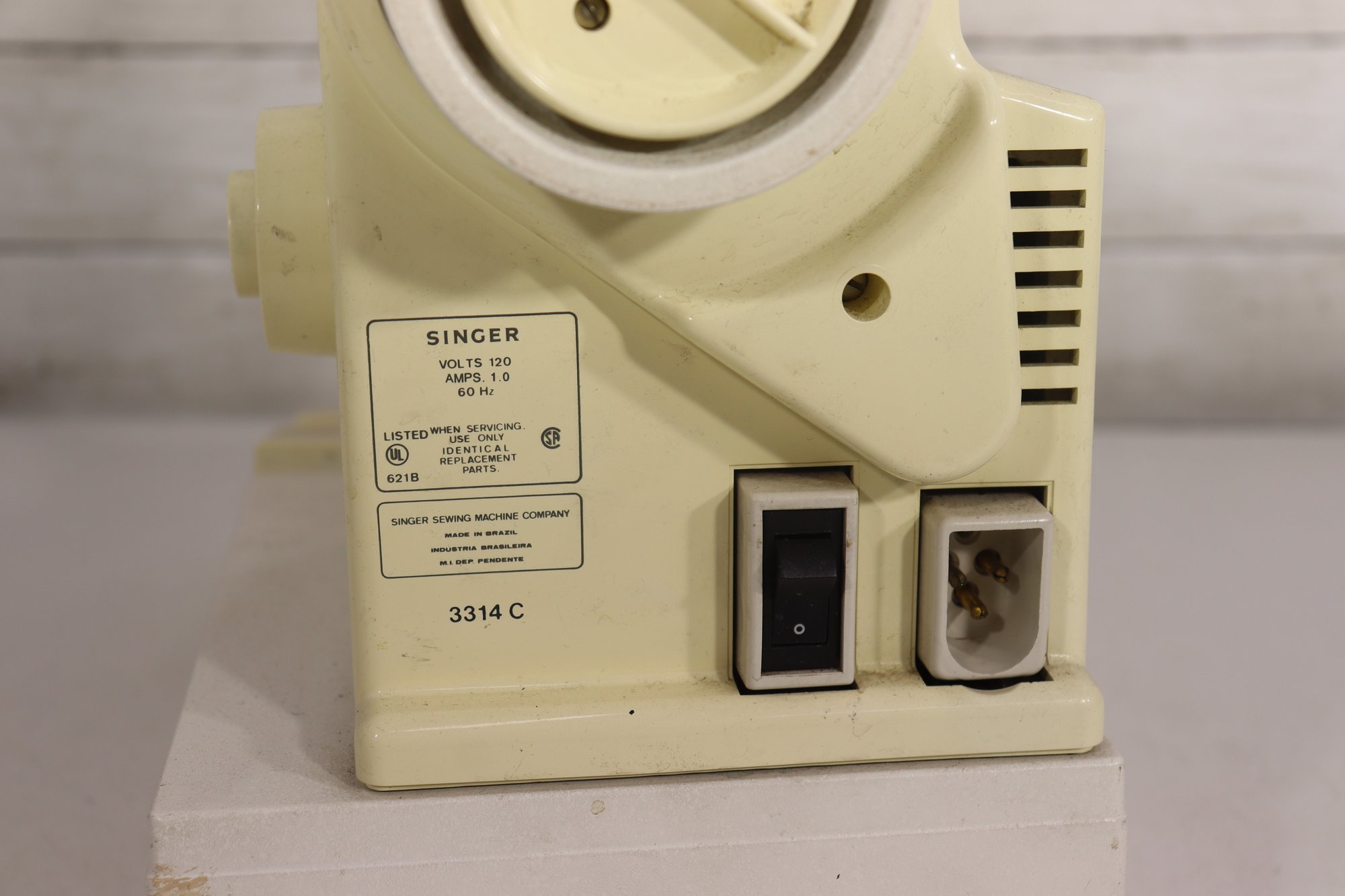 vintage Singer sewing machine in its original off-white/cream finish. This machine includes the original foot pedal and power cord, as shown in the photos.