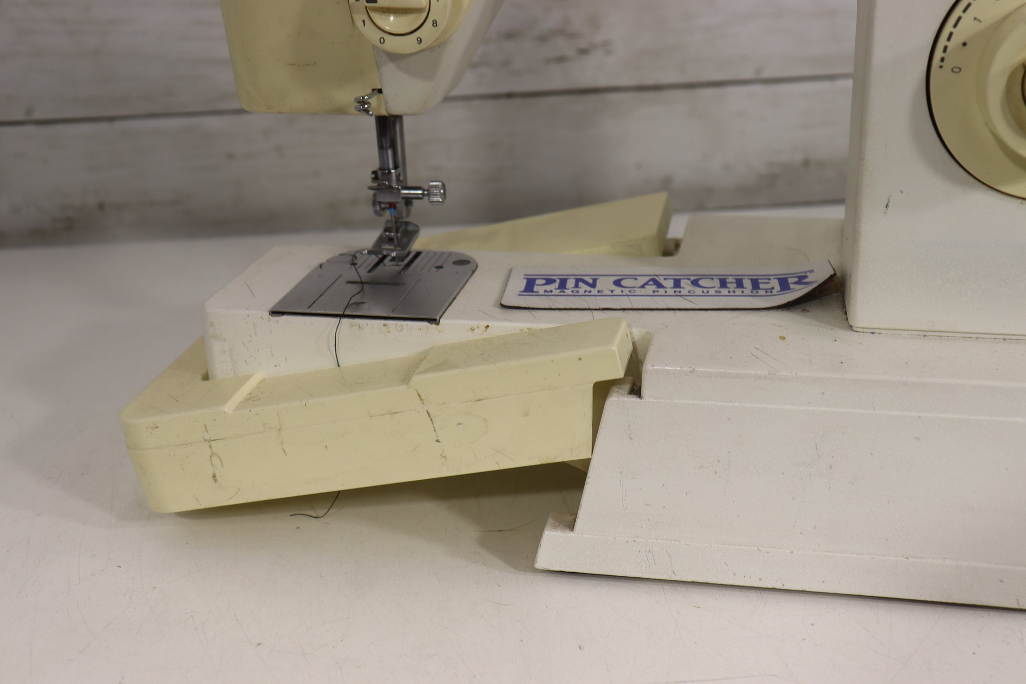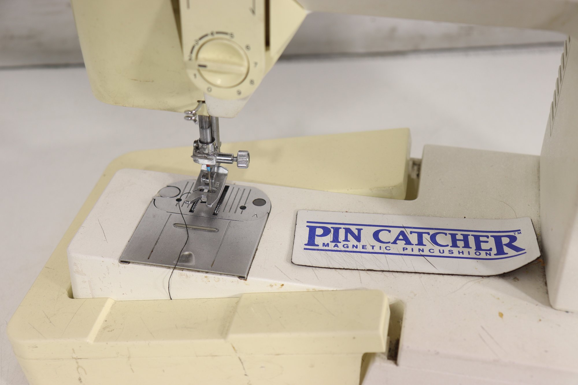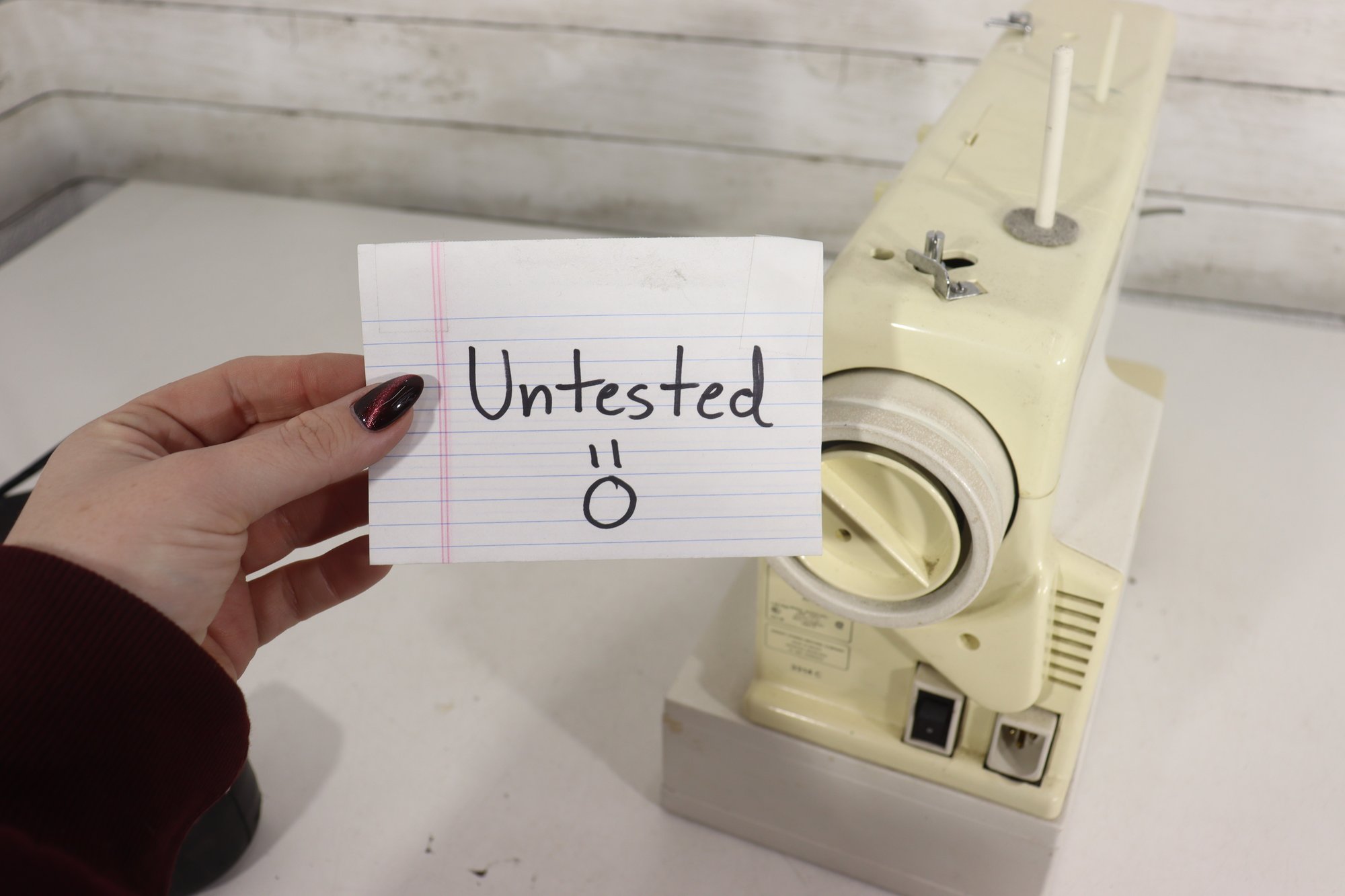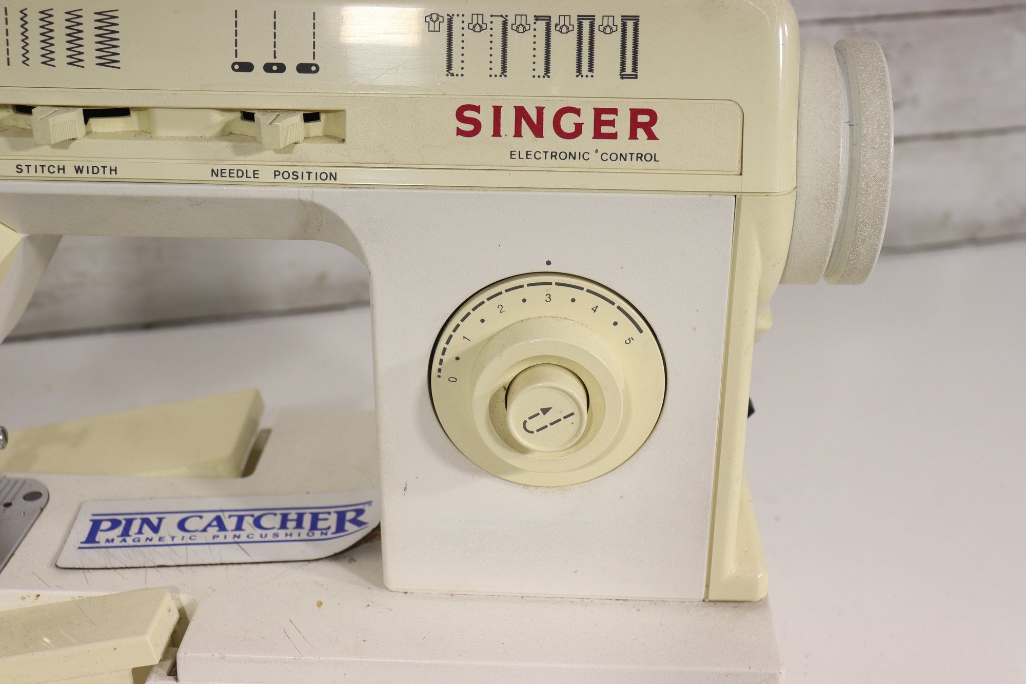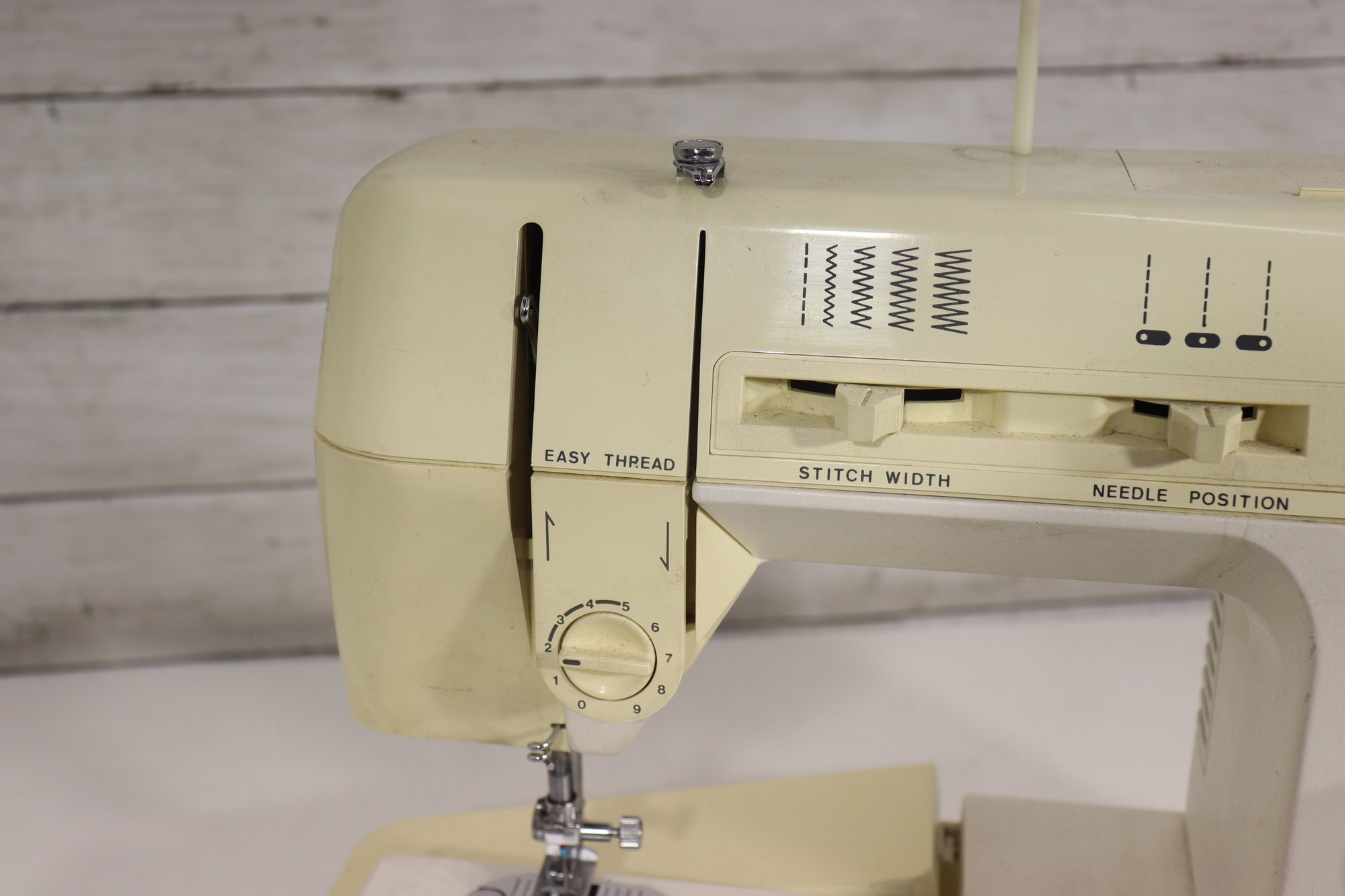 vintage Singer sewing machine in its original off-white/cream finish. This machine includes the original foot pedal and power cord, as shown in the photos.