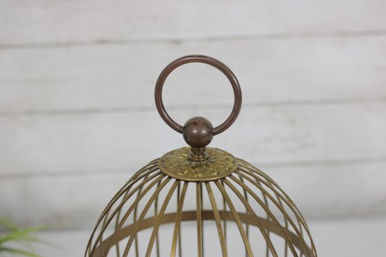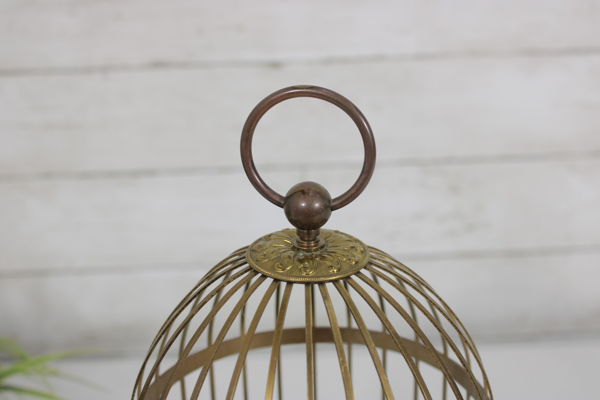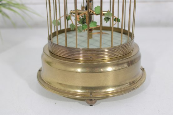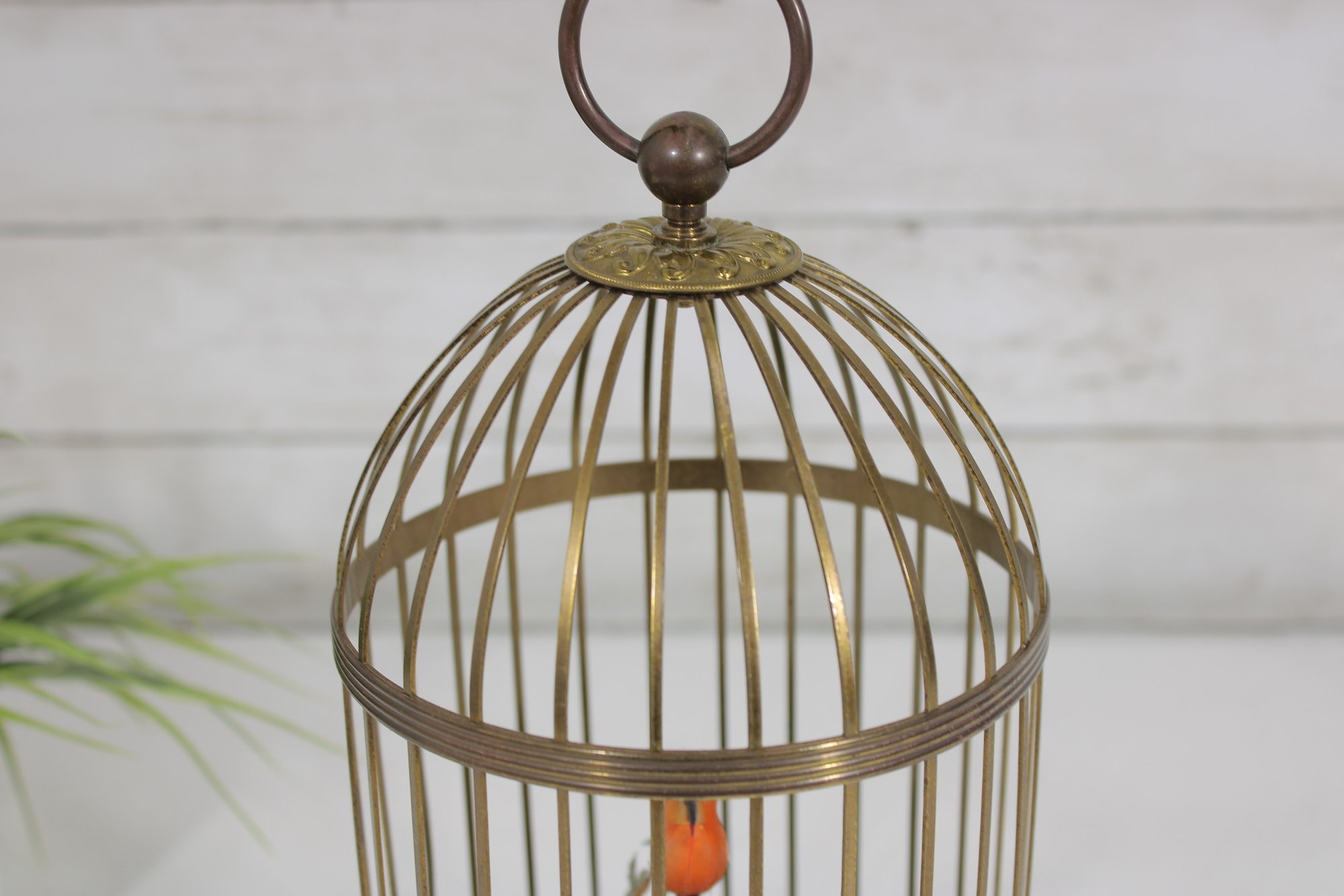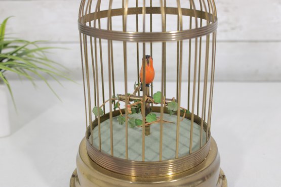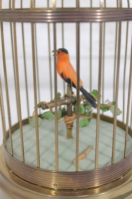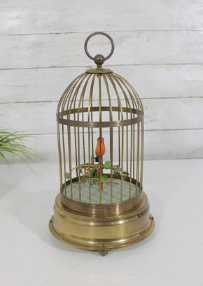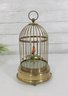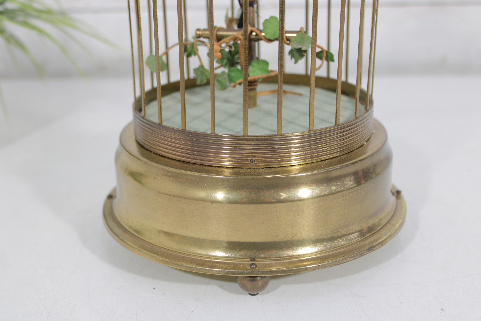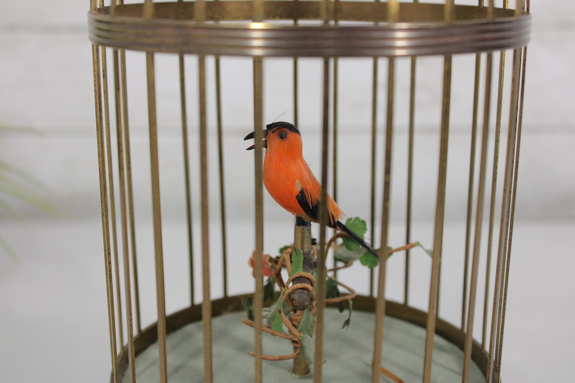 The piece features a domed brass cage with hanging loop and a round base, making it a lovely decorative display object even when not in operation. These musical bird automata were popular collectible novelty items and are admired for their intricate design and craftsmanship.
