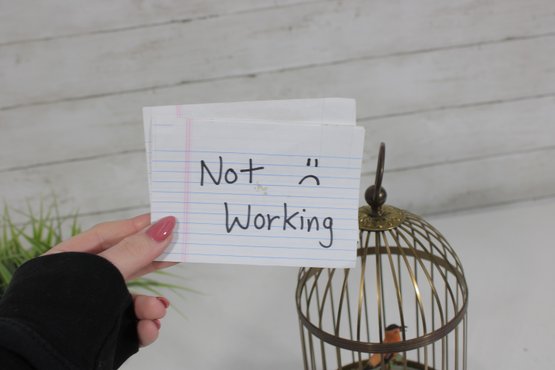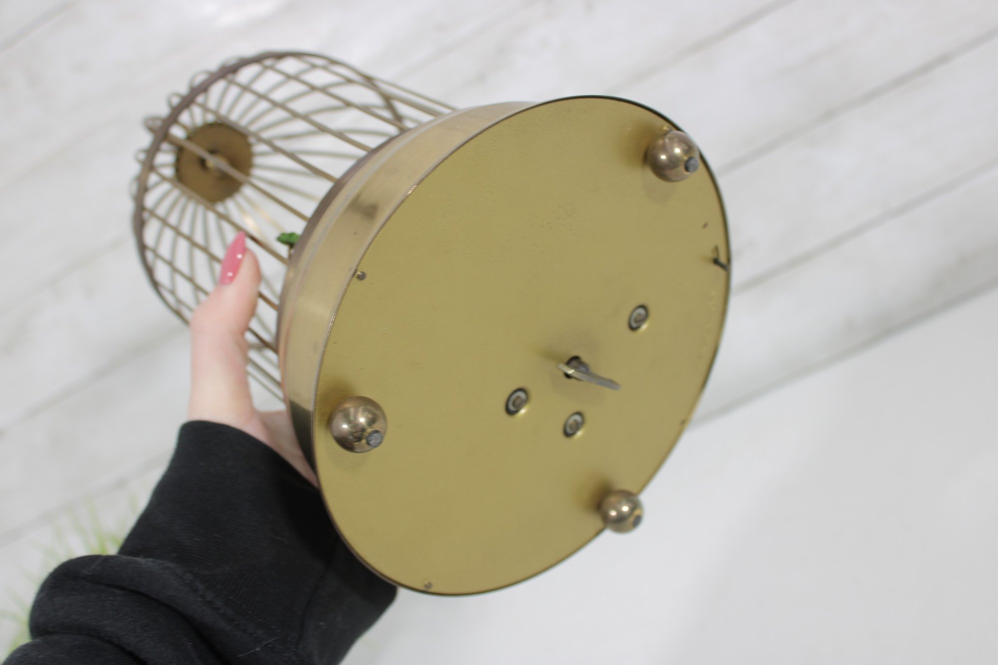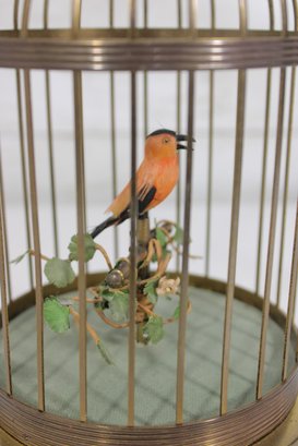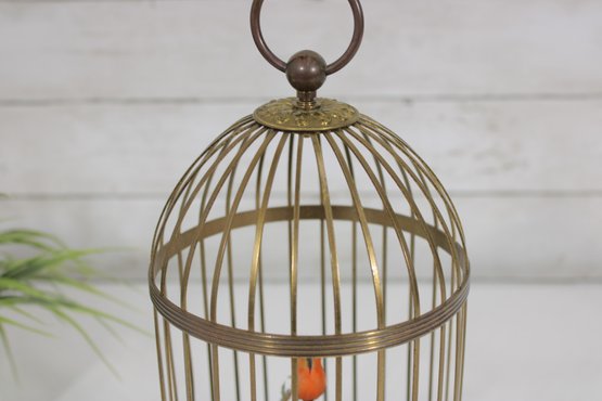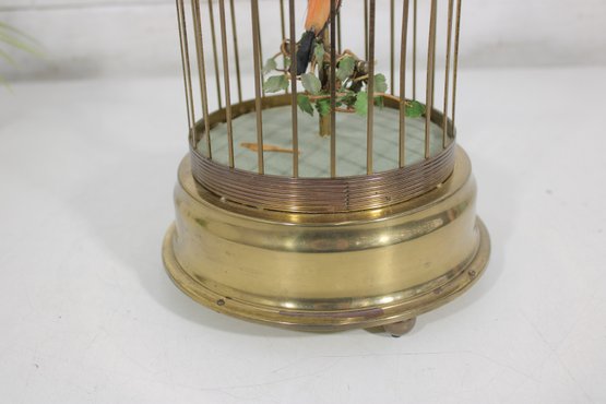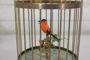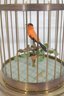 Charming vintage mechanical singing bird automaton housed in a decorative brass birdcage. Inside the cage is a colorful bird perched on a branch with small foliage details, designed to move and sing when functioning.