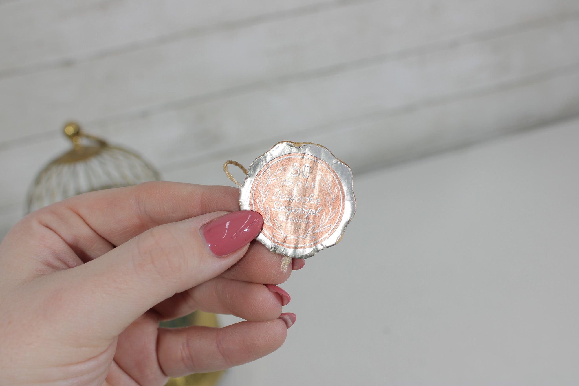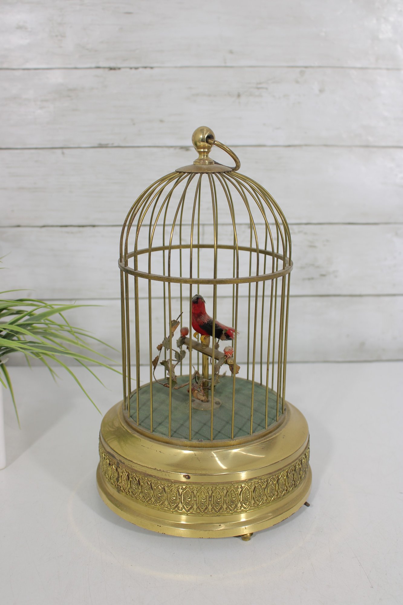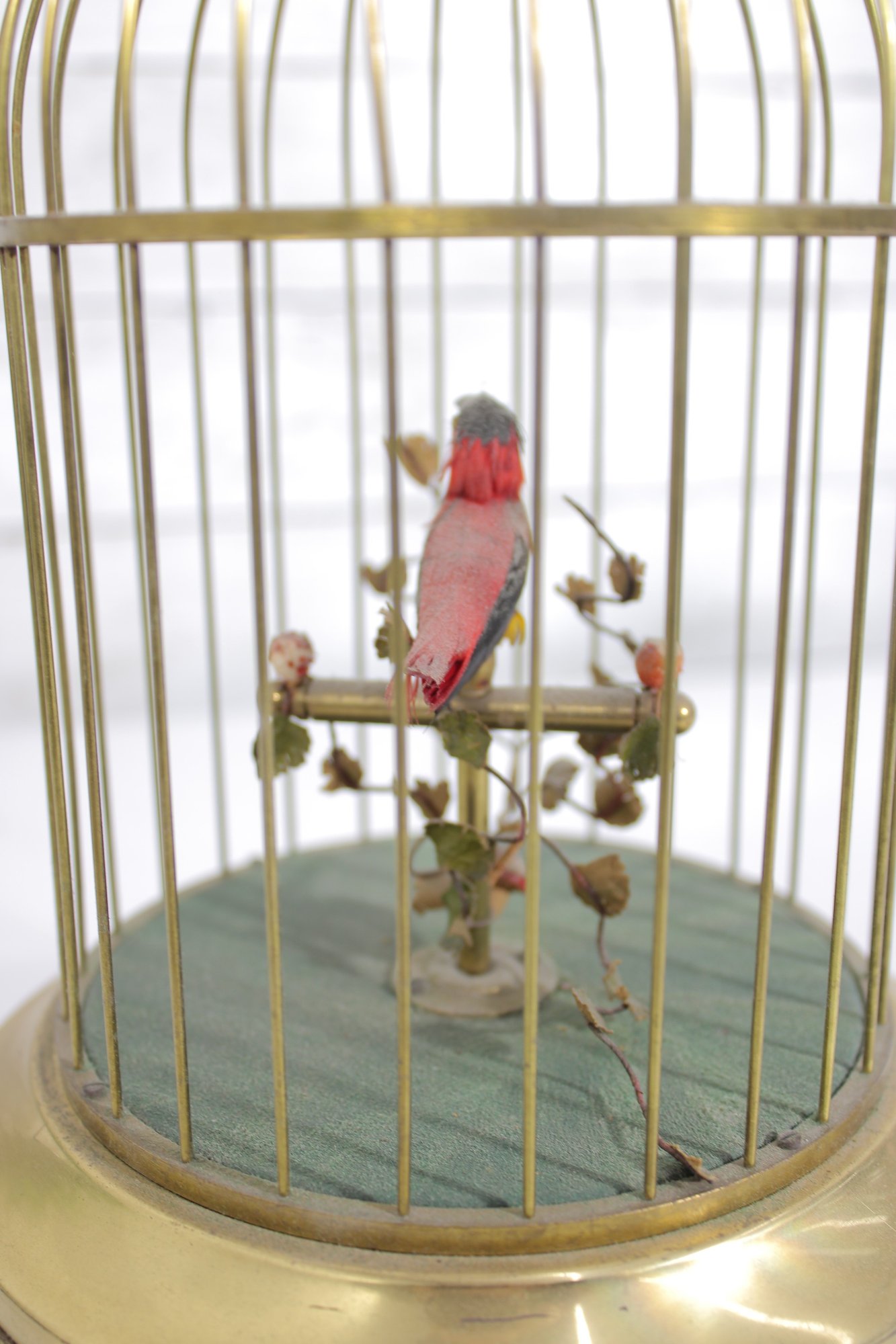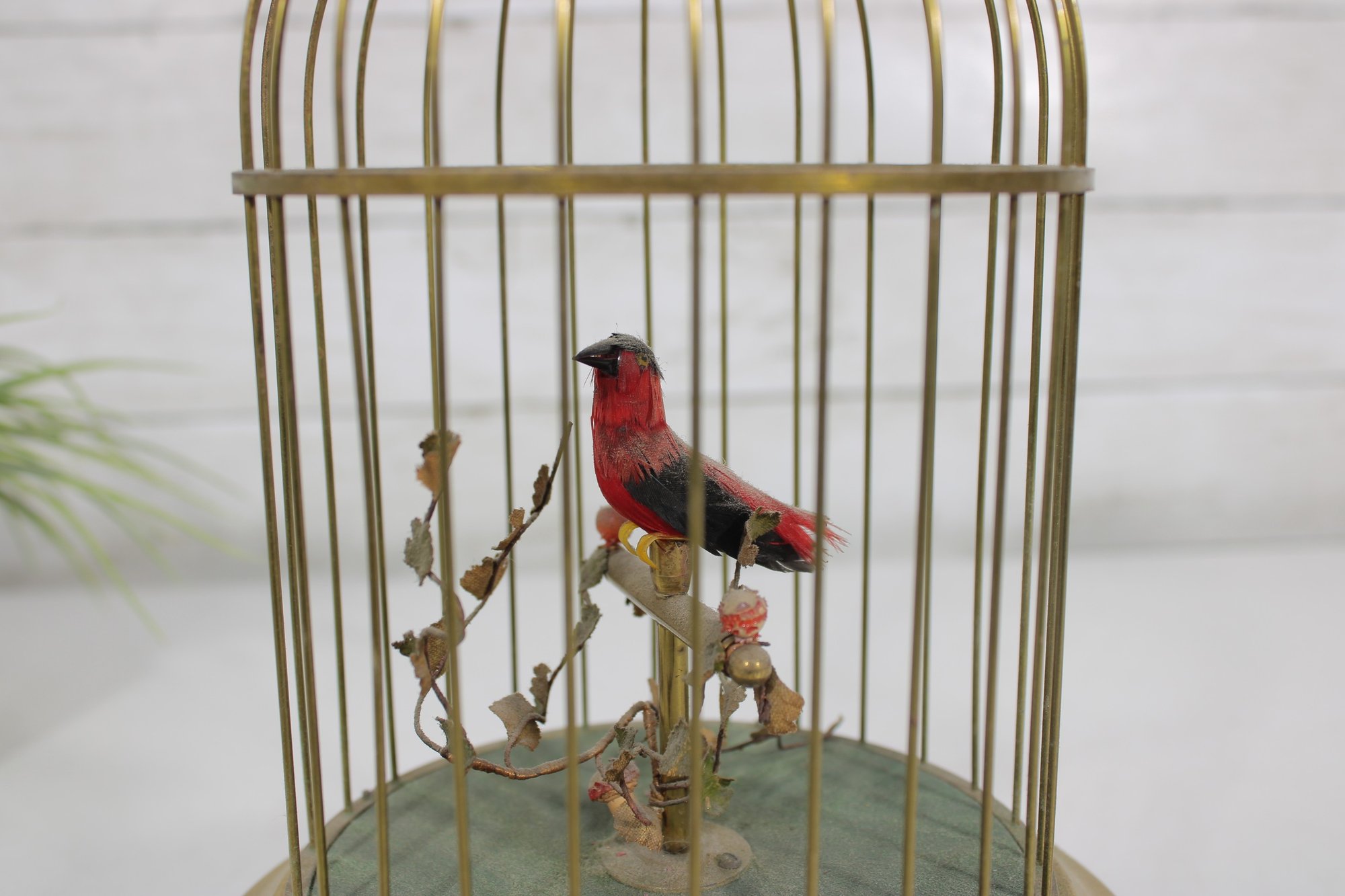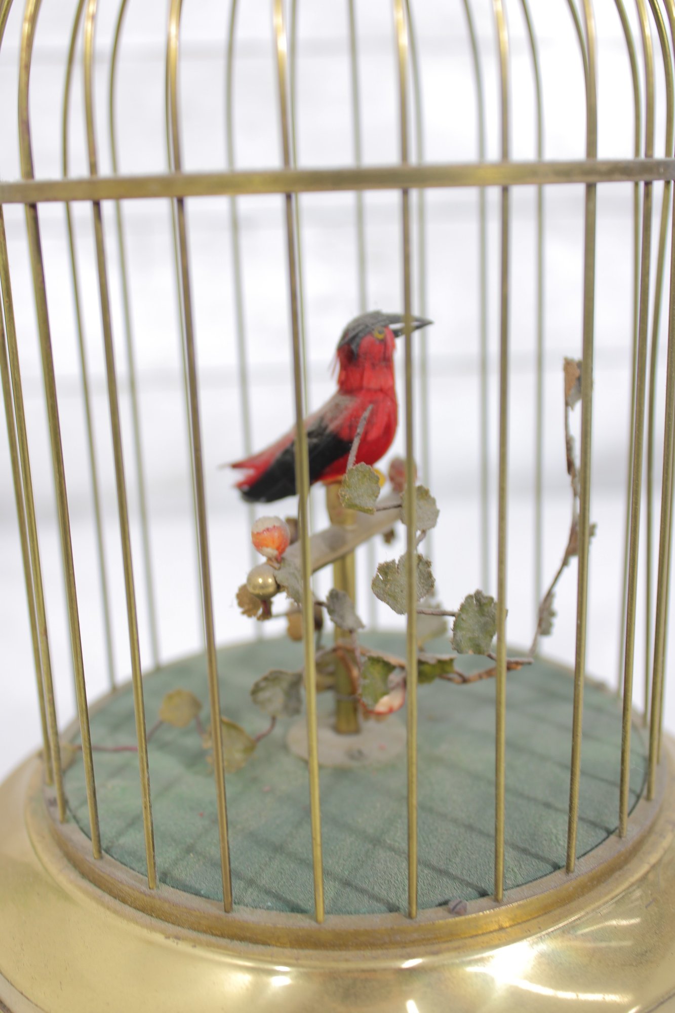 The cage and base have a brass-tone finish with decorative detailing, and the bird features vibrant red and black coloring. The bird sits on a branch with small decorative leaves, adding to the lifelike appearance of the display.